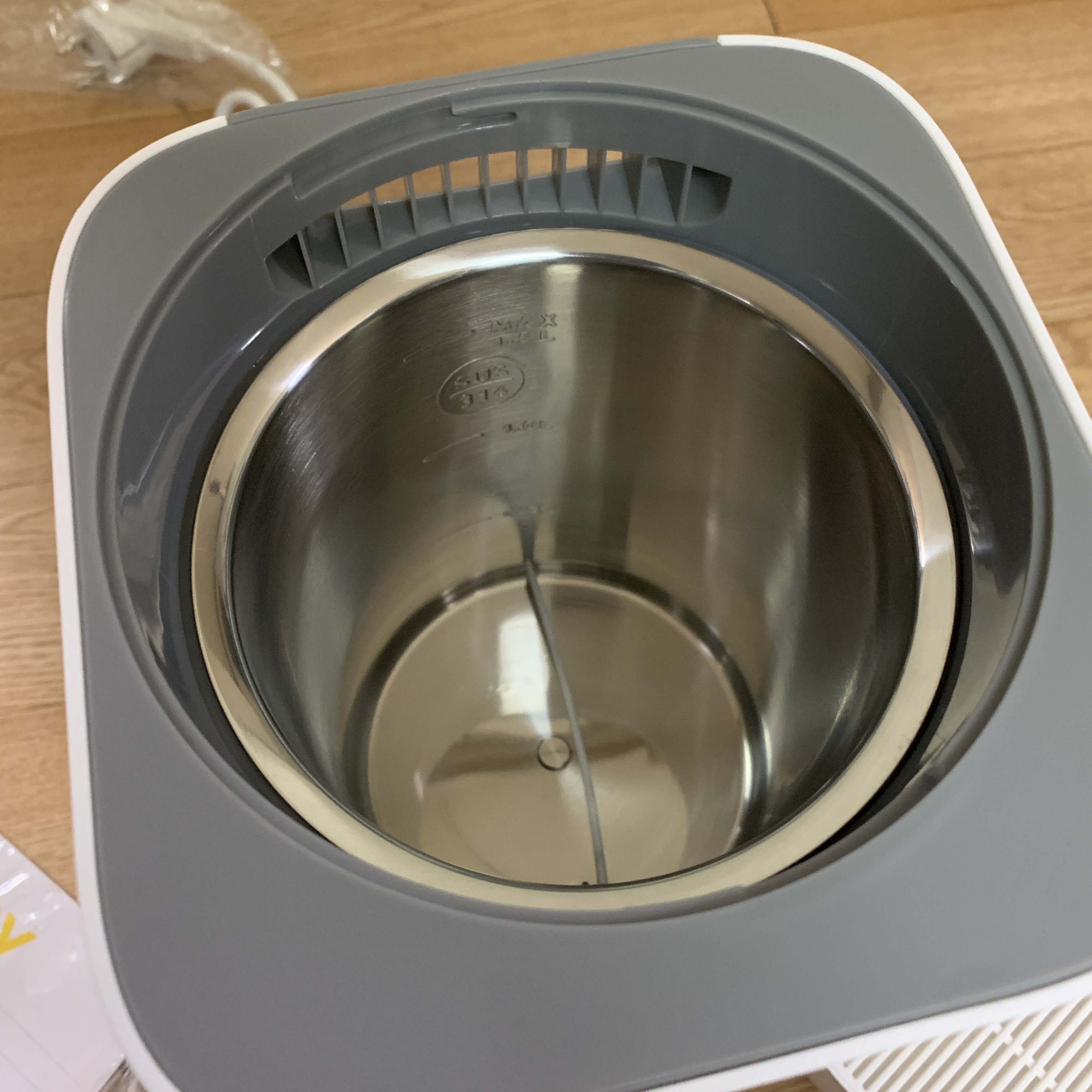 물받이가 별도로 있로 있다. 물통은 스테인리스로 되어있고, 끓이기 기능 사용시 수증기 나오는 부분이 쪽에 위치해있다.