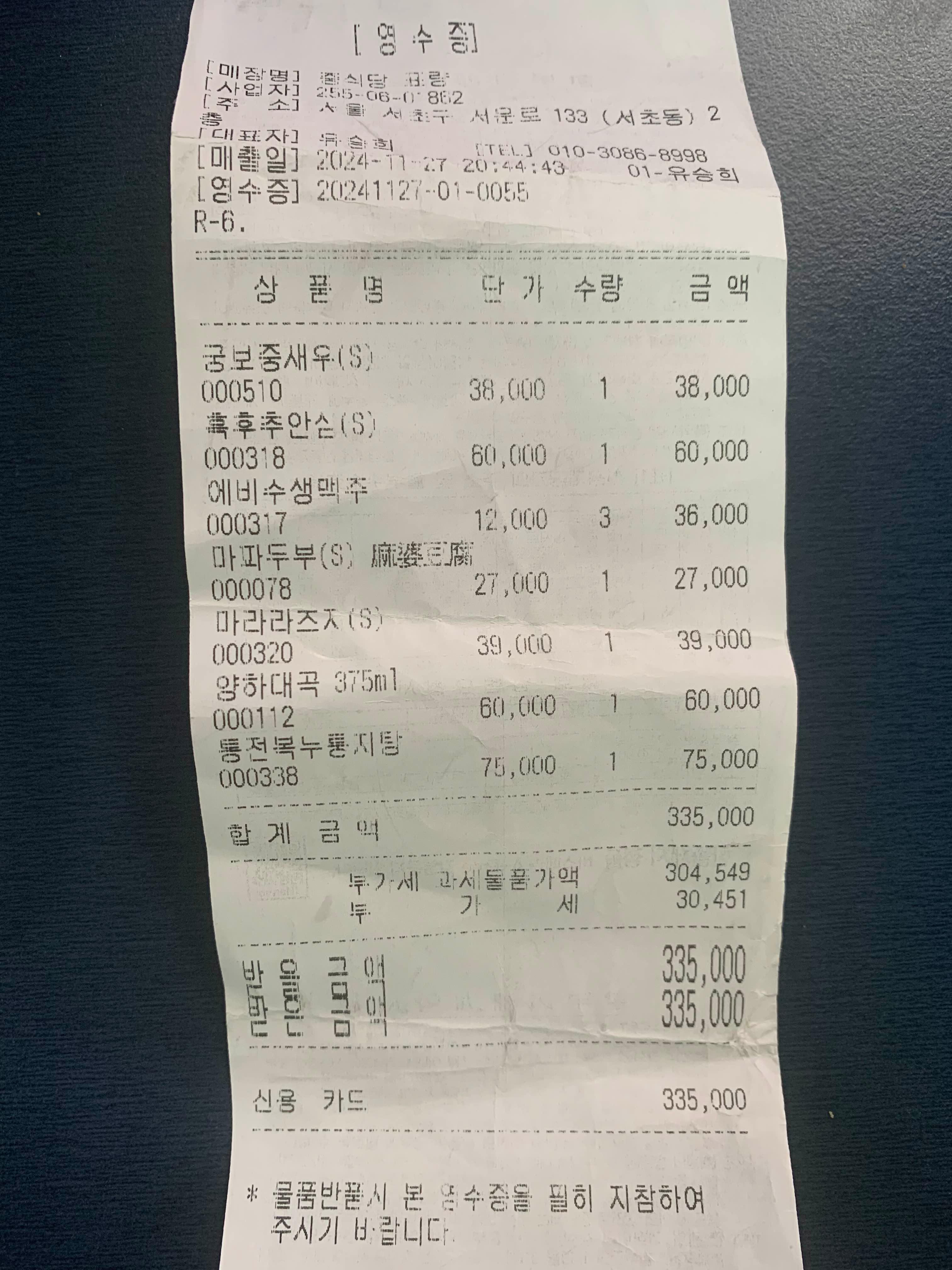 내부 사진은 안 찍었지만, 입구 쪽에 홀이 있고, 좌측으로 들어가면 룸들이 있다. 인테리어는 전반적으로 고급적이고 손님들도 어느 정도 분위기 있는 모습이었다. 눈이 많이 왔던 날 퇴근하고 첫째와 눈사람 만들어주고 옷이 젖어 운동복으로 갈아입고 나왔는데 나만 운동복이었다.