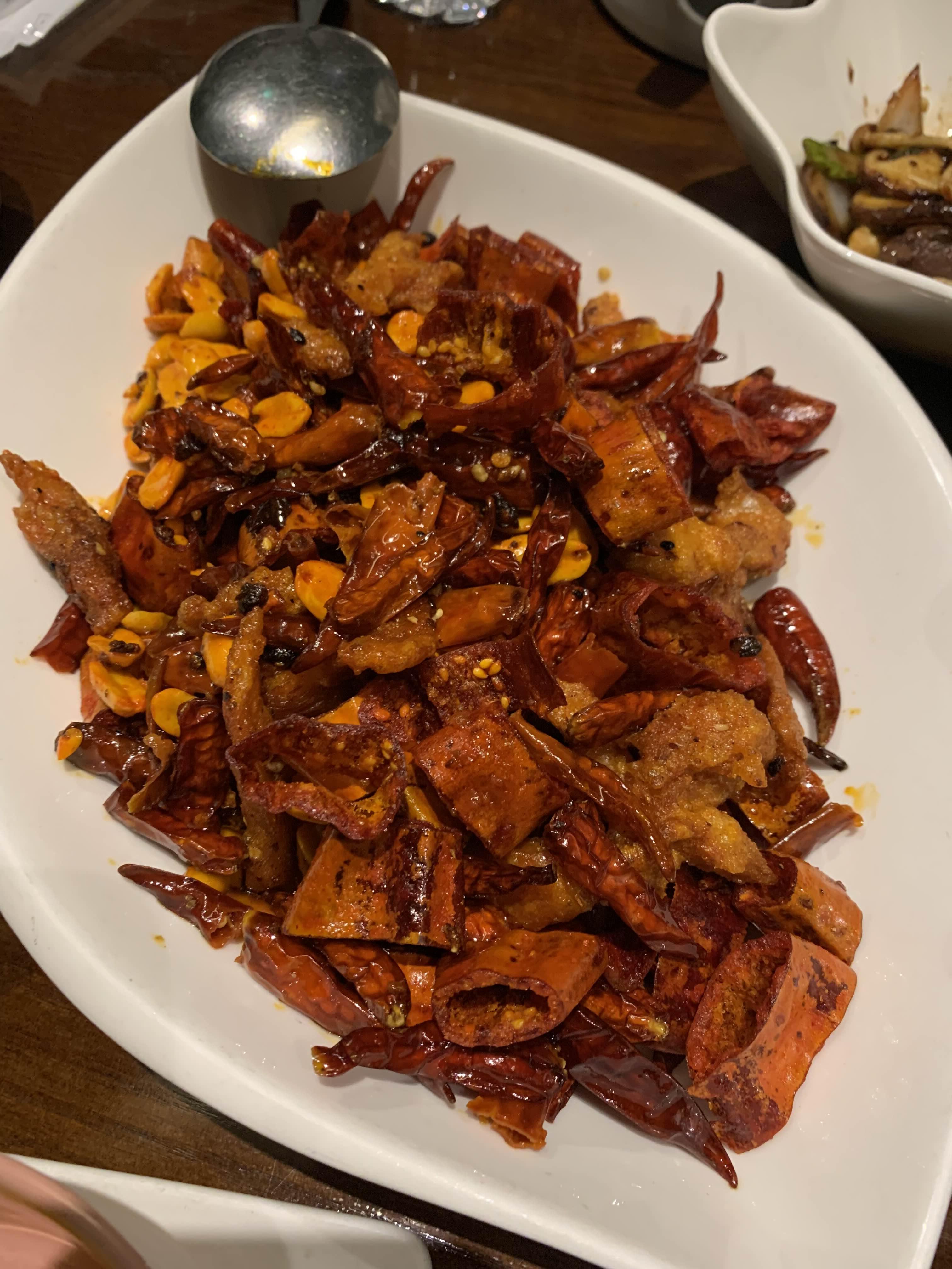닭날개를 큰 고추, 작은 고추와 함께 볶은 요리다. 작은 고추는 먹으면 많이 매우니 디피용으로 생각하면 되고, 큰 고추는 같이 먹으면 아삭거리는 식감과 적당한 매운맛을 함께 느낄 수 있다.