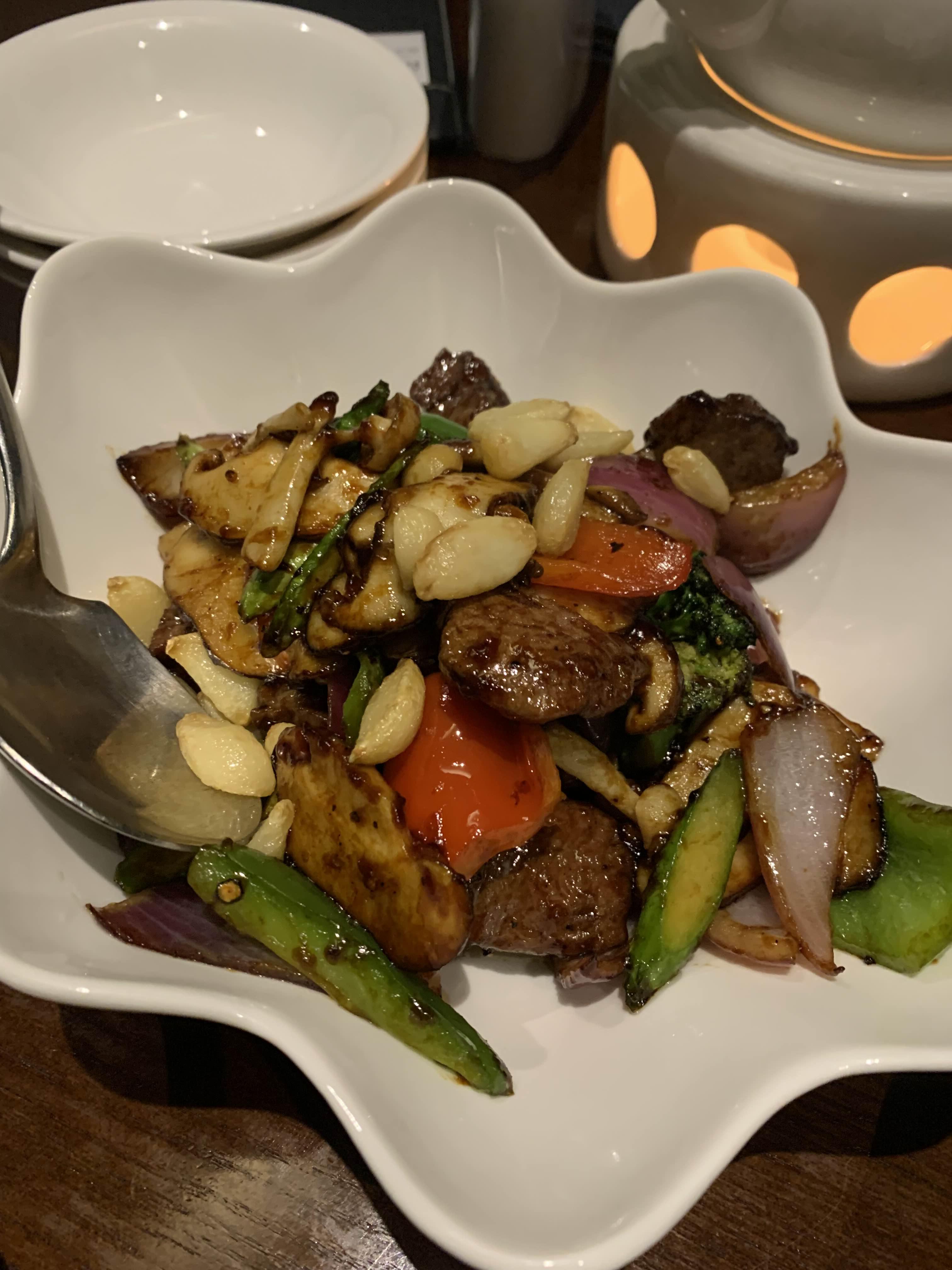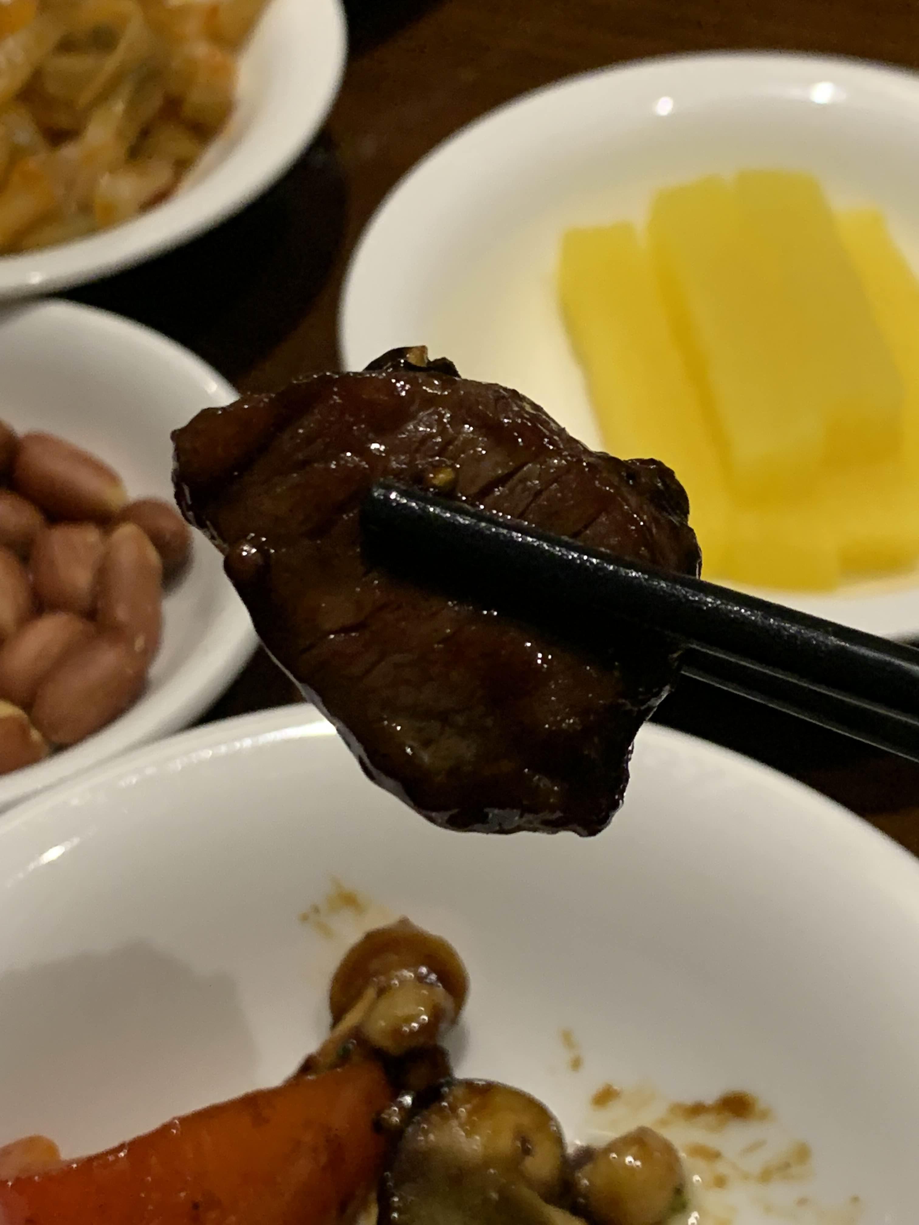 미디엄레어 흑후추안심 한 점을 먹어보니 생각했던 것보다 맛있었다. 겉모습만 보고 그냥 중국식 소스로 버무려진 소고기요리 정도로만 생각했는데 익힘 정도와 식감이 좋아서 놀랐다. 흑후추안심이라 흑후추가 통으로 들어가져 통째로 씹히는 맛도 좋았고, 그리고 한참 있다가 식은 다음에 먹어도 식감과 맛이 유지되어서 좋았다.
