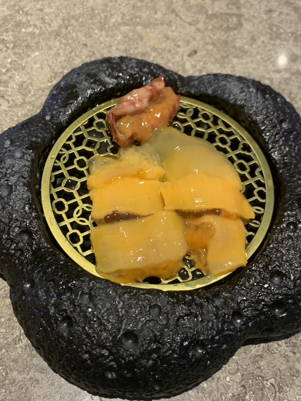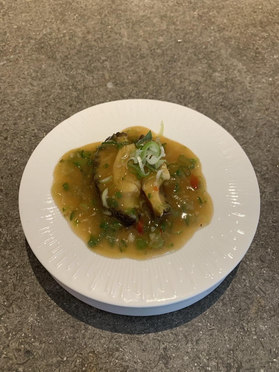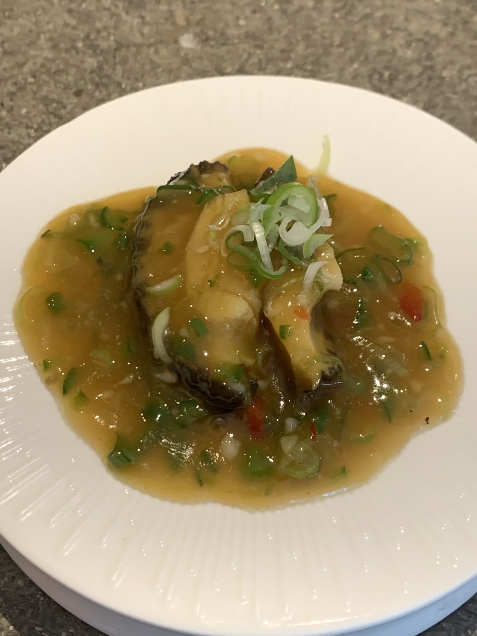다음은 활전복. 전복 크기가 손바닥만 했고 1인당 1마리씩 주어진다. 손수 만든 소스와 함께 먹으면 된다. 소스가 맛있어서 숟가락으로 긁어 남김없이 먹었다.