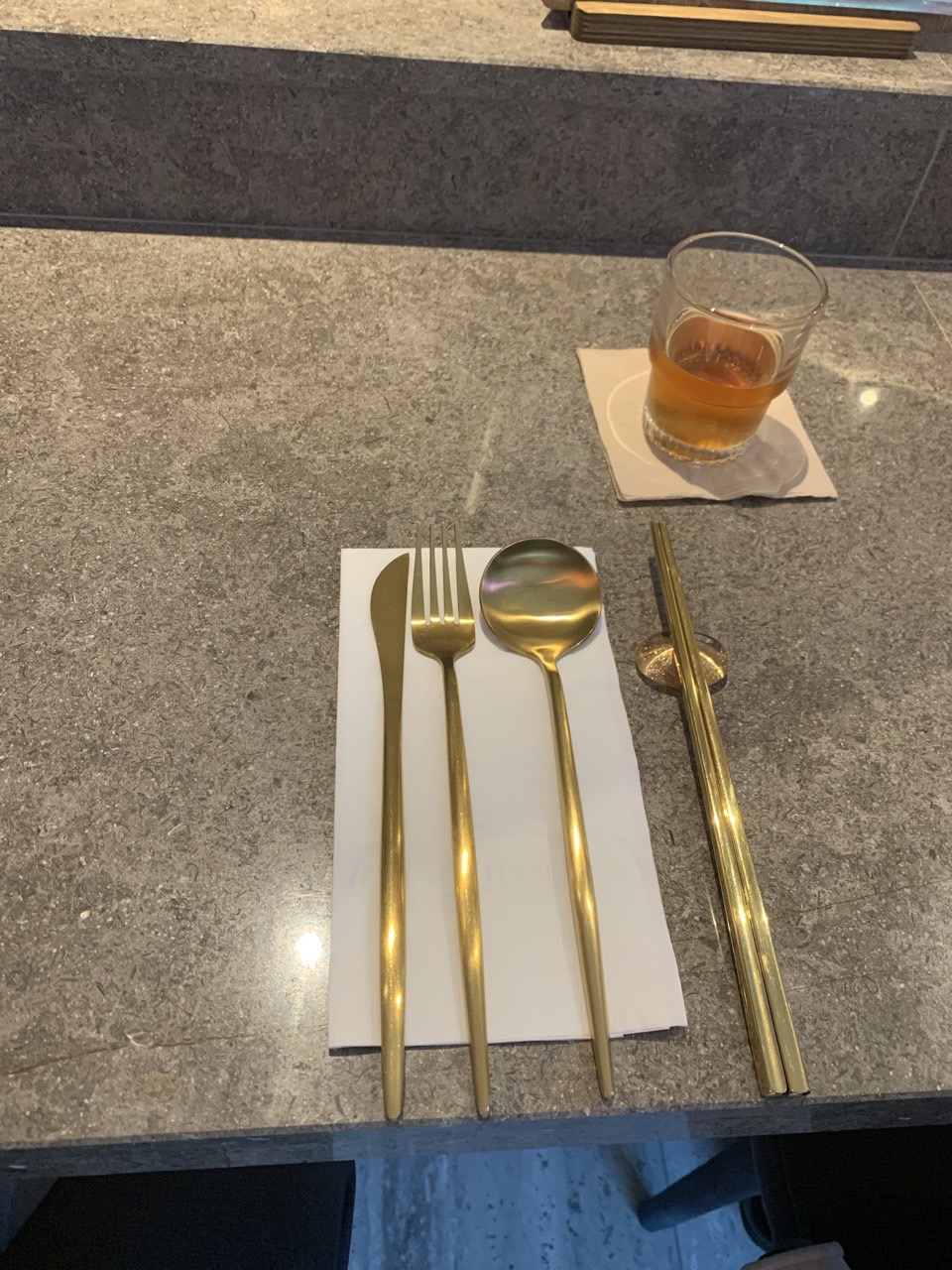 기본세팅이다. 중식이라 포크와 나이프까지 섬세한 세팅. 무언가 썰어먹을게 나오는가 보다.