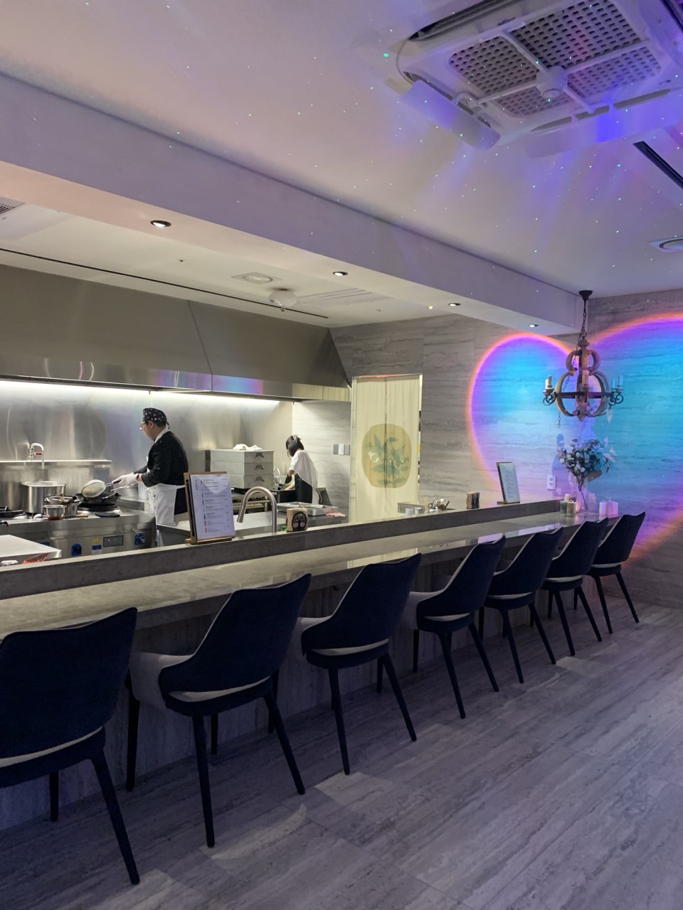 식당 내부. 중식인데 닷지인 점이 특이하다. 인테리어도 일식 오마카세집이랑 다르게 화려하고, 새로운 느낌이 들어서 괜찮았다. 좌석은 총 14 좌석이고 100% 예약제로 운영이 된다.