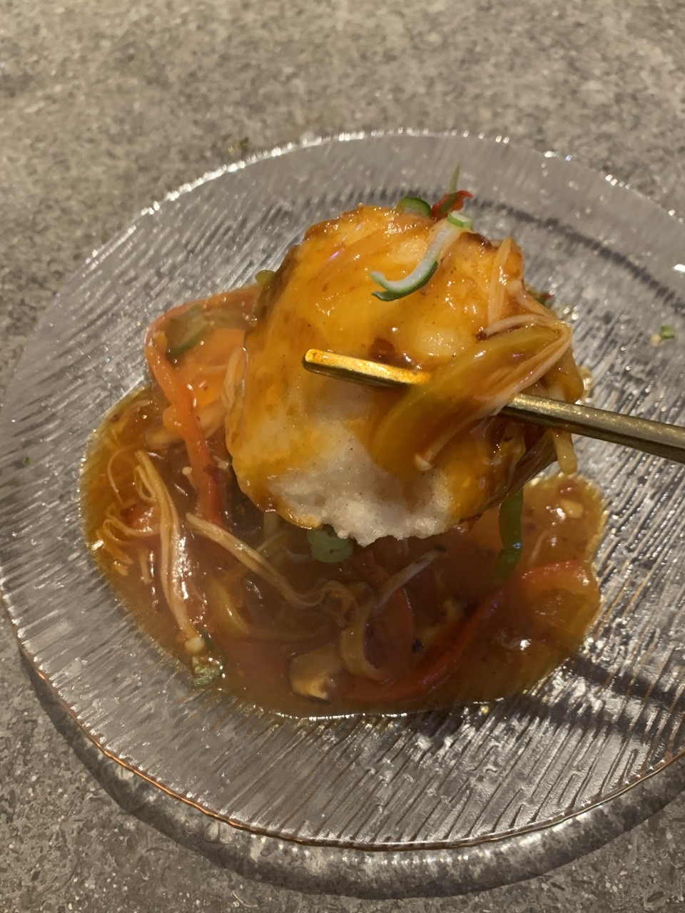 사장님께서 슈슈의 3가지 시그니처메뉴가 있다고 하셨다. 크림새우, 동파육 그리고 하나(까먹음). 세 가지 메뉴는 항상 그대 로고 나머지 메뉴는 장 보러 가는 거에 따라 바뀐다고 한다. 슈슈의 동파육은 매일매일 새로운 고기를 사용한다고 한다. 사장님은 팔선에서 오랫동안 근무하셨다고 했는데 팔선에서조차 동파육의 고기는 한 번에 만들어놓고 냉동 후 그때그때 사용한다고 하지만, 이곳은 소규모로 운영돼서 신선한 고기를 매일 요리해서 사용하신다고 한다. 동파육의 덩어리가 거의 스테이크 한 덩어리라 양이 상당했다. 고기는 포크로 잘라도 잘 잘 릴정도로 부드러웠고, 맛도 좋았다.