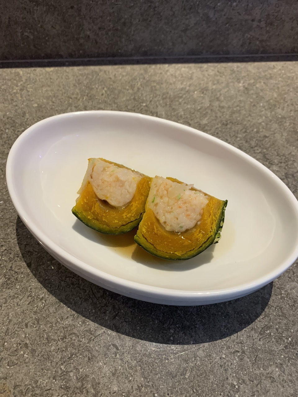 단호박 속에 다진 새우를 넣고 함께 쪘다. 새우의 식감과 달달한 단호박의 식감이 잘 어울렸다.