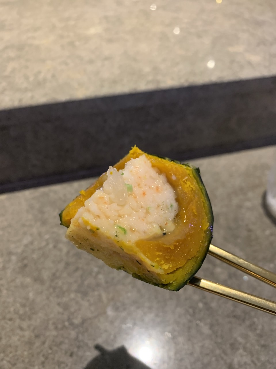 단호박 속에 다진 새우를 넣고 함께 쪘다. 새우의 식감과 달달한 단호박의 식감이 잘 어울렸다.