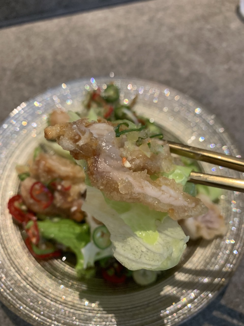 유린기 아래는 양상추가 있고, 위에는 고추로 덮여있다. 튀김 정도는 먹기 좋을 정도로 바삭했고, 고추와 함께 먹으니 느끼한 맛을 잡아주어 좋았다.