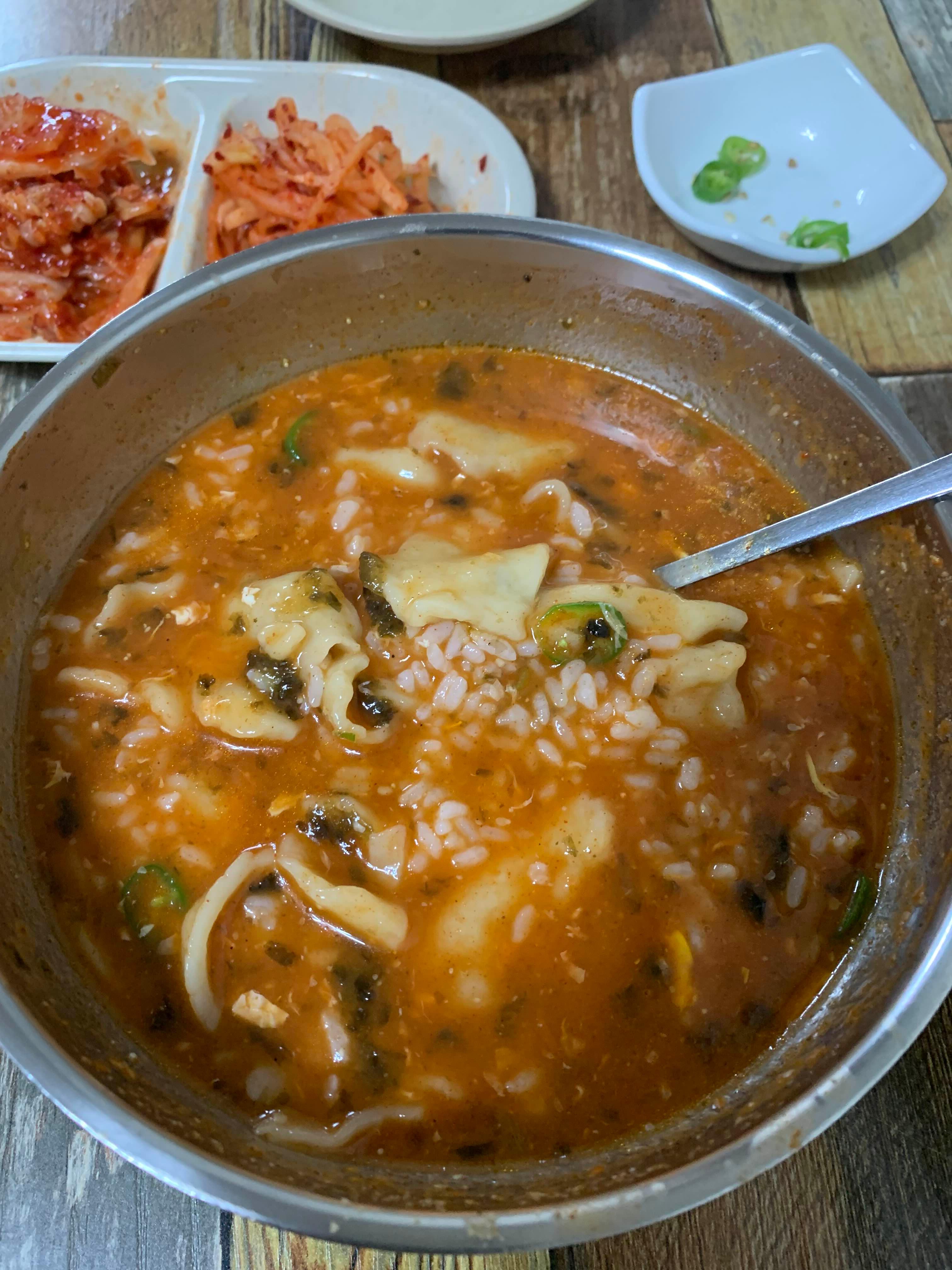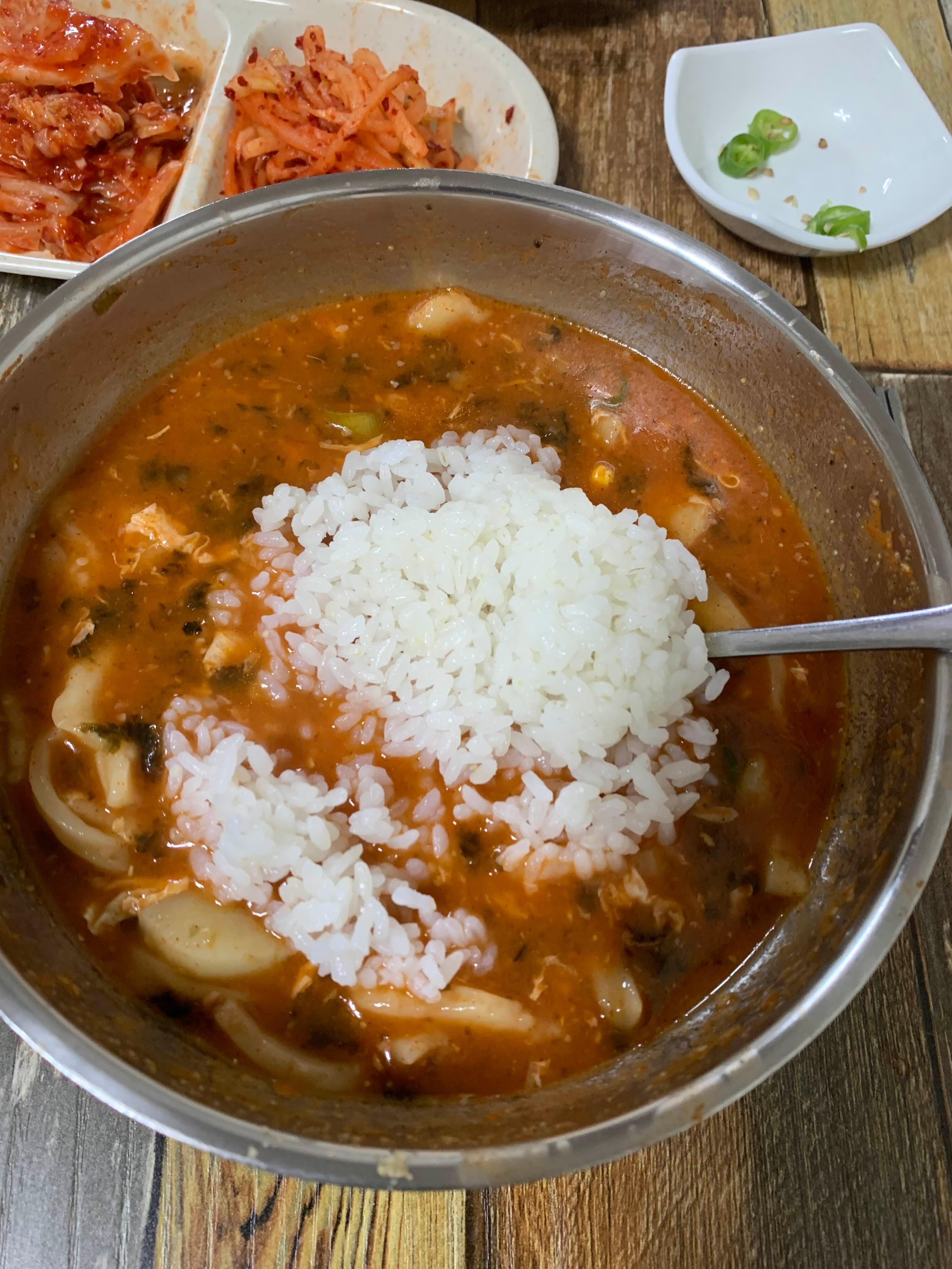 밥은 무료이고 무한리필이다. 다만 칼제비 양이 많기에 어느 정도 먹고 나서 밥 선택하는 걸 추천한다. 밥 투하하고 음미하기.