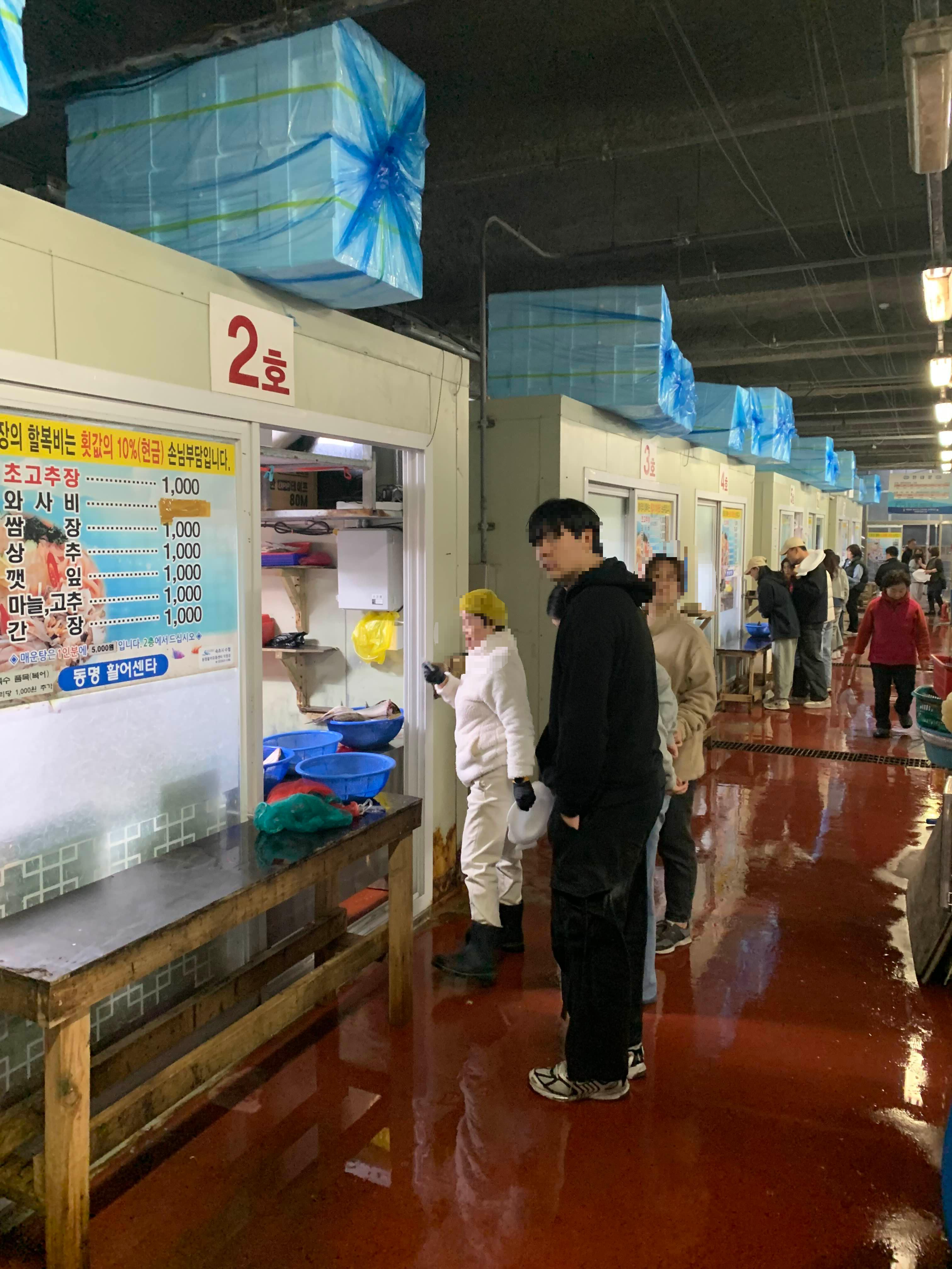 2층에서 먹을 수 있는데 나는 바다 가서 먹을 거라 포장해 달라고 하니 물고기 접시를 준다. 이거 들고 이모가 안내해 주는 손질집으로 가서 횟감 건네주고 번호표 확인하고 나올 때까지 기다리면 된다.
