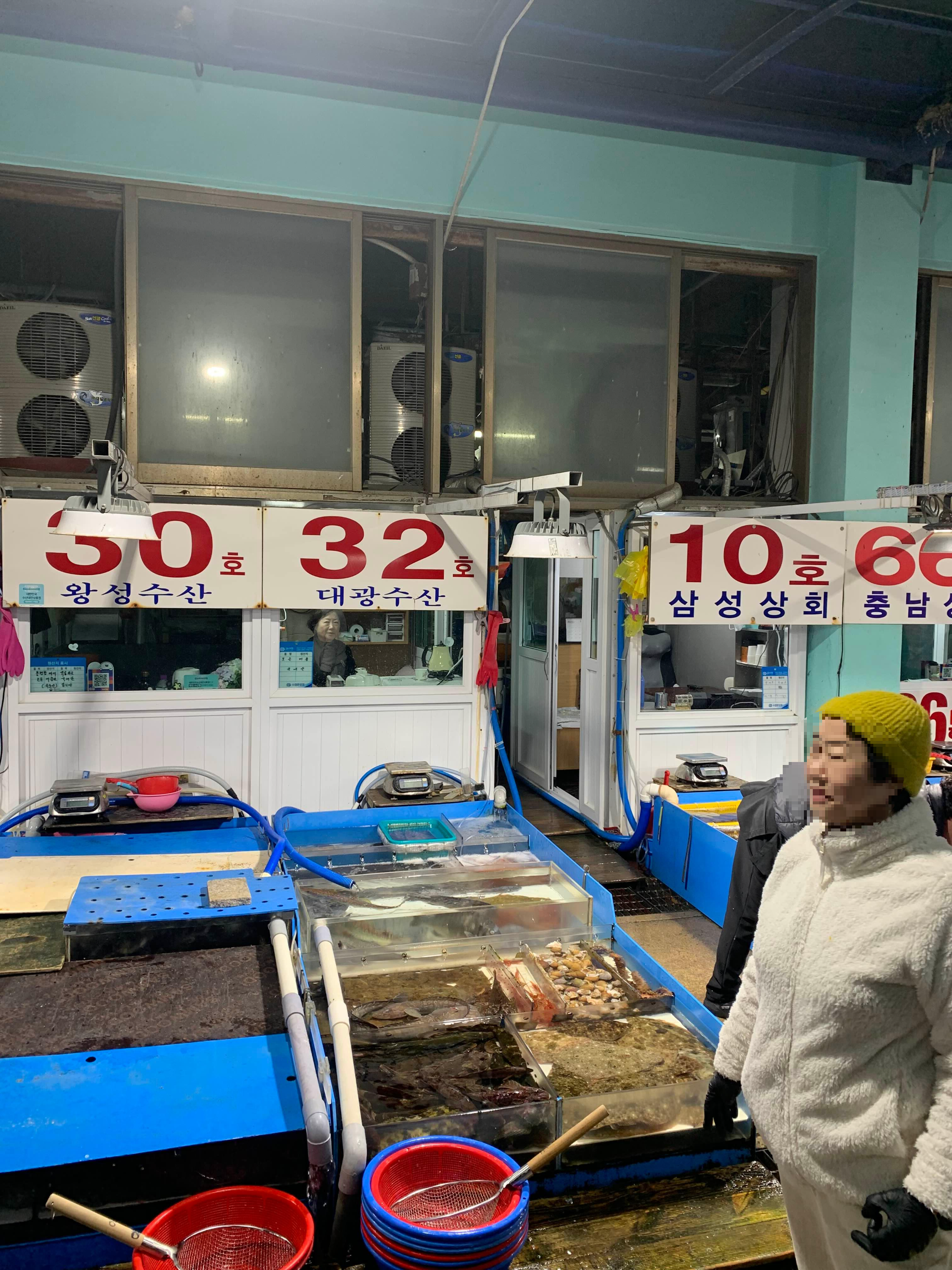 32호 대광수산. 단골도 아니고 처음 방문했는데 깔끔한 수조와 여러 종류 고기들이 있었고 그냥 이모님이랑 대화 몇 마디 하고 마음에 들어서 선택했다. 8시쯤 도착했는데 주말이라 그런지 사람도 많고 아직 모든 가게들이 마감 전이었다. 최소 주문은 3만 원부터다.