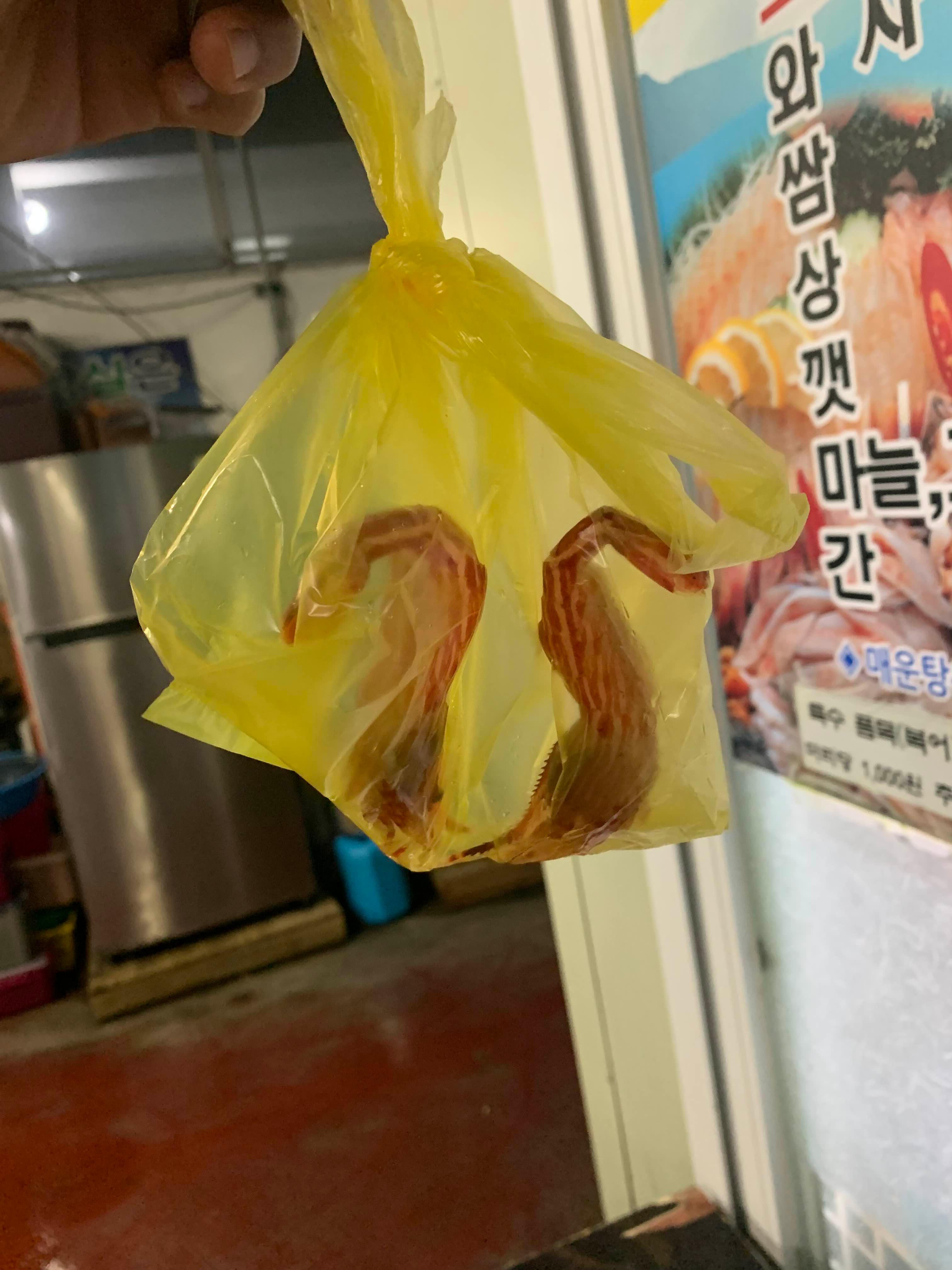 새우는 살아 움직여서 같이 못싸준다며 비닐봉지에 저렇게 준 게 끝이다. 먹는 거 생각 안 하고 그냥 술안주로 적합해서 고른 건데 생으로 까서 먹어야 되고, 이모가 기다리는 동안 새우 한 마리를 가지고 와서 까먹는 방법을 알려주고 먹어보라고 주셨다. 2마리에 만원인데, 1마리를 까서 주니 5천 원 공짜로 먹은 셈이다. 인심 좋은 동명항 32호 대광수산!