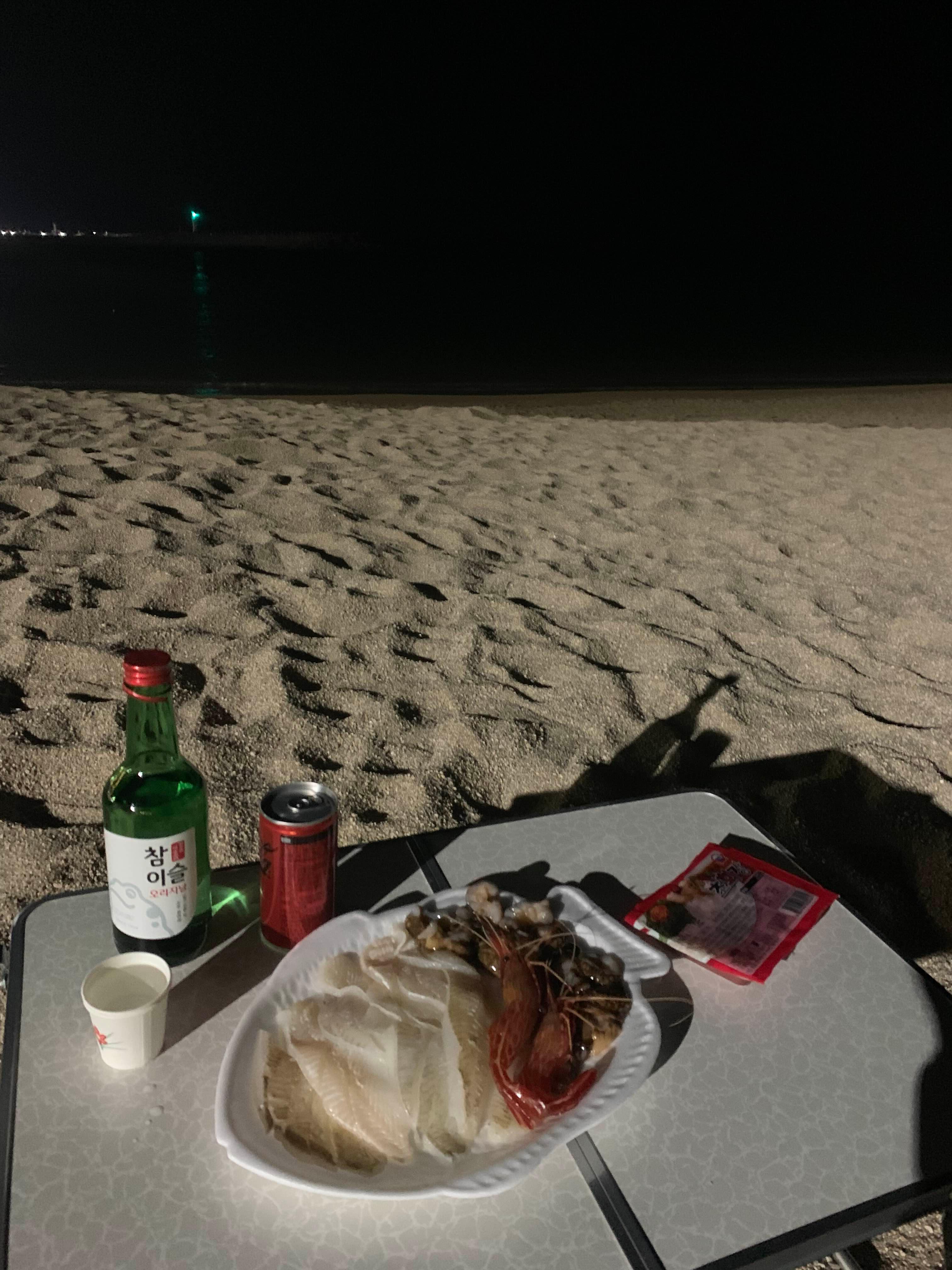 직접 골라서 사온 횟감을 모래사장 위에 차리고 한잔. 바람이 많이 불었지만 분위기 자체만으로 만족스러웠다. 해삼은 손질할 때 많이 헹구질 않아서 그런지 비린맛이 났다. 그래도 큼직하게 썰어줬고 이분위기에서 그마저 좋았다.