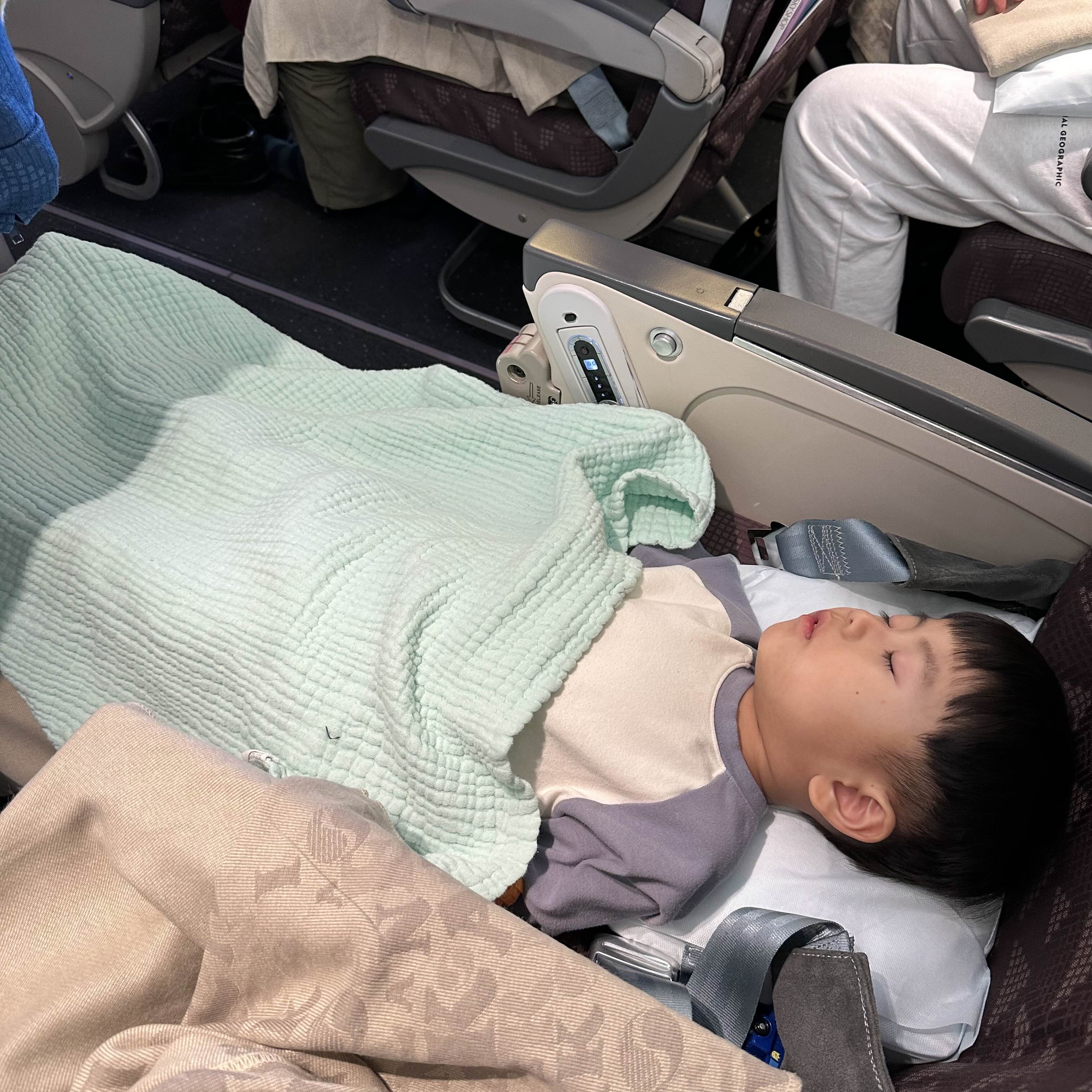 첫째가 걱정돼서 에어쿠션 두 개로 침대를 만들어줬는데, 이륙 후 알게 되었다. 안전상의 이유로 에어쿠션은 사용하면 안 된다고..