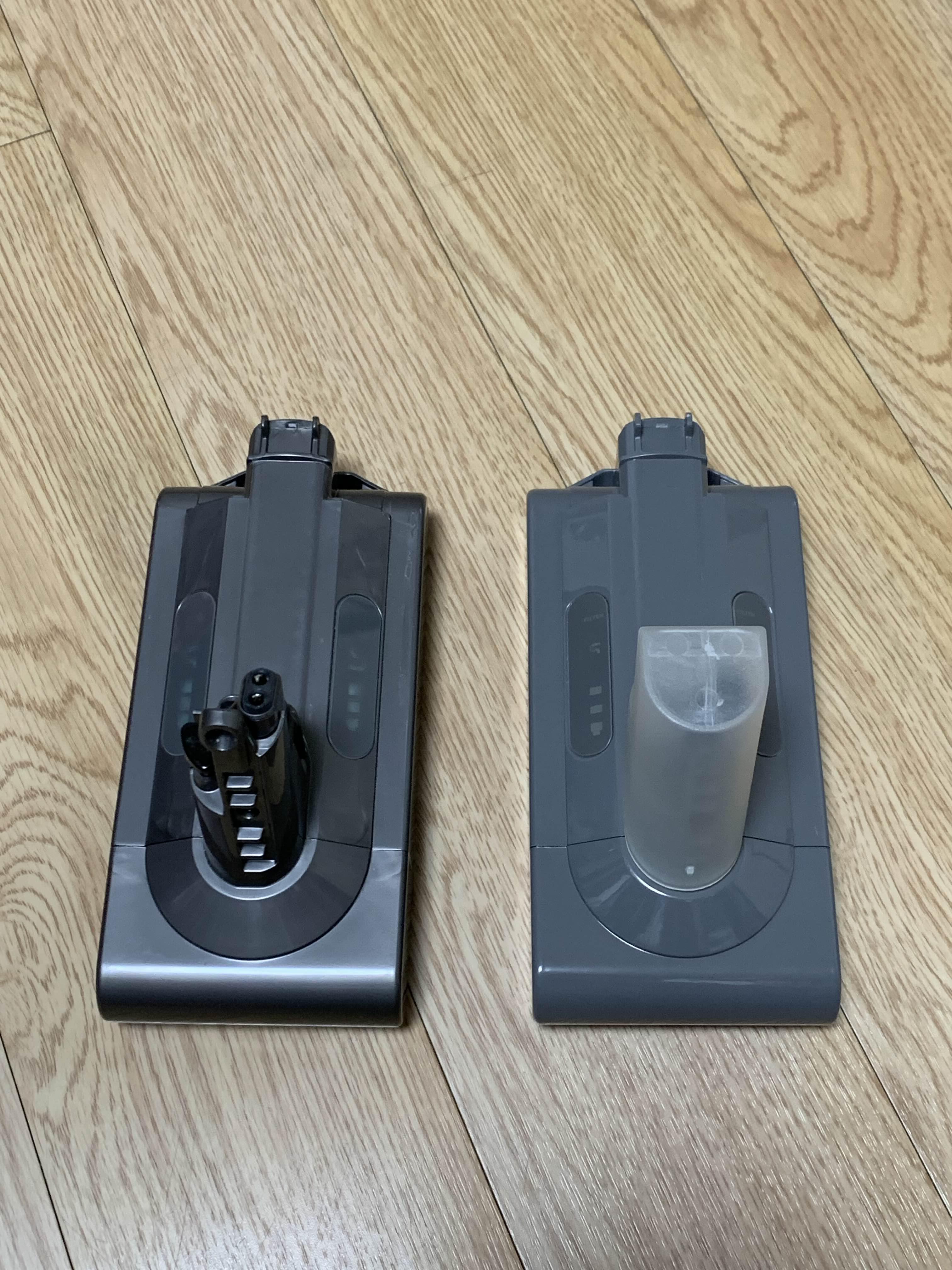 왼쪽이 정품, 오른쪽이 헝그리 배터리. 다이슨 정품 색상이 조금 더 진하다.