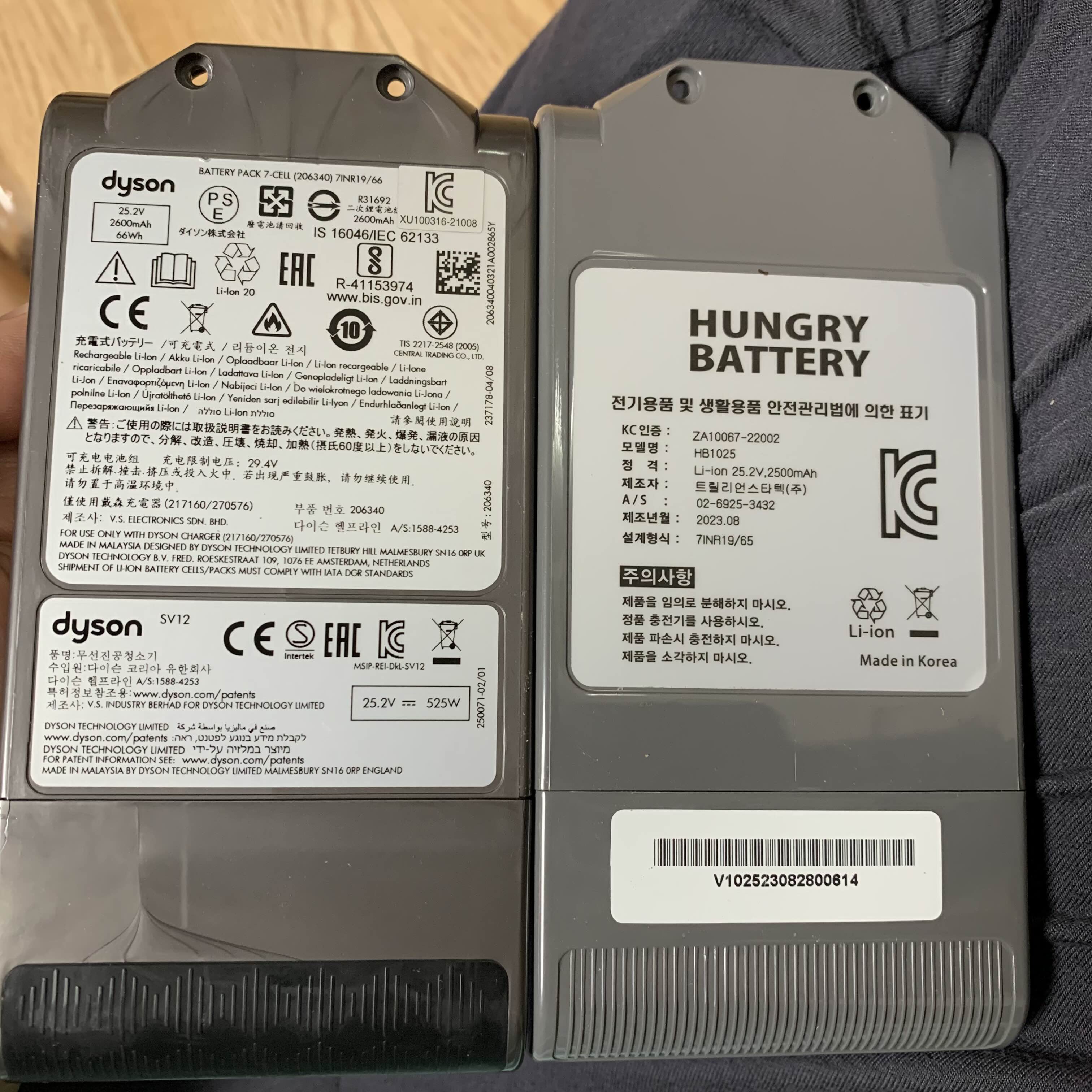 왼쪽이 정품, 오른쪽이 헝그리 배터리. 다이슨 정품 색상이 조금 더 진하다.