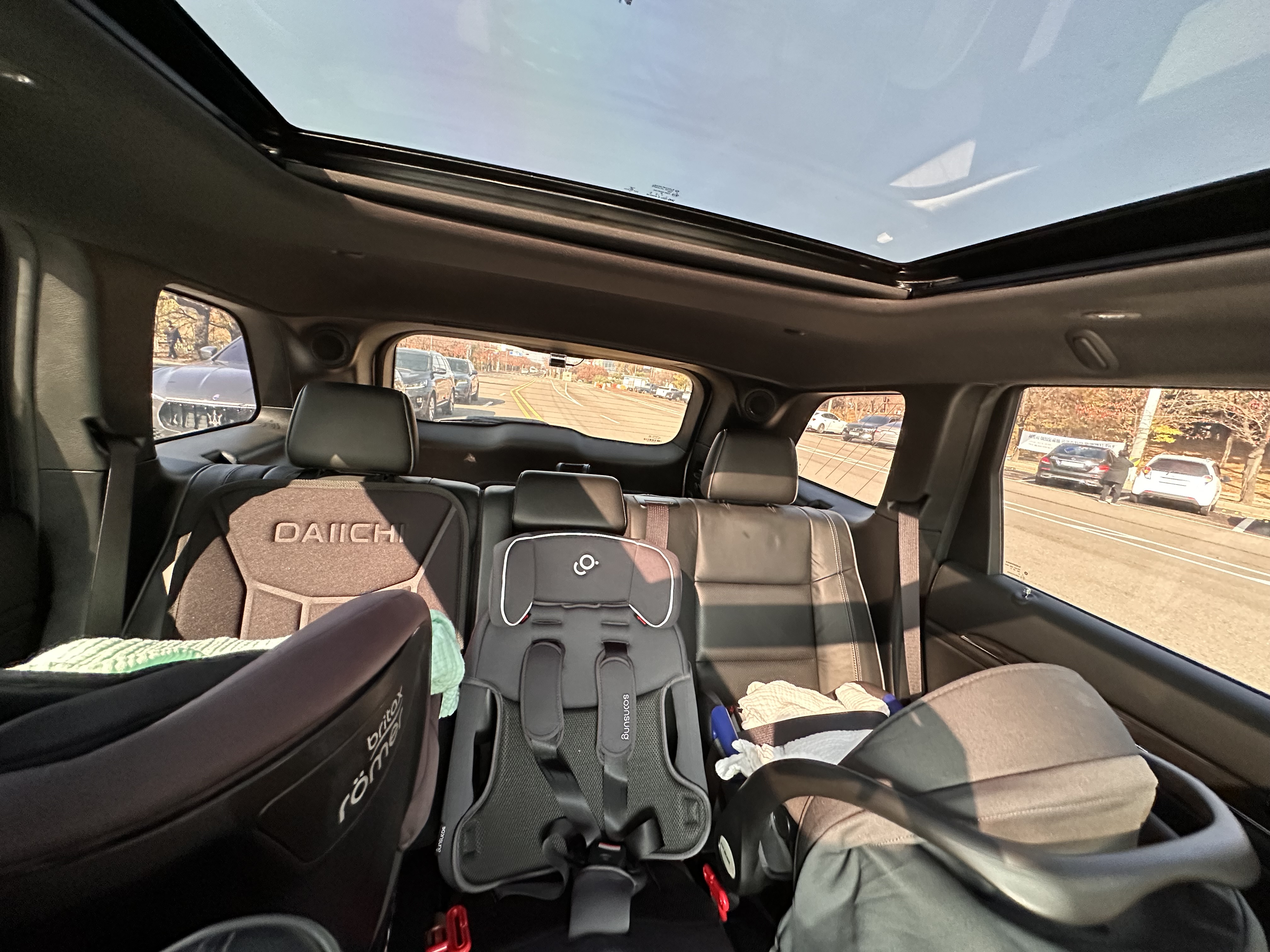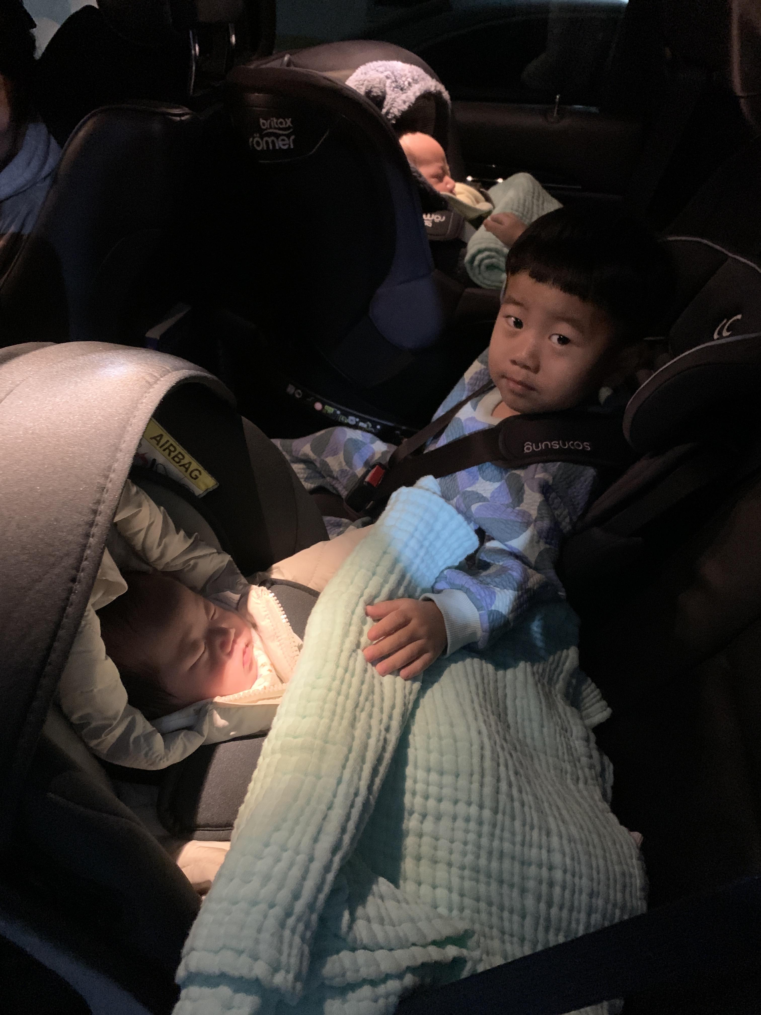 첫 번째 카시트는 브라이텍스는 첫째 때부터 쓰던 거라 쭉 쓰고, 바구니 카시트는 신생아를 위한 목적이다. 가끔 엄마가 뒤에 탈 경우도 생겨서 앞 좌석 카시트를 설치할 수 있는 바구니 카시트를 구매했다. 그리고 마지막으로 중앙 부분에 아이소픽스 없이 사용할 수 있는 빌리 카시트. '양쪽 신생아, 중앙 주니어' 좌석 구성으로 착용한 모습이다. 차량은 19년식 그랜드 체로키다.