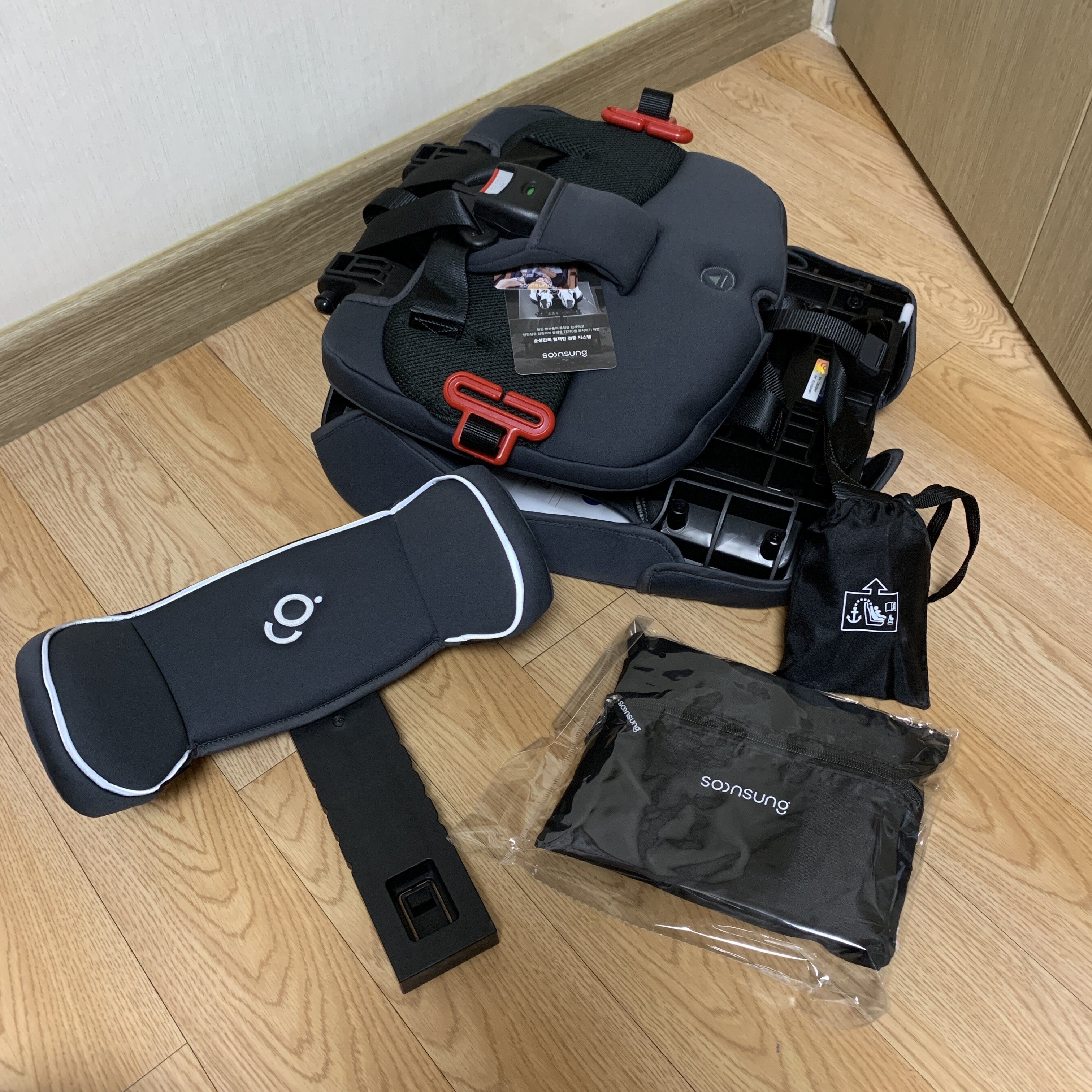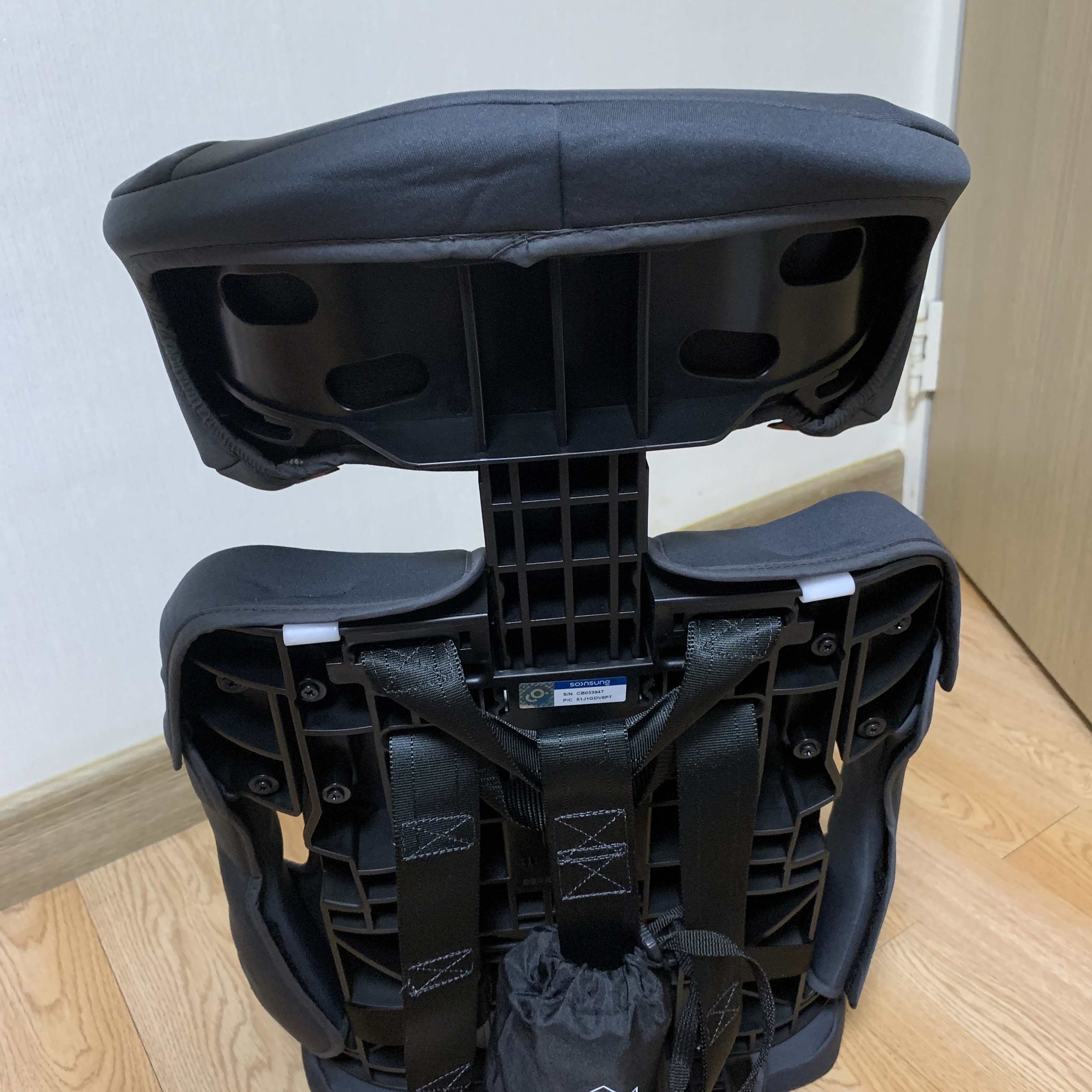 뽁뽁이를 떼어내면 카시트가 나온다. 기본 구성품은 본체, 헤드레스트, 가방. 이렇게 3가지로 심플하게 구성되어있다.