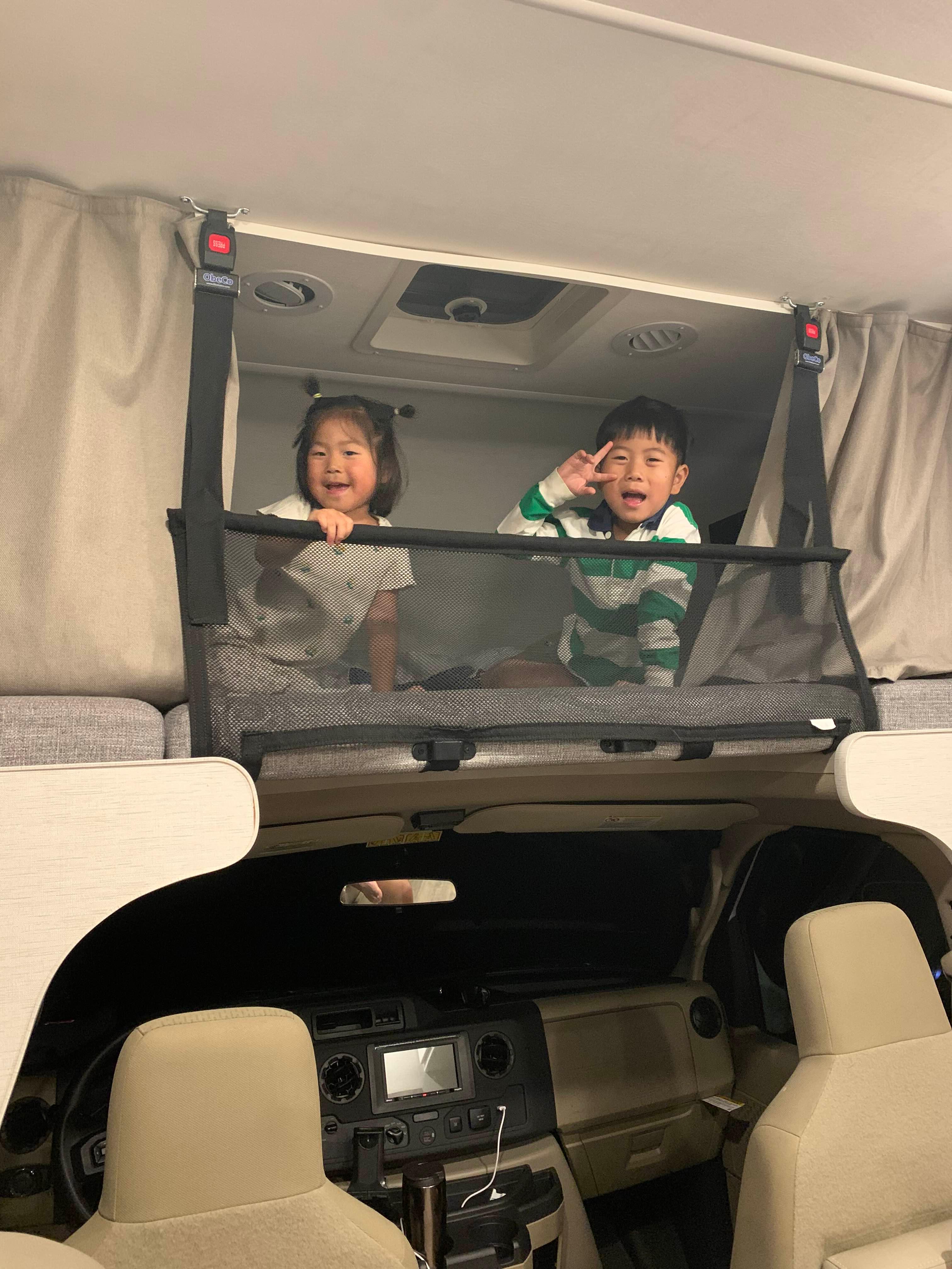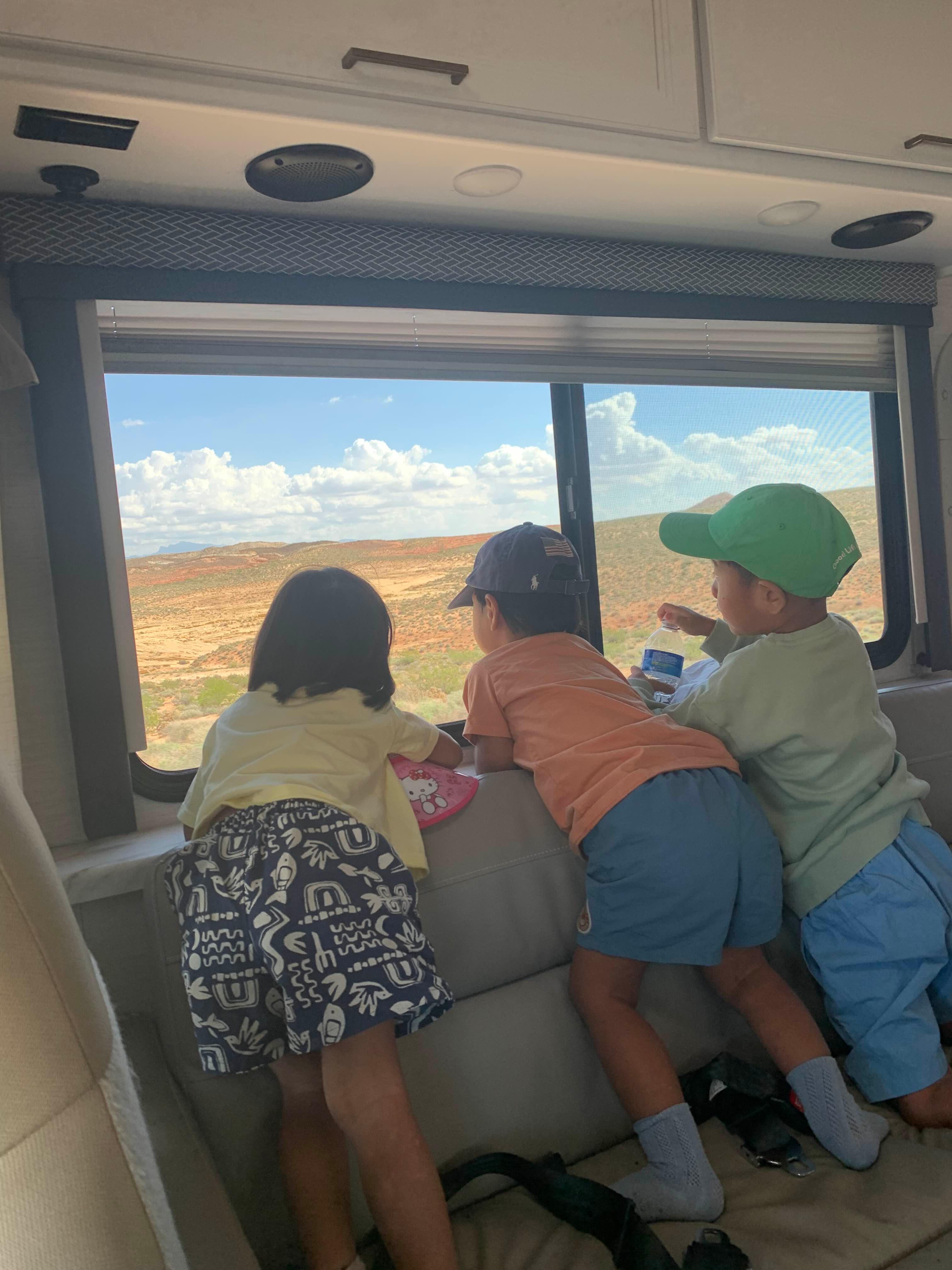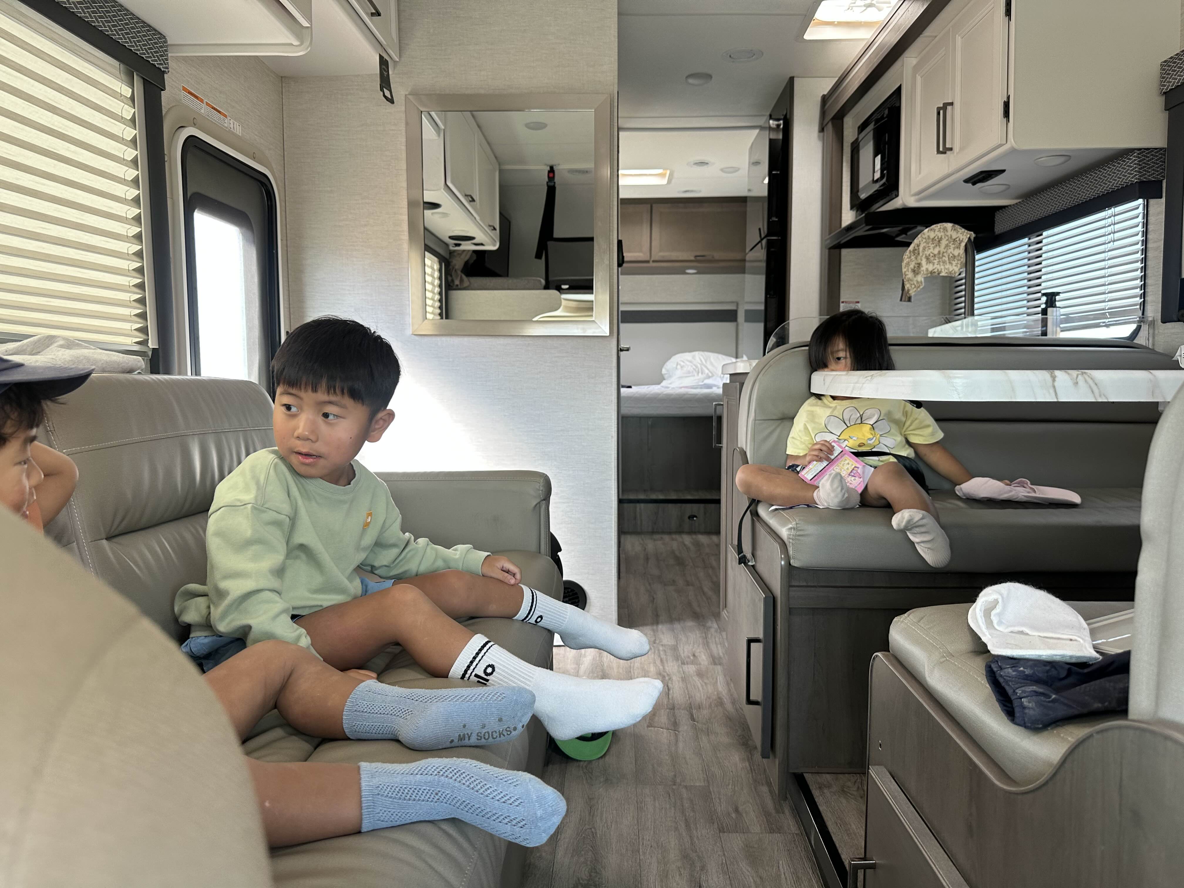 차에서 놀다가 바깥풍경 구경하기를 무한반복 중인 아이들. 아이들이 RV를 타면 좋아하길 바랐는데, 정말 좋아해서 다행이다.