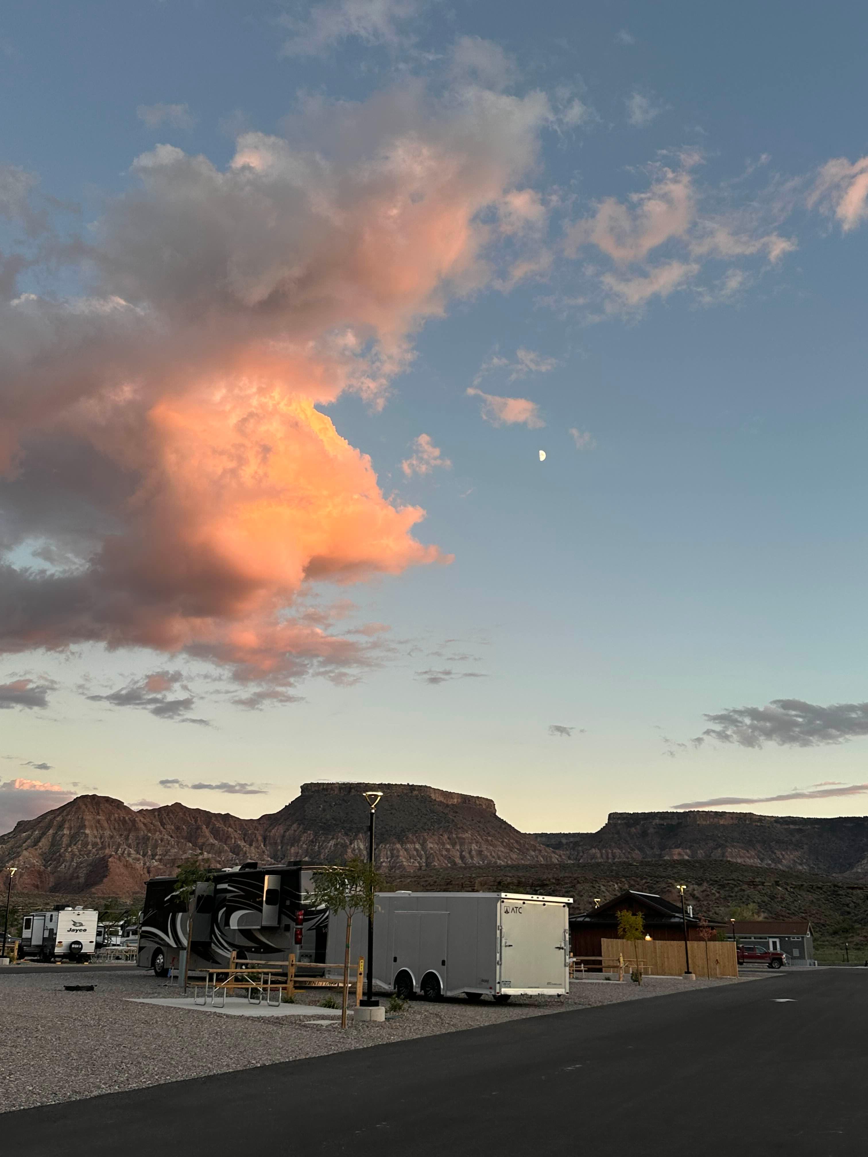 해가 지기 시작하면 캠핑장은 또 다른 분위기로 바뀐다. 붉은 절벽이 주황빛으로 물들고 하늘은 서서히 보랏빛으로 변해간다. 별이 하나둘 보이기 시작할 즈음, 자이언 캐년에서의 밤은 그렇게 조용히 깊어졌다.