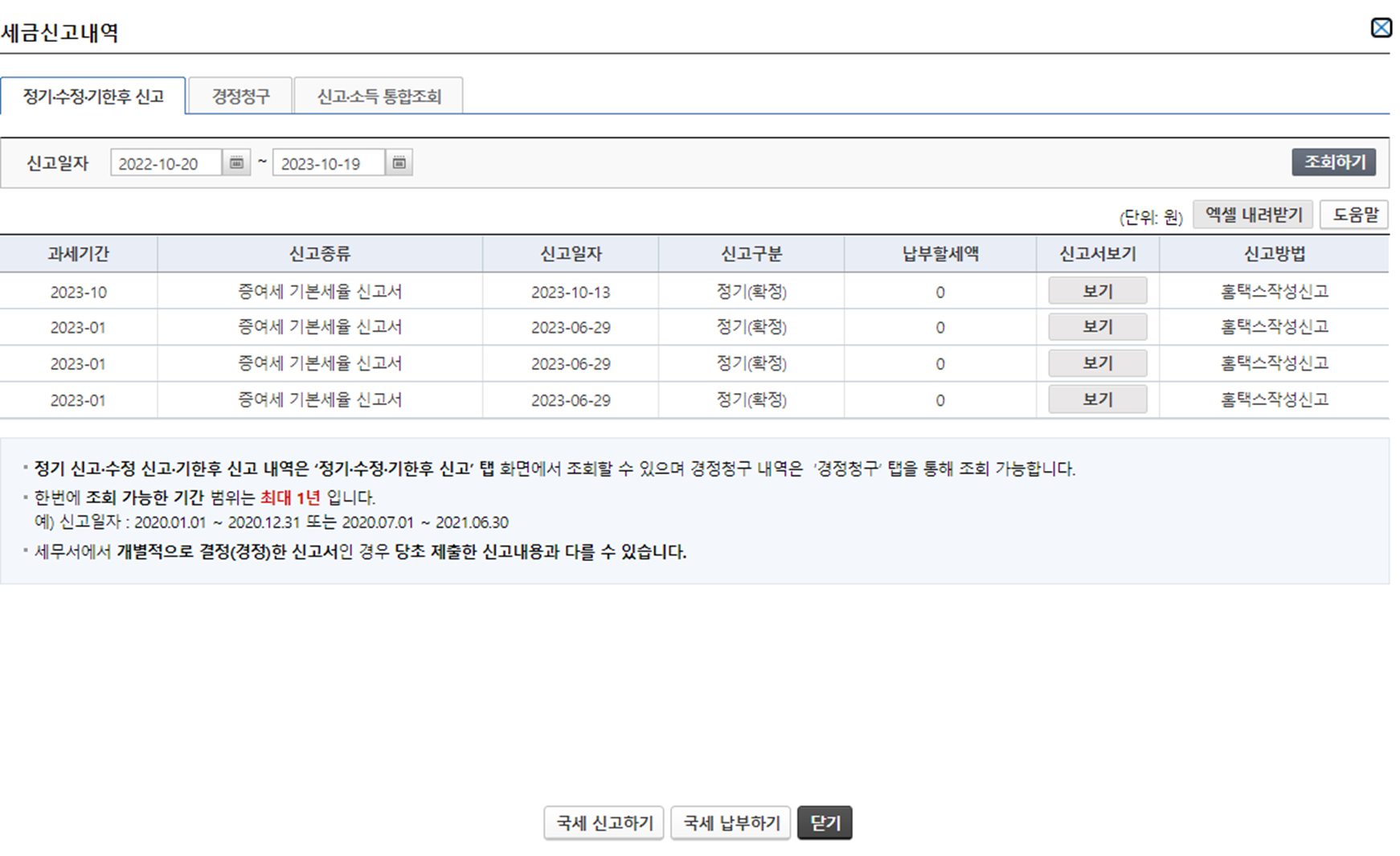 이렇게 세금신고내역에 뜨면 신고가 제대로 이루어진 게 맞다. 신고서 출력도 가능하니 필요시 인쇄하면 된다.