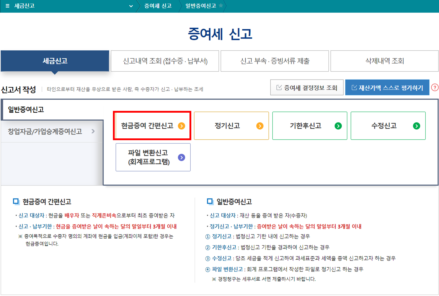 일반증여신고 시 5가지의 종류가 있는데 간단하게 현금증여를 했기에 현금증여 간편 신고로 들어가면 된다. 신고대상자는 증여를 받은 사람이다(현금을 배우자 또는 직계존비속으로부터 최초 증여받은 자). 신고 및 납부기한은 현금을 증여받은 날이 속하는 달의 말일부터 3개월 이내로 진행하면 된다.