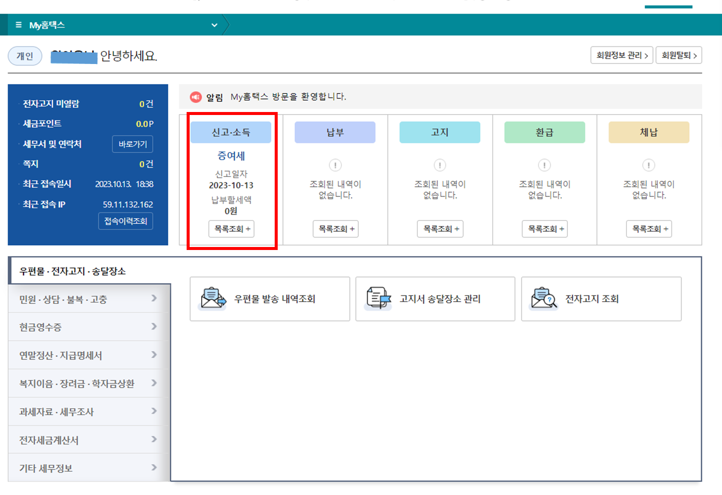 마이홈택스 화면으로 들어오면 신고, 소득 신고내역 확인이 가능하다.