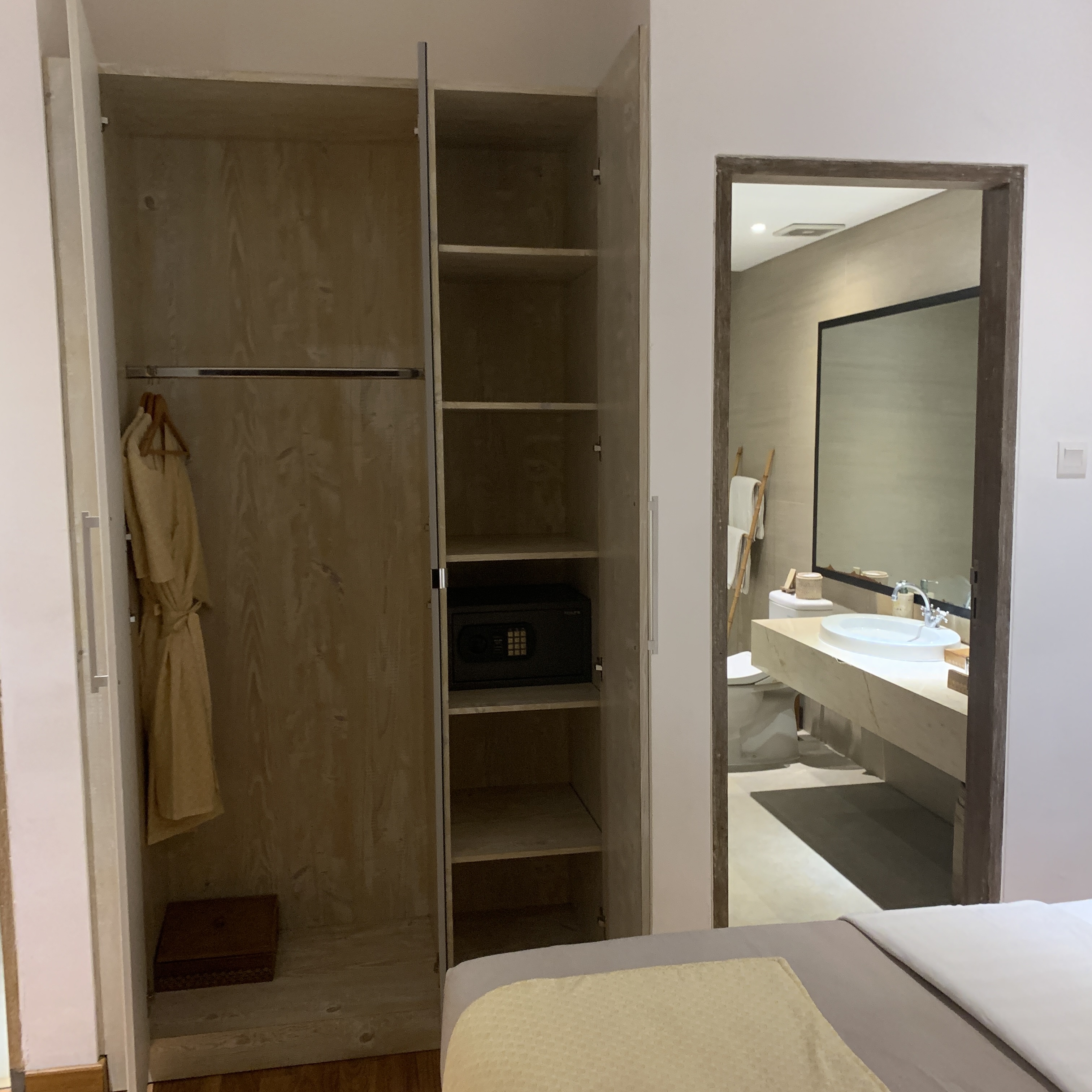 금고도 있고, 목욕 가운도 있다. 욕실은 샤워실 쪽 천장을 아크릴 소재로 덮어놨는지, 낮에는 자연 채광이 된다.