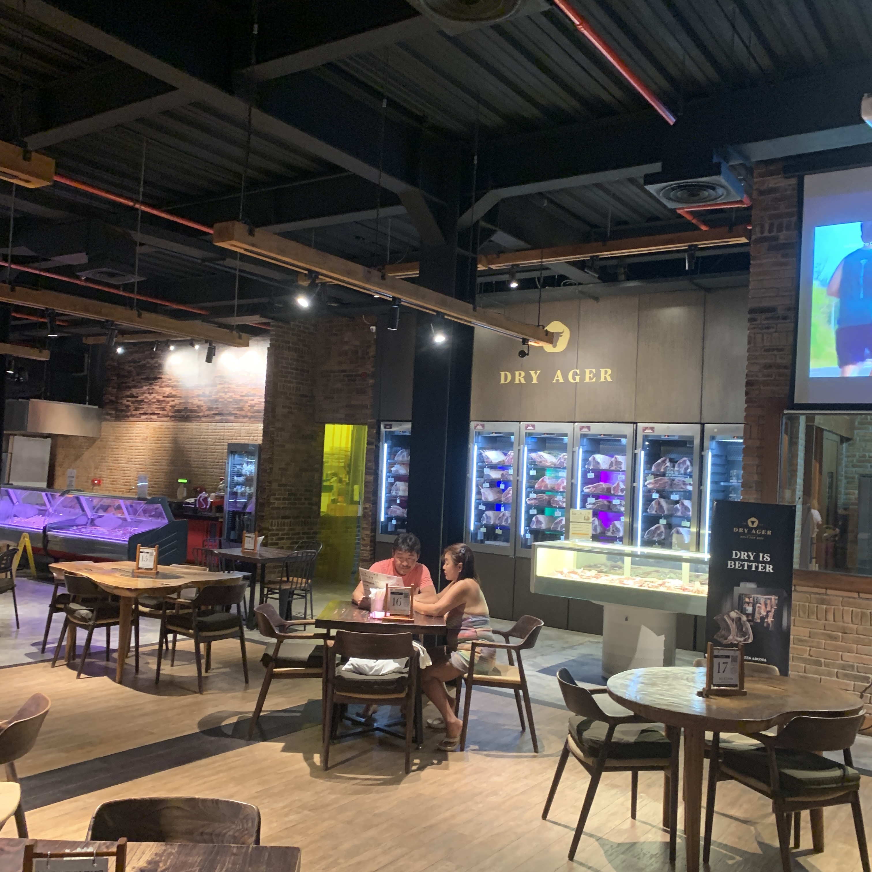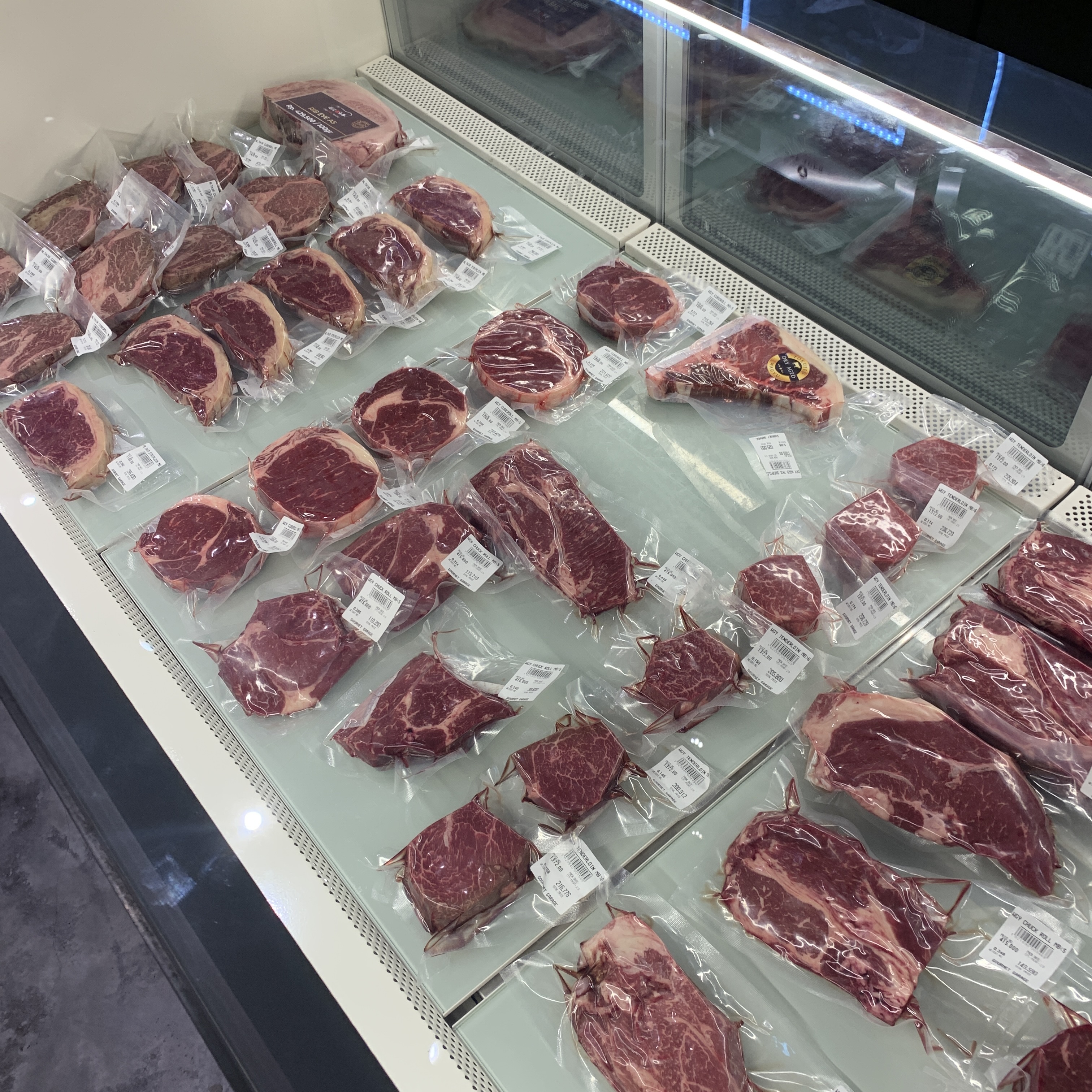 드라이에이징하는걸 눈으로 볼 수 있고, 호주산과 와규는 각각 따로 진열돼있어 가서 고르면 된다. 가격차이는 와규가 2~3배 정도 비싸다.