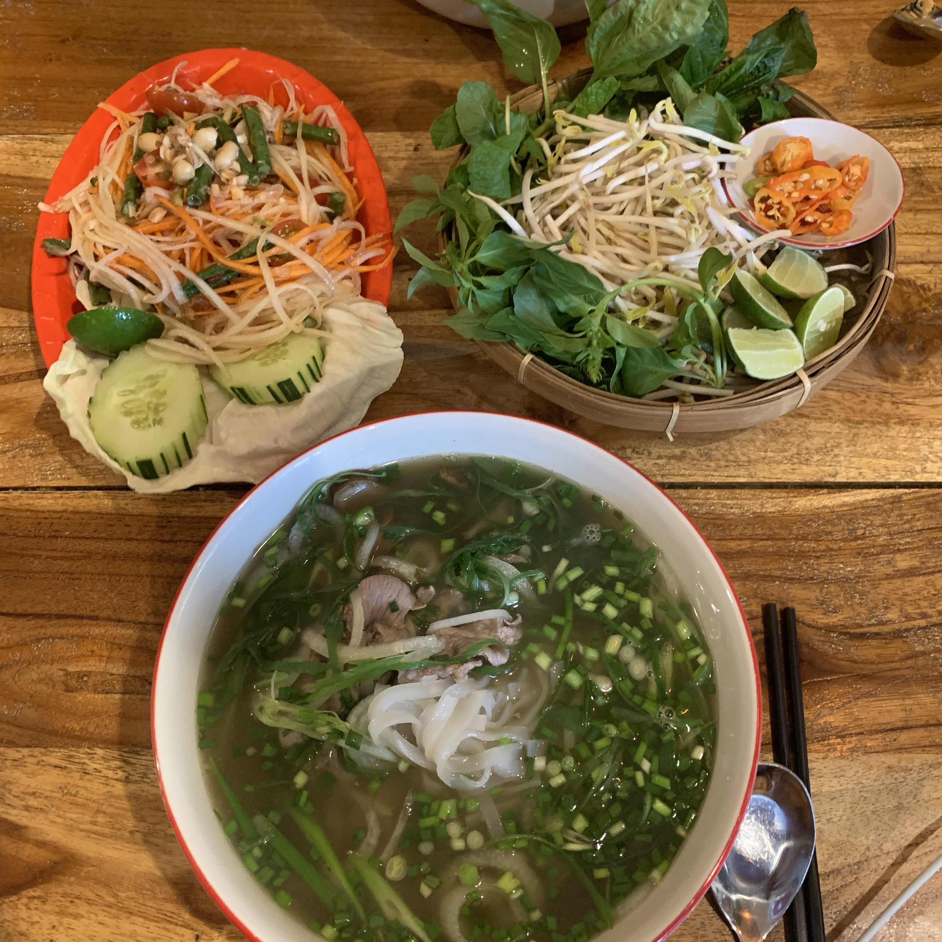 쌀국수와 쏨땀. 쌀국수는 생숙주를 따로 줘서 취향에 맞게 넣어먹으면 된다. 와이프가 아삭아삭한 식감을 좋아해서 생숙주 따로 주는 걸 좋아하는데 이곳은 그렇게 나와서 좋았다.