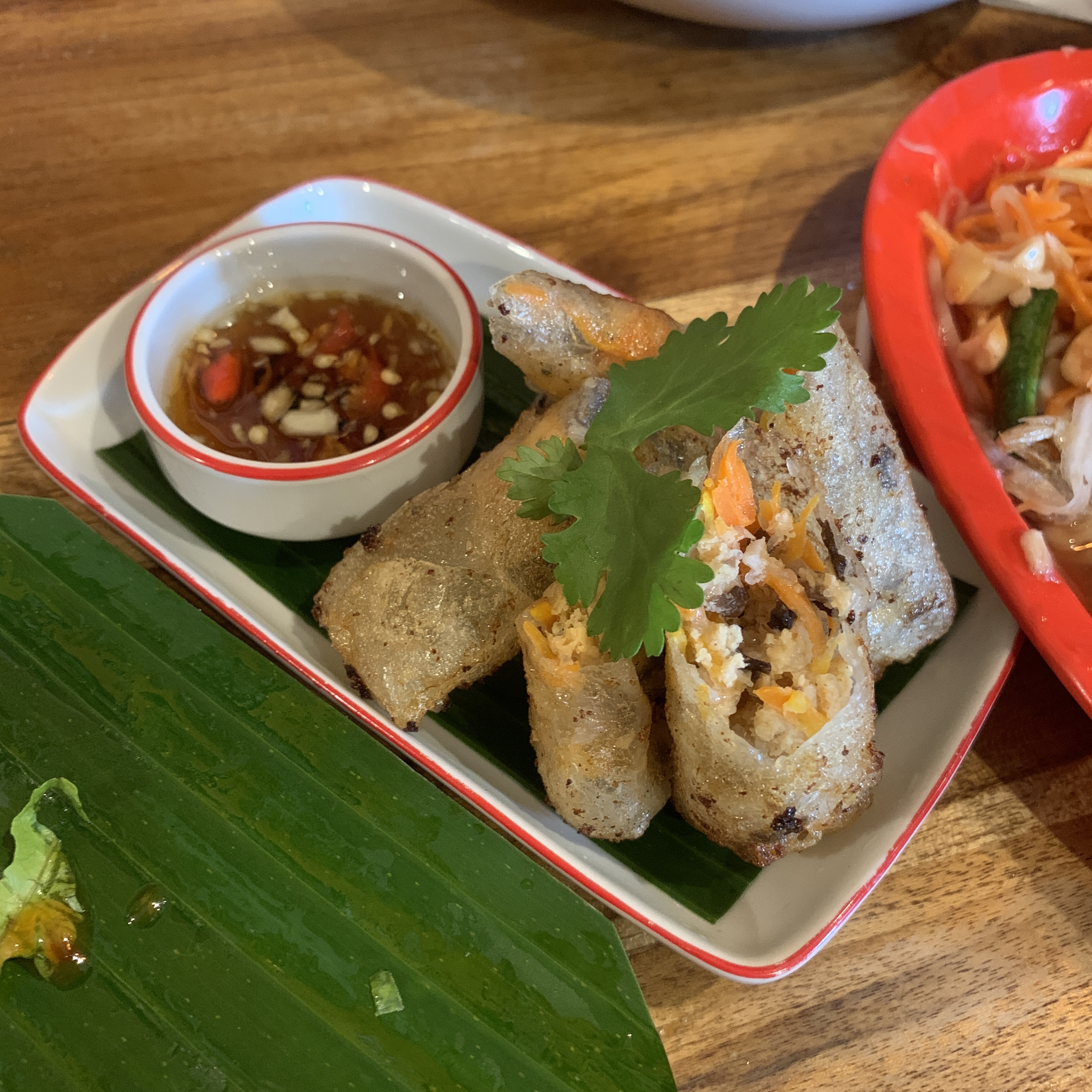 쏨땀은 태국 현지맛이 느껴졌지만 뭔가 조금 부족했다. 당근이 파파야 열매만큼 많이 들어가 있었고 피시소스도 적당했지만 현지맛이랑은 조금 달랐다. 스프링롤은 야채와 누들면, 새우가 안에 들어가 있고 라이스 롤로 말아서 나온다. 칠리소스에 찍어먹으면 된다. 튀김은 간장에 찍어먹으면 되는데 안의 내용물도 풍부했고 튀김 상태도 적당해서 튀김이 제일 괜찮았다.