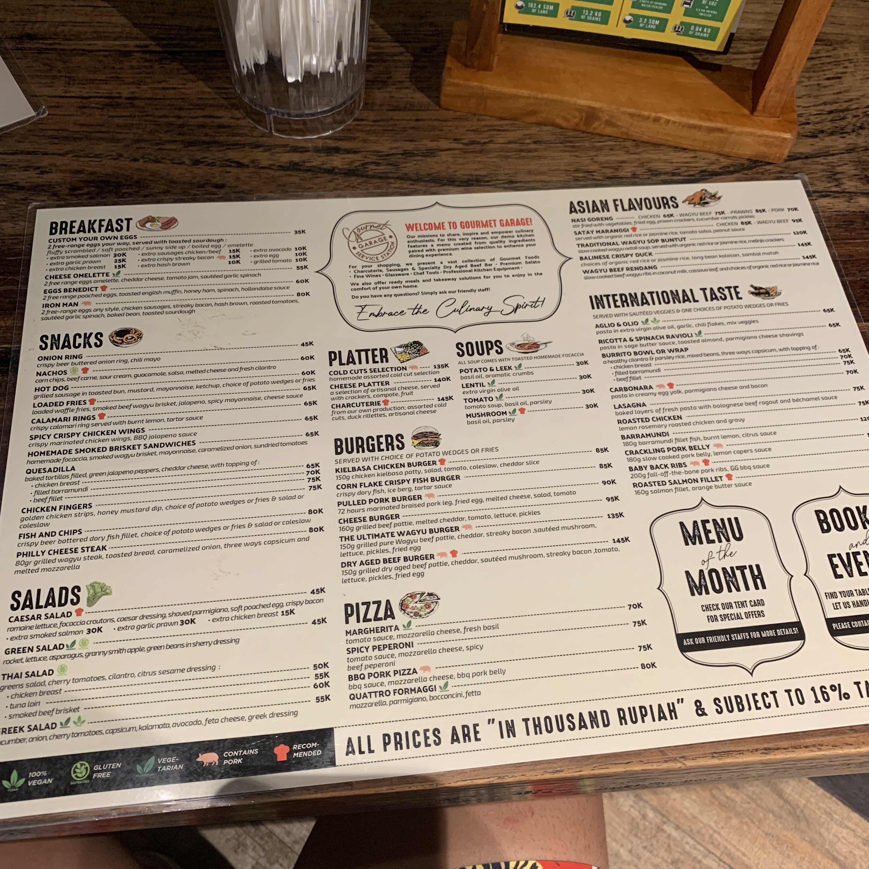 메뉴판. 스테이크는 본인이 선택하면 그 자리에서 스테이크를 주고 테이블로 가져와 나머지 요리들과 같이 주문하면 된다. 스테이크 주문 시 요리비용이 있다. 호주산은 65,000루피아, 와규는 90,000루피아를 추가로 내야 하는데 이 가격에는 소스와, 사이드메뉴 한 개씩 포함돼어있다. 사이드메뉴는 하나씩 선택해야 하는데 하나당 양이 충분하다.
