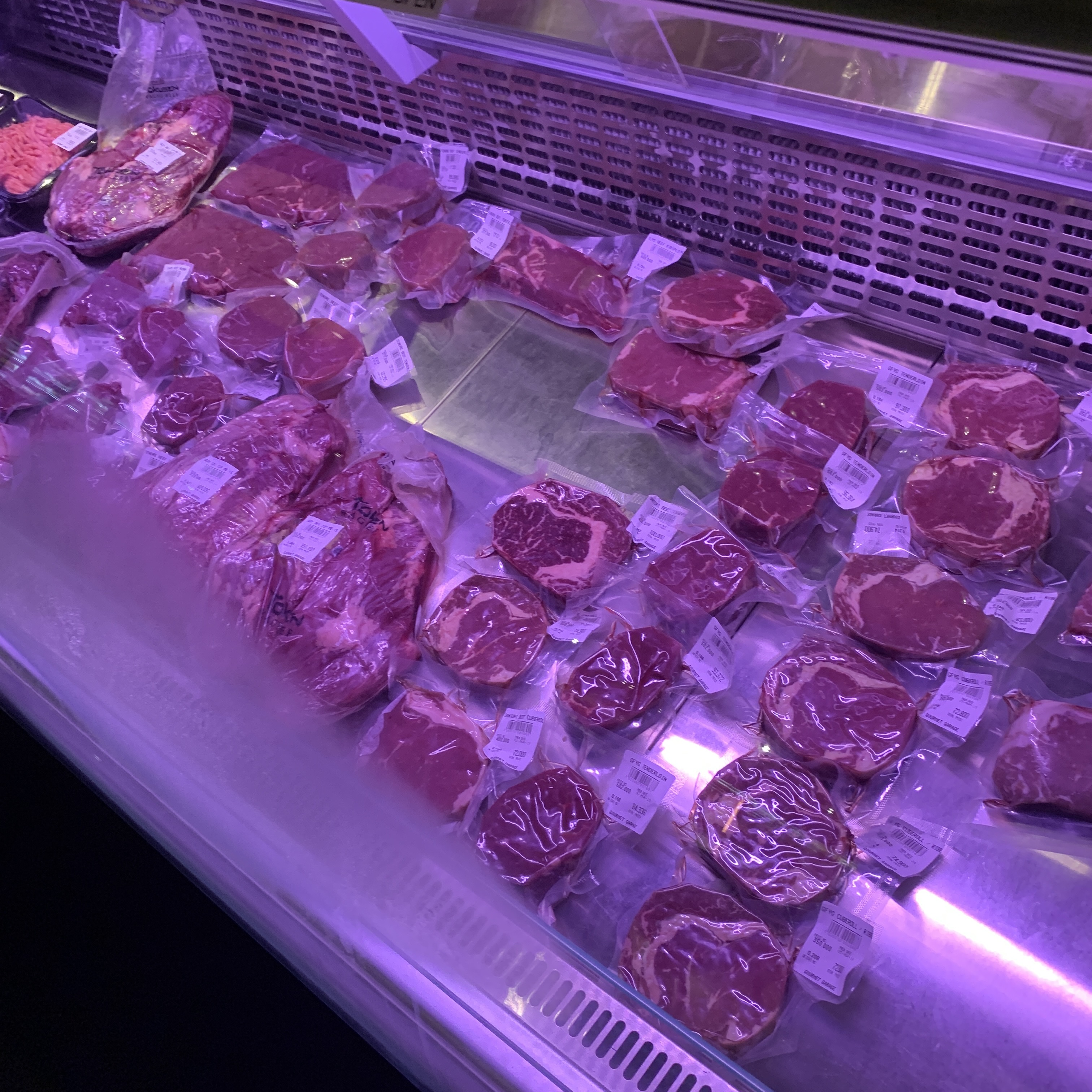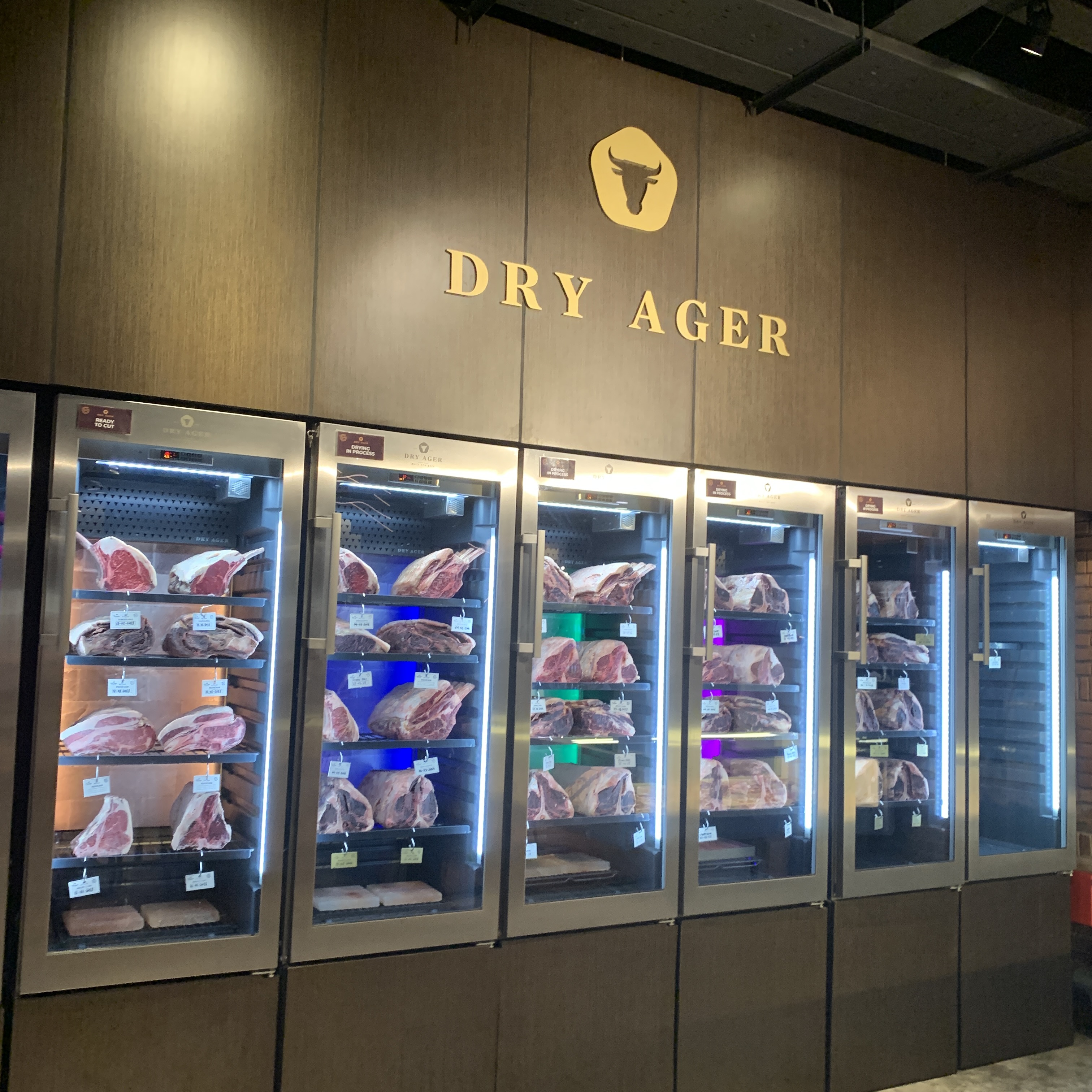 드라이에이징하는걸 눈으로 볼 수 있고, 호주산과 와규는 각각 따로 진열돼있어 가서 고르면 된다. 가격차이는 와규가 2~3배 정도 비싸다.