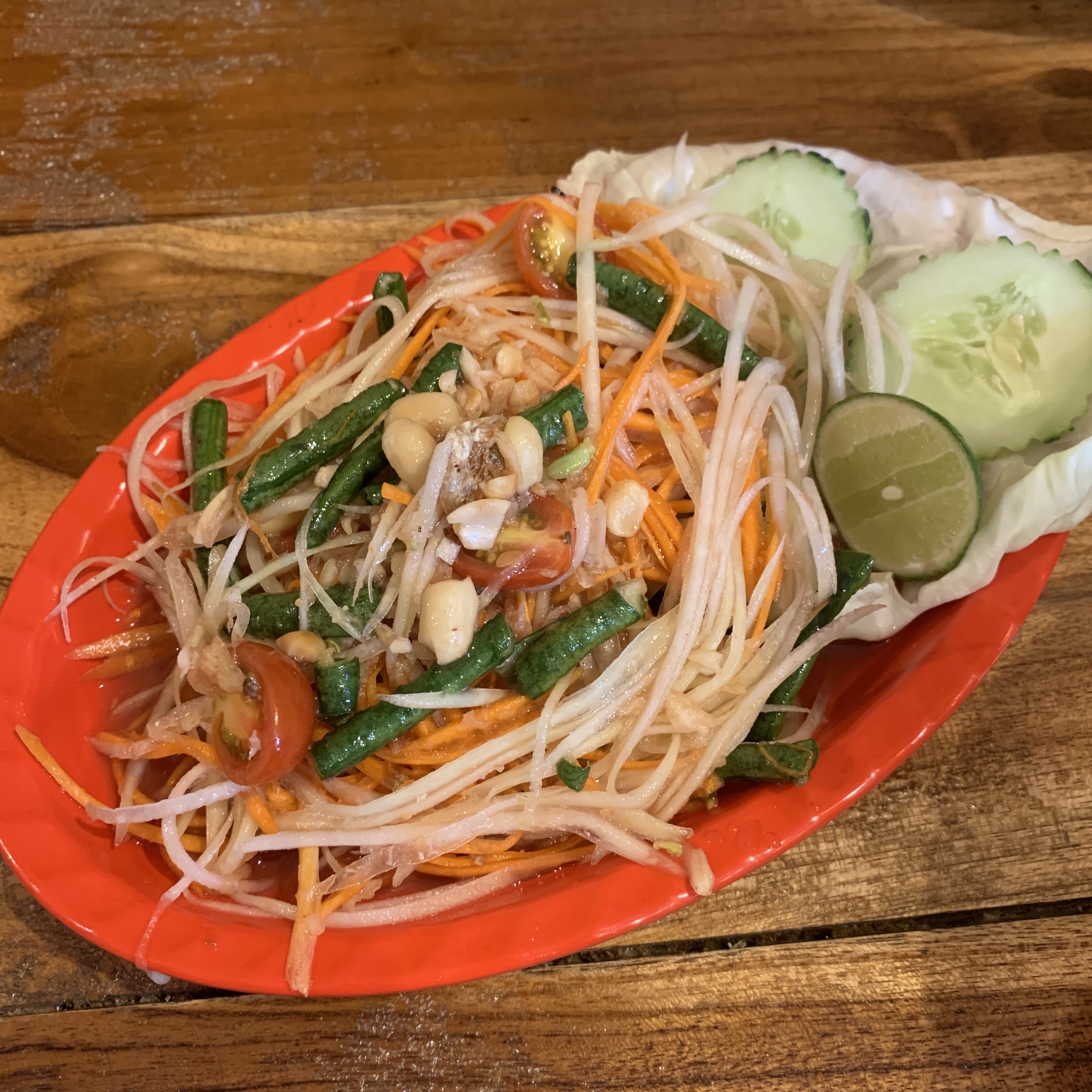 쏨땀은 태국 현지맛이 느껴졌지만 뭔가 조금 부족했다. 당근이 파파야 열매만큼 많이 들어가 있었고 피시소스도 적당했지만 현지맛이랑은 조금 달랐다. 스프링롤은 야채와 누들면, 새우가 안에 들어가 있고 라이스 롤로 말아서 나온다. 칠리소스에 찍어먹으면 된다. 튀김은 간장에 찍어먹으면 되는데 안의 내용물도 풍부했고 튀김 상태도 적당해서 튀김이 제일 괜찮았다.