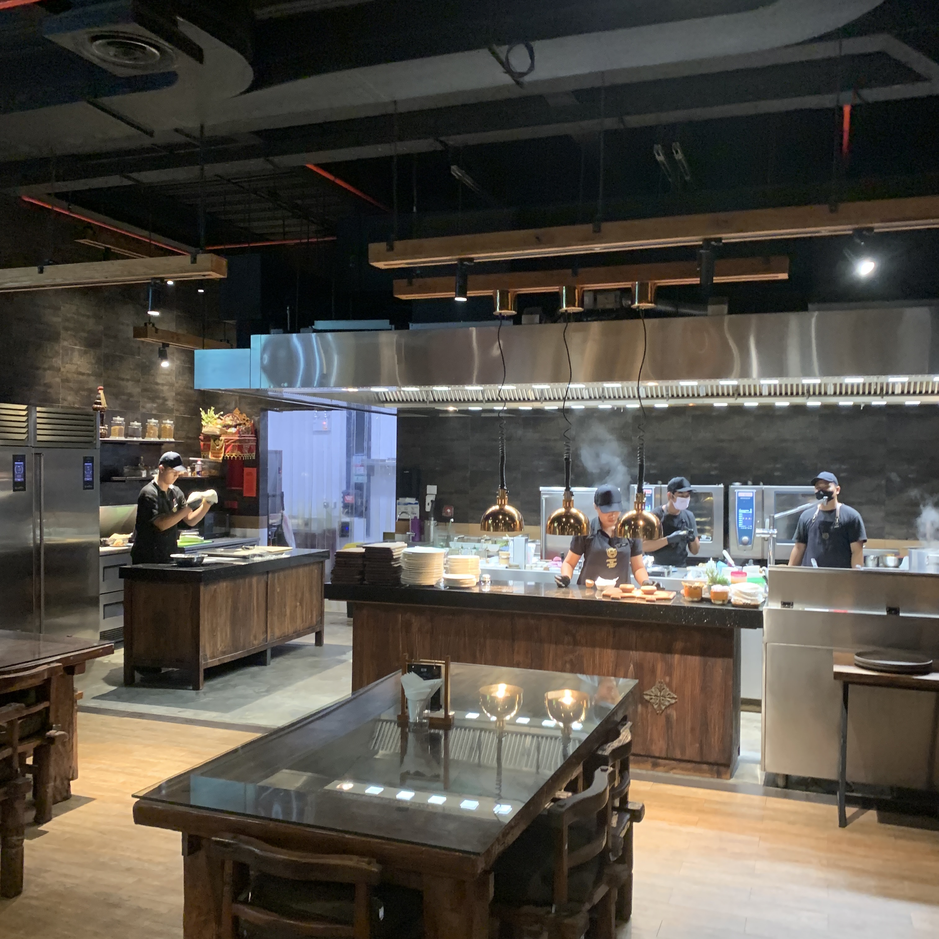 식당 내부 드라이에이징 섹션과 오픈 키친