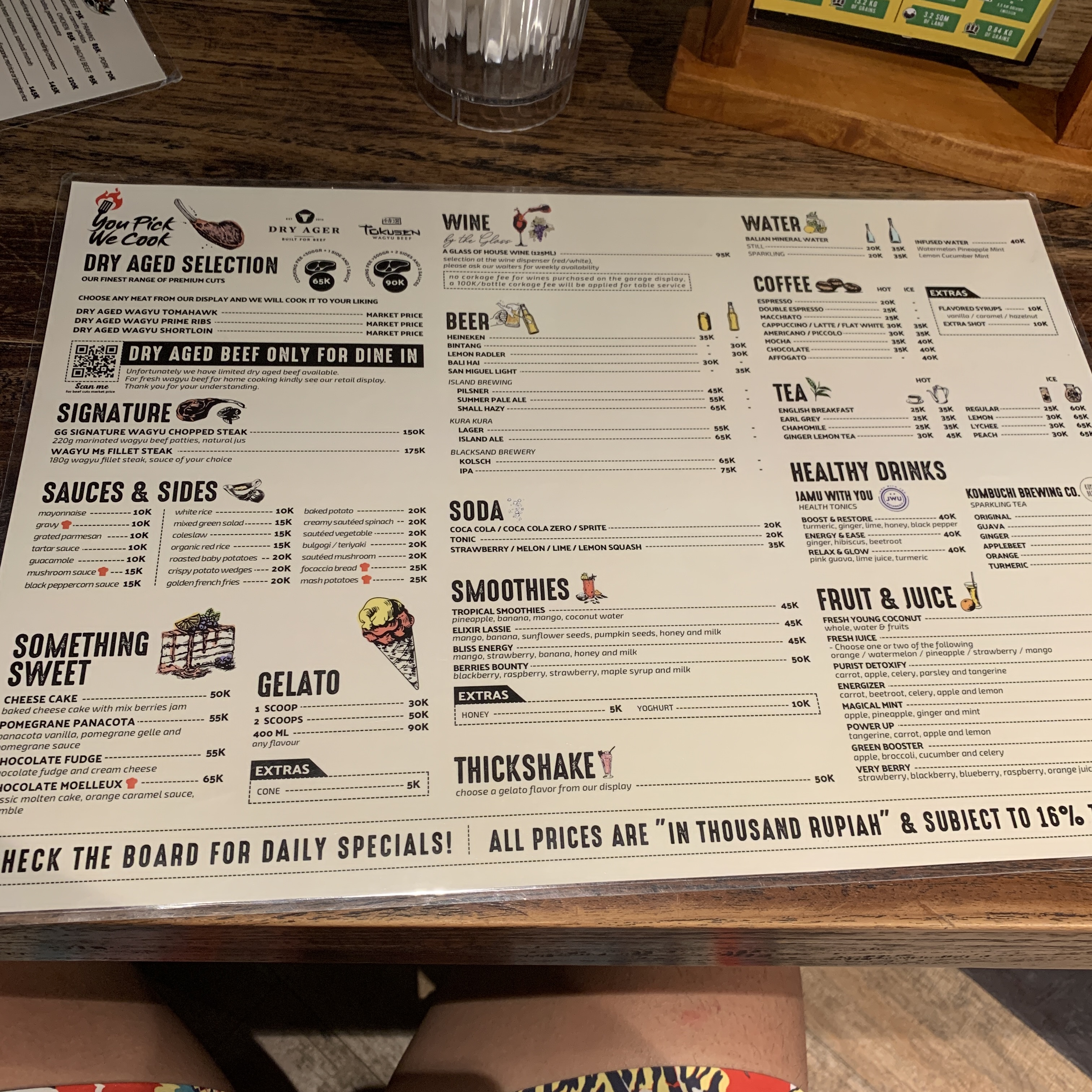 메뉴판. 스테이크는 본인이 선택하면 그 자리에서 스테이크를 주고 테이블로 가져와 나머지 요리들과 같이 주문하면 된다. 스테이크 주문 시 요리비용이 있다. 호주산은 65,000루피아, 와규는 90,000루피아를 추가로 내야 하는데 이 가격에는 소스와, 사이드메뉴 한 개씩 포함돼어있다. 사이드메뉴는 하나씩 선택해야 하는데 하나당 양이 충분하다.