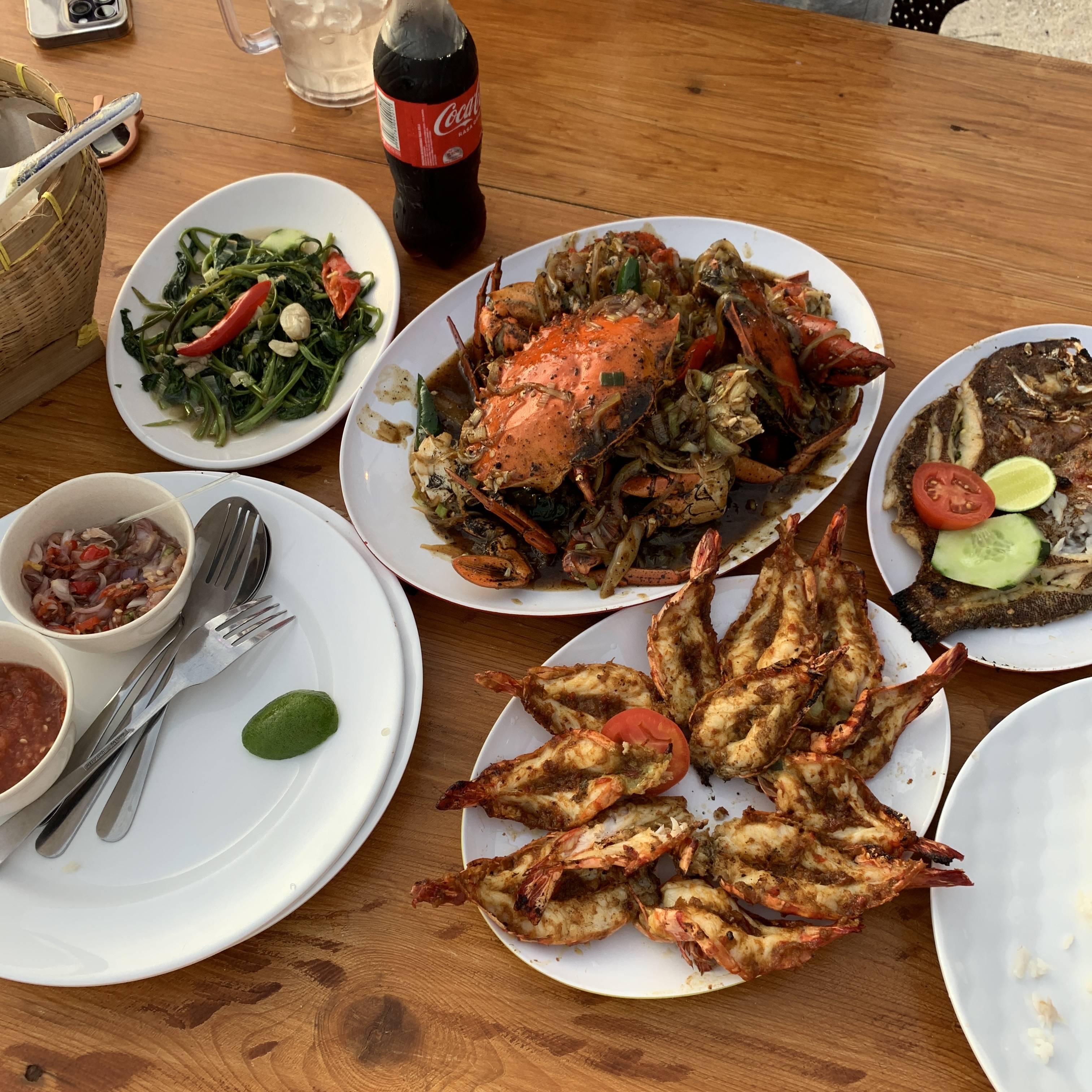 30분 정도 기다리니 음식이 나왔다. 모닝글로리볶음, 블랙페퍼크랩, 생선, 그리고 새우.