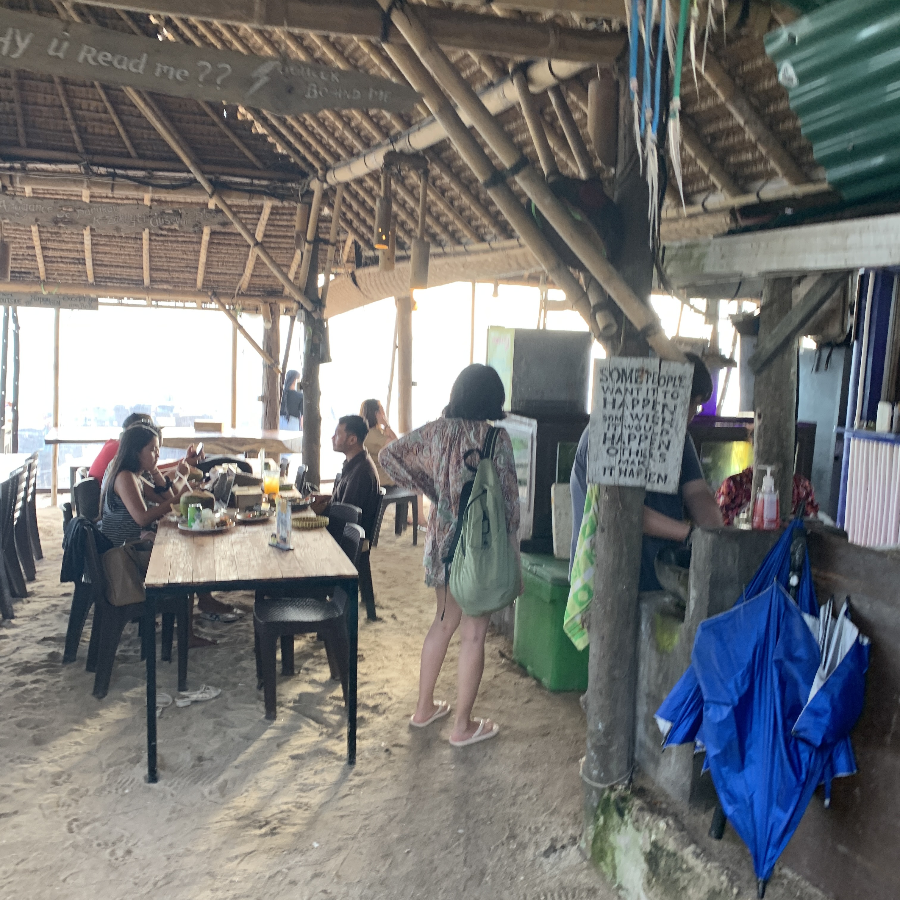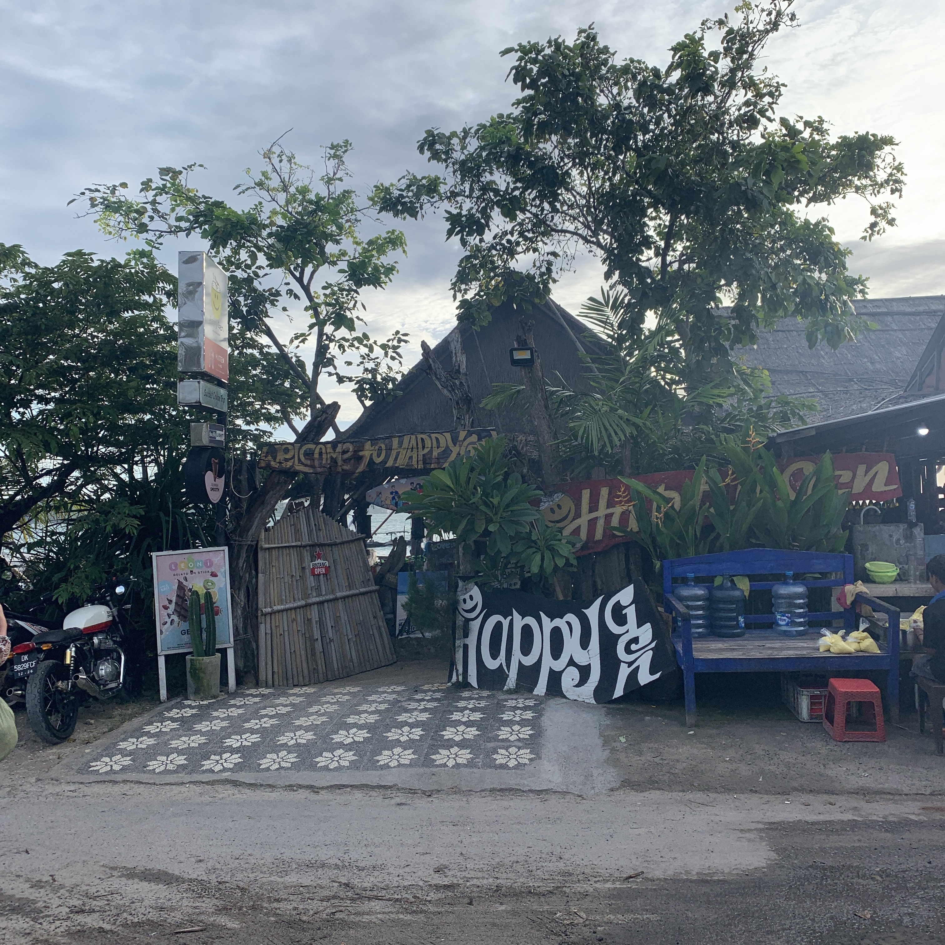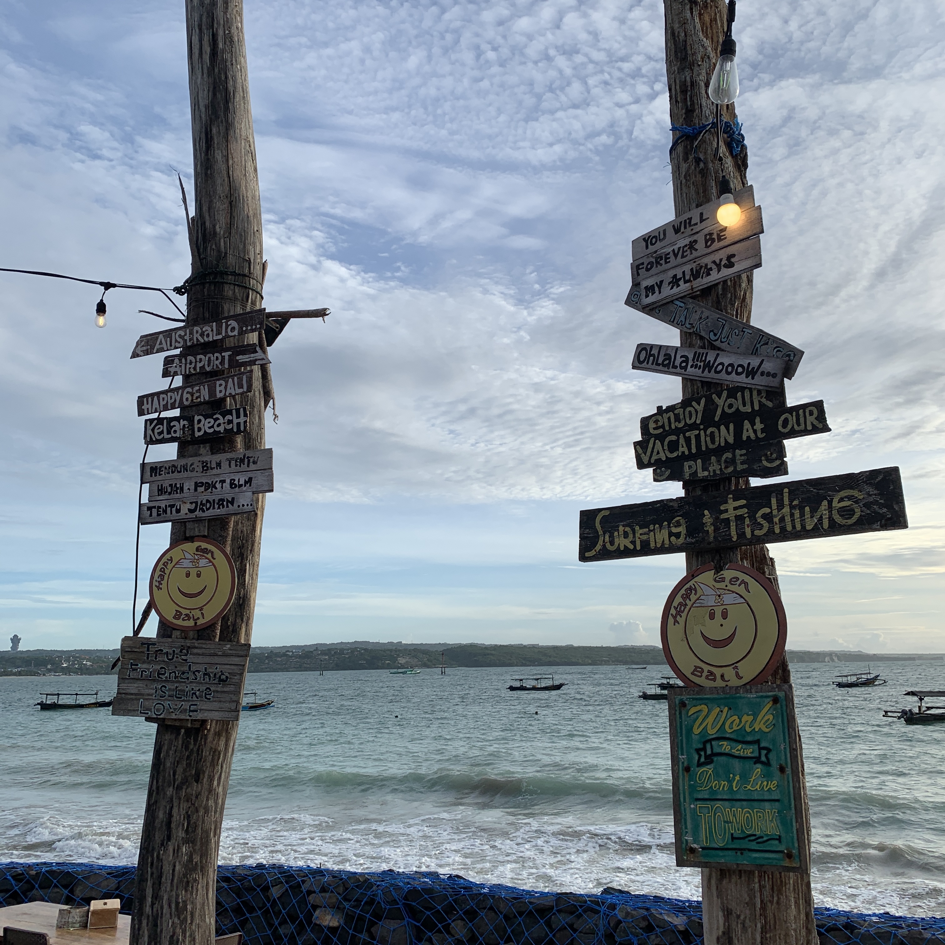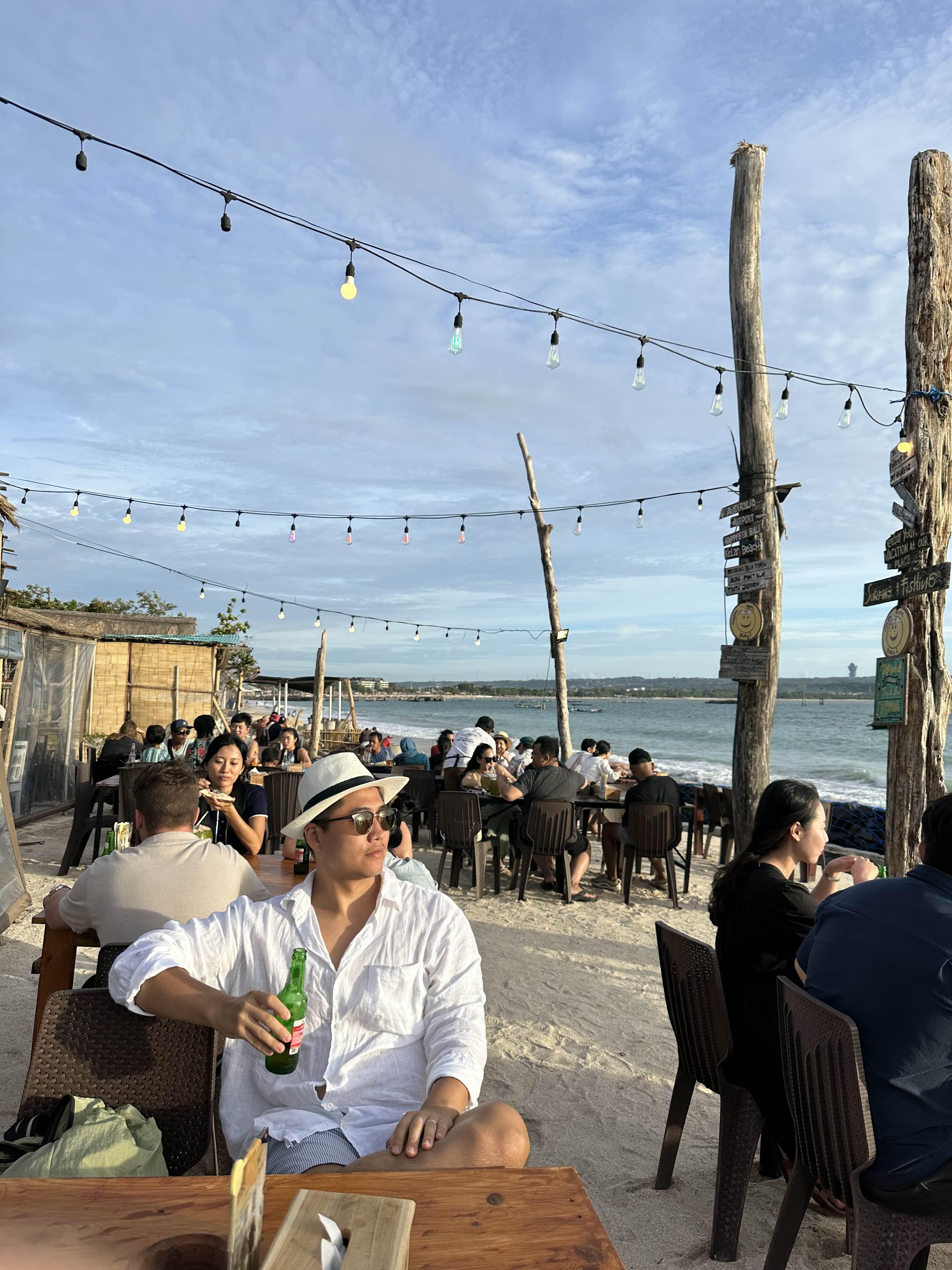 해변가에 위치한 해피젠. 이곳에는 해산물 가게들이 해변 따라 쭉 위치해 있어서 딱히 어디 갈지 모른다면 직접 가서 가고 싶은 식당으로 직접 들어가는 것도 괜찮다. 가게들이 모여있어서 바가지는 안 씌우는 것 같다. 공항 바로 아래라 짐바란 시내에서는 조금 걸린다. 원데이 택시 투어를 7시간에 400,000루피아에 빌렸고, 마지막 목적지로 이곳 해피젠으로 향했다. 식사시간은 음식이 나오는데 3~40분 정도 걸리니 여유 있게 1시간 정도 잡자.