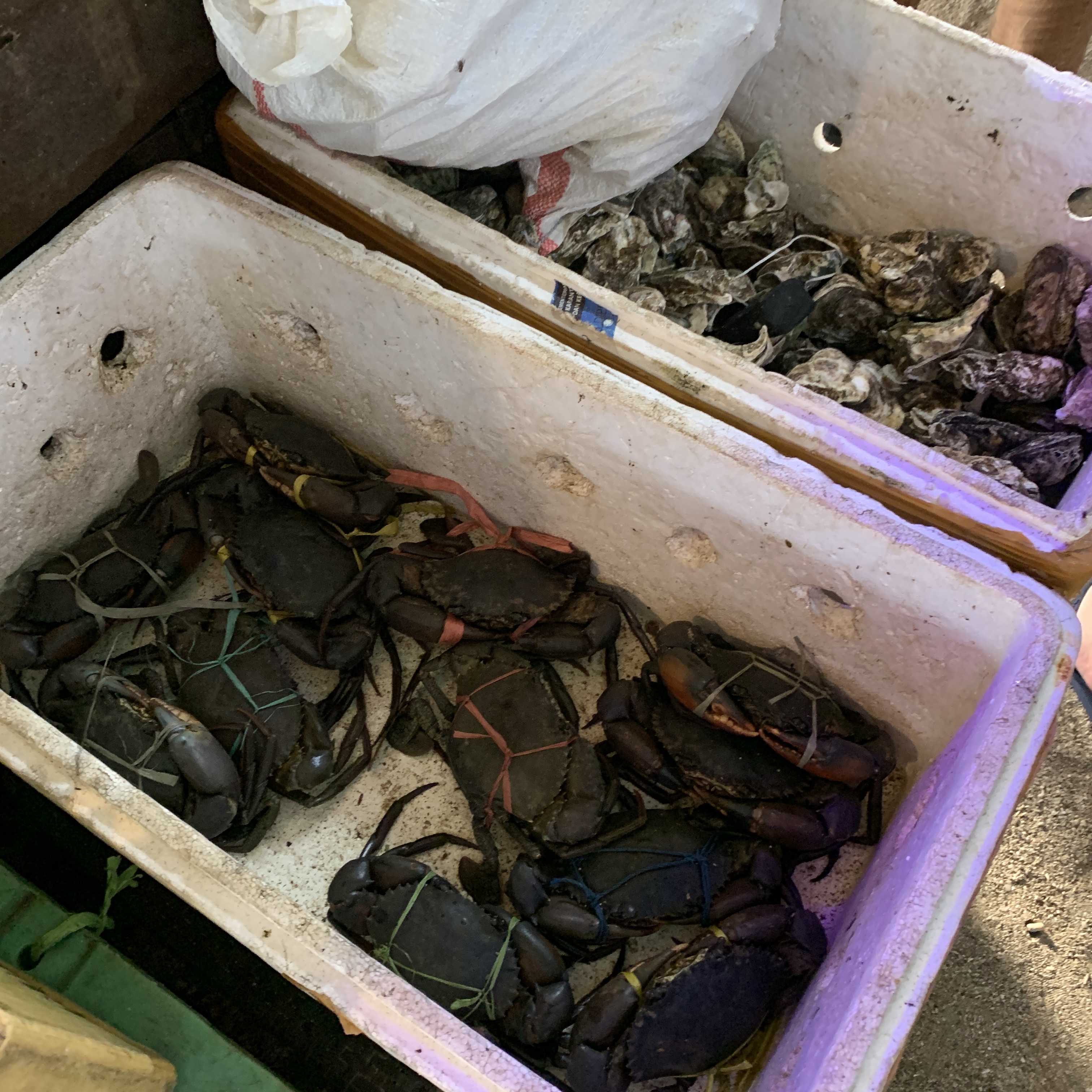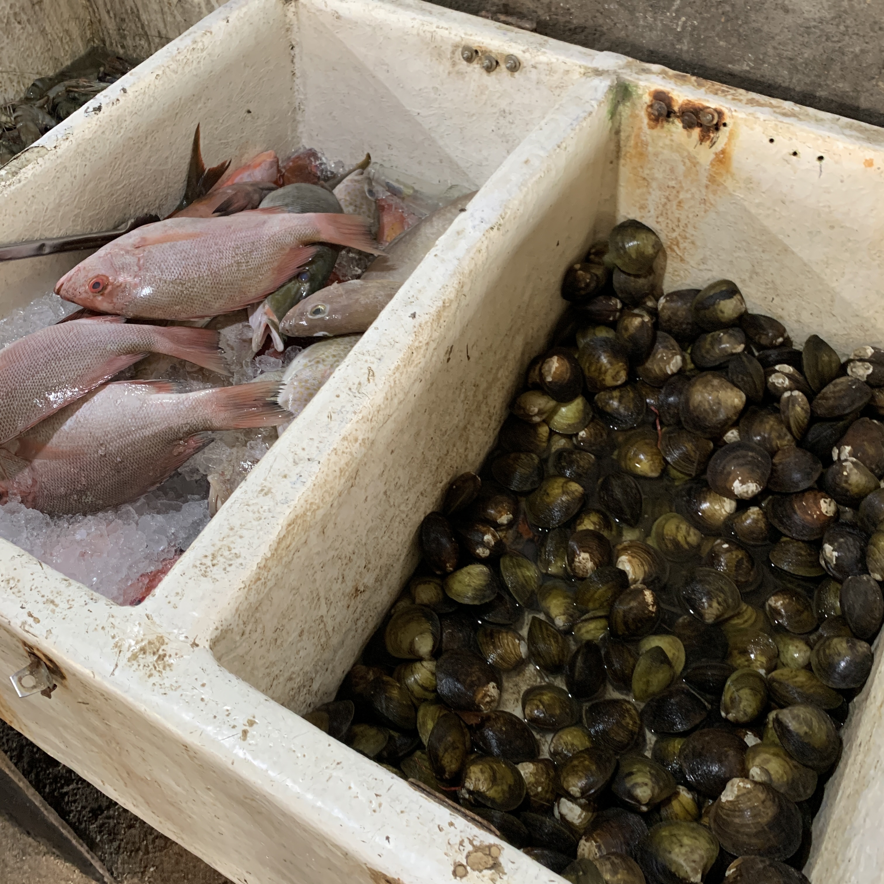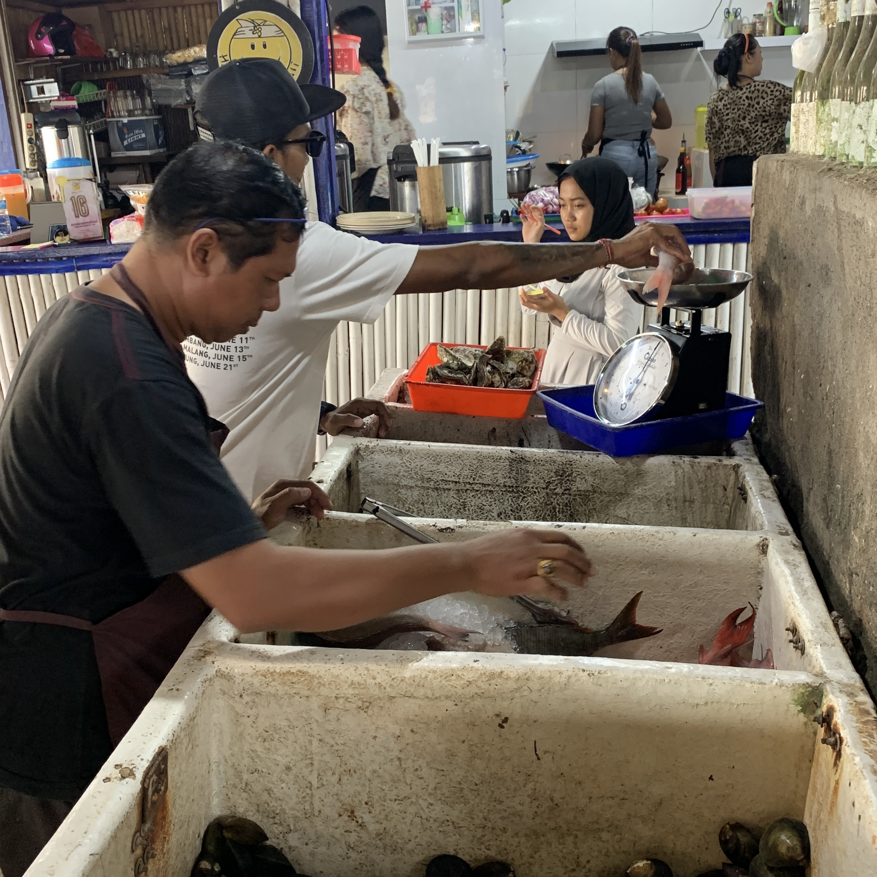 싱싱한 해산물들이 각자 자리에 위치해 있다. 한국처럼 수조가 없고 주변 청결상태가 좋진 않아 비위생적으로 보이지만, 상품 하나하나는 신선해 보였다. 먹고 싶은 만큼 골르면 그 자리에서 무게를 확인하고 그대로 조리에 들어간다.