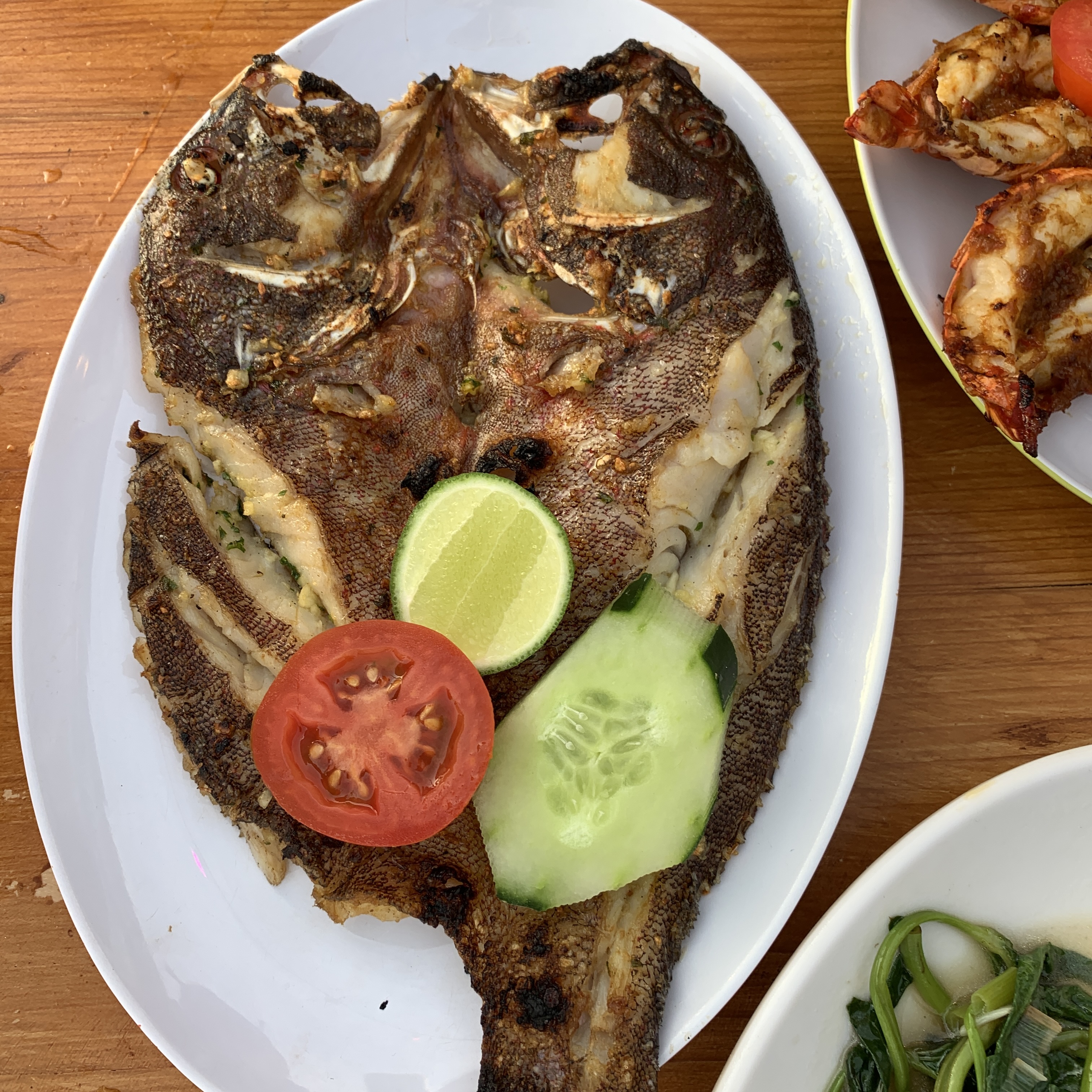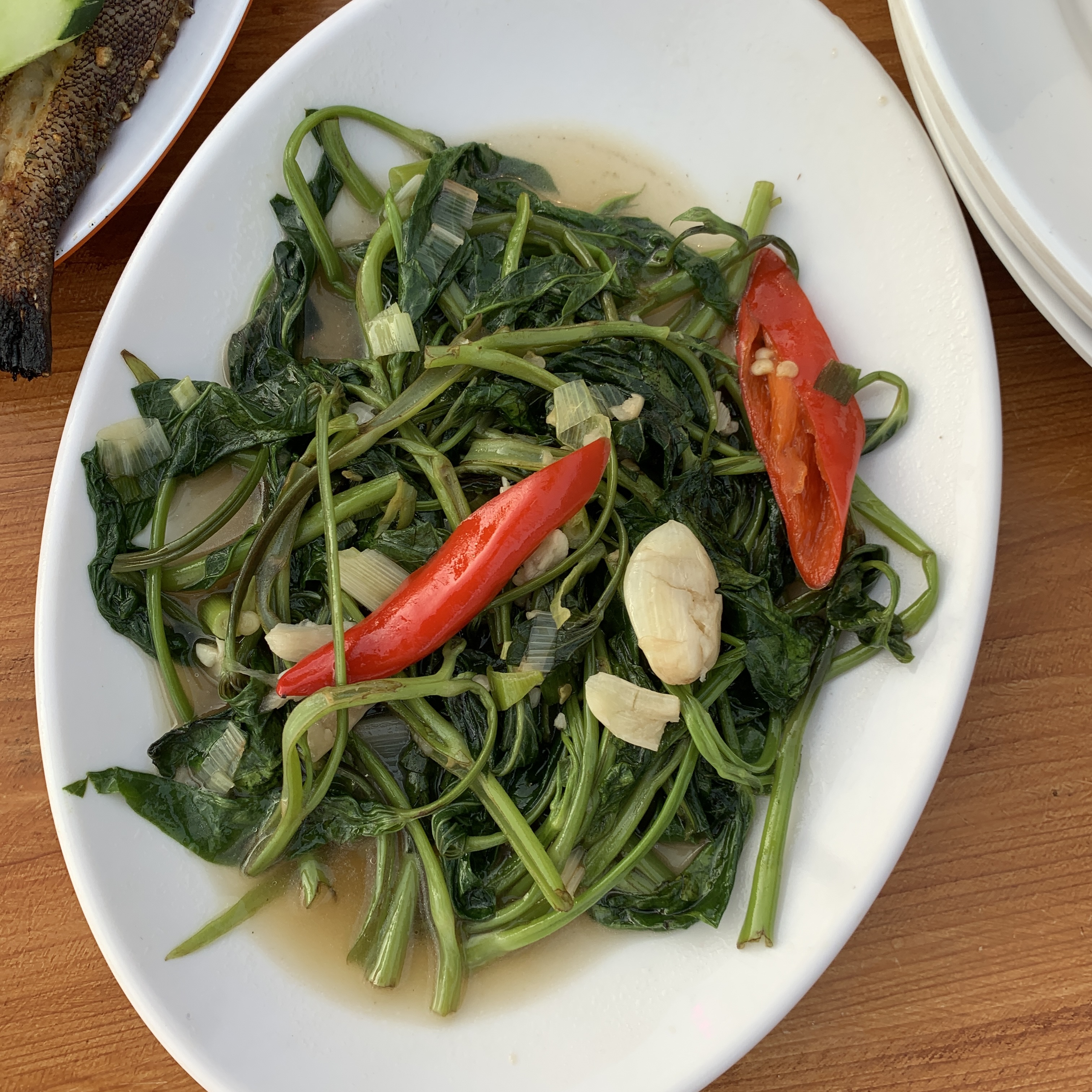 그리고 생선 400g과 모닝글로리 볶음. 조그마한 참돔 느낌이다. 살은 통통하고 먹을 게 많았다. 간이 진하지 않아서 첫째 때문에 시킨 건데 내가 절반 이상 먹었다. 모닝글로리 볶음은 처음 먹어봤는데 괜찮았다. 향이 강하지 않고 짭조름한 간이 해산물과 잘 어울렸다.