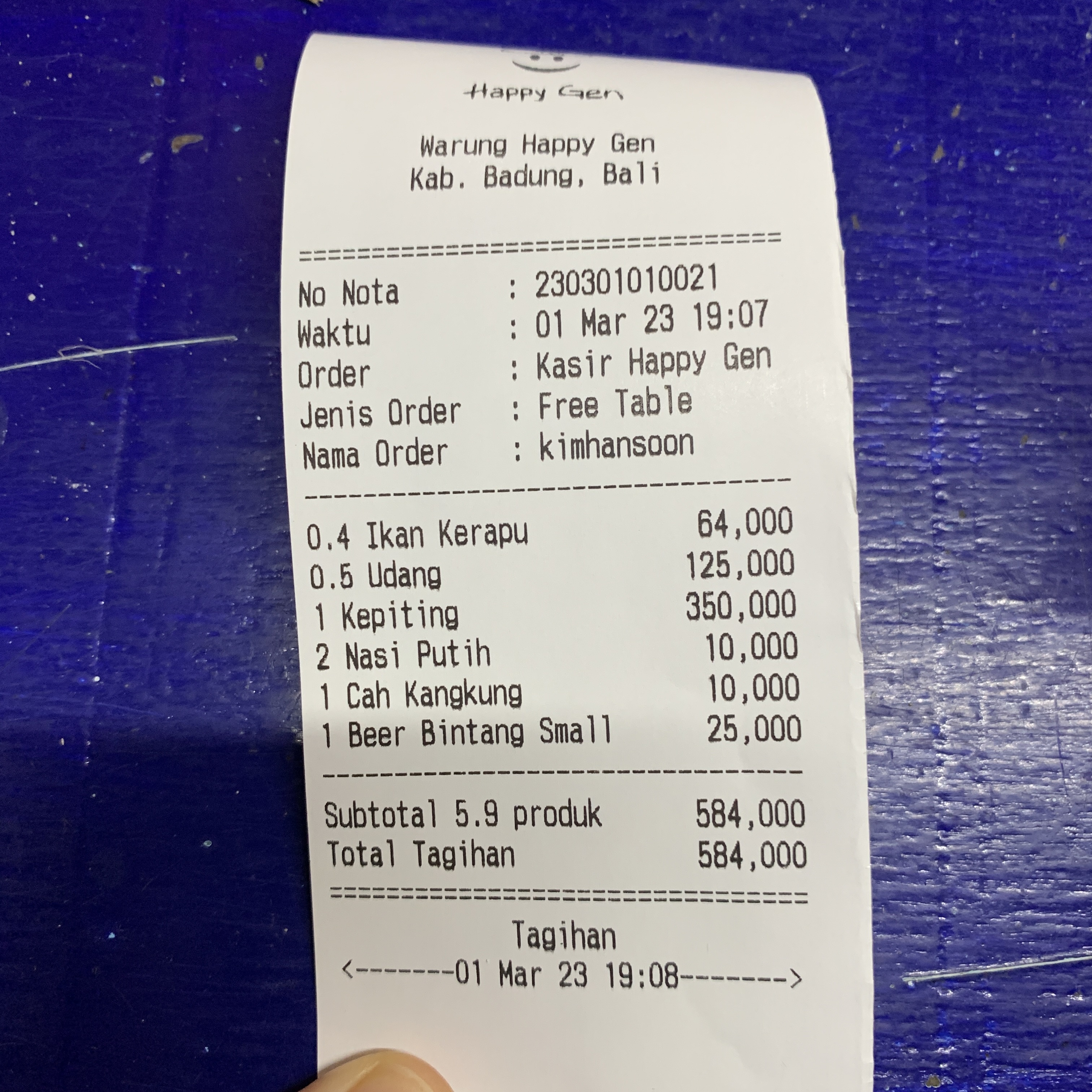 총 584,000루피아 한국돈으로 5만 원 정도 나왔다. 크랩이 들어갔고 부족함 없이 주문해서 식사했는데 이 정도 가격이면 나쁘지 않다. 와이프가 어디서 보고 갔는지는 모르겠지만 식당에는 한국인이 많았다. 가게 규모가 작았음에도 불구하고 4~5팀이 한국인이었다. 그만큼 괜찮다고 소문이 난 것 같다. 음식맛도 좋았지만, 멋진 노을과 분위기도 좋았던 식당. 짐바란 해변가 씨푸드 식당들보다 단가가 조금 더 비싼 편이지만 만족스러웠다.