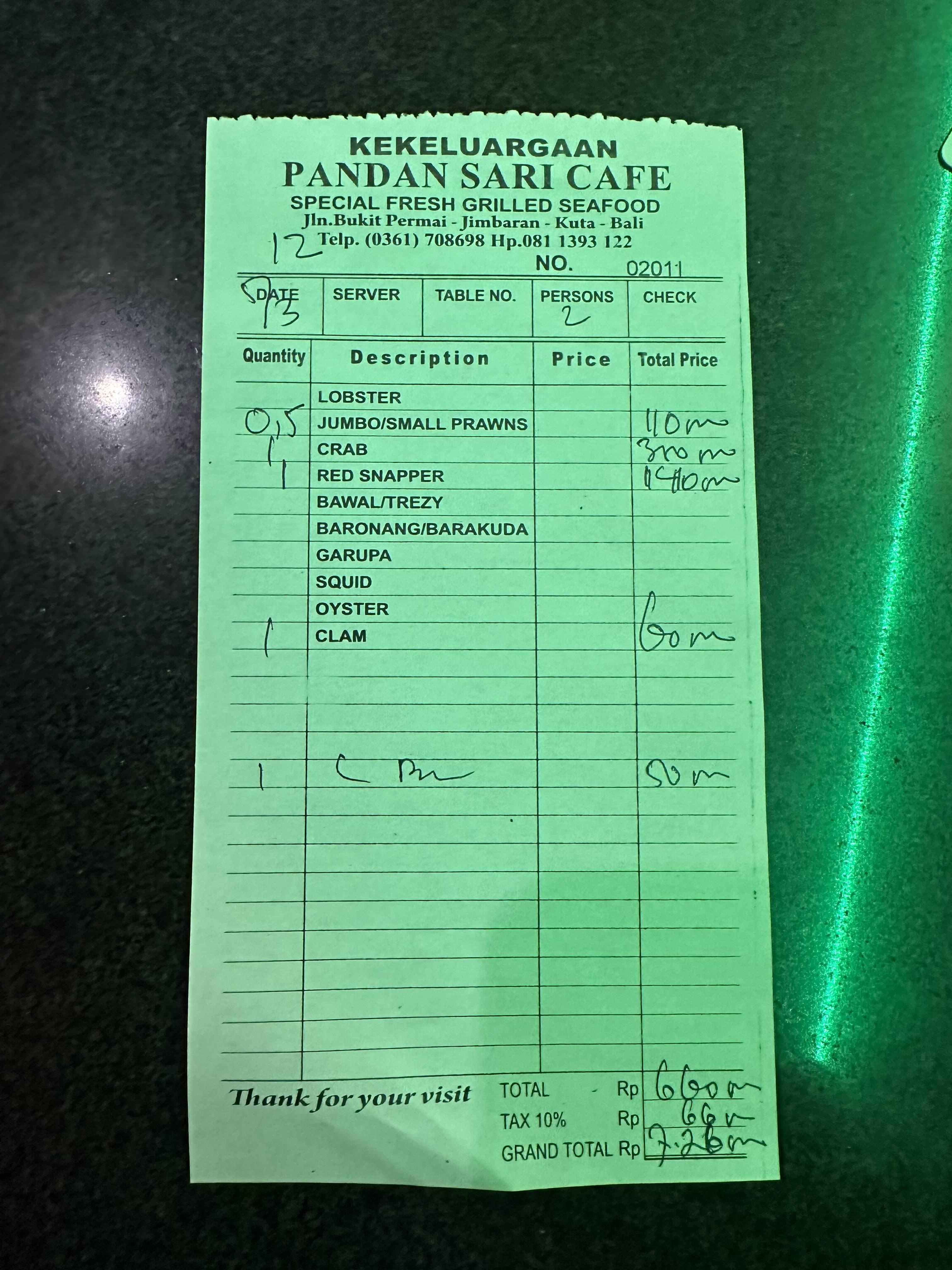 셋이서 배부르진 않고, 적당히 식사해서 726,000 루피아 나왔다. 6만 원 정도 나온 금액이고 모두가 맛있게 잘 먹었다. 다만 크랩 1kg 주문 시 한 마리 나온 거에 대해서는 찝찝한 마음이 들지만, 와이프가 직접 확인했으니 넘어간다.