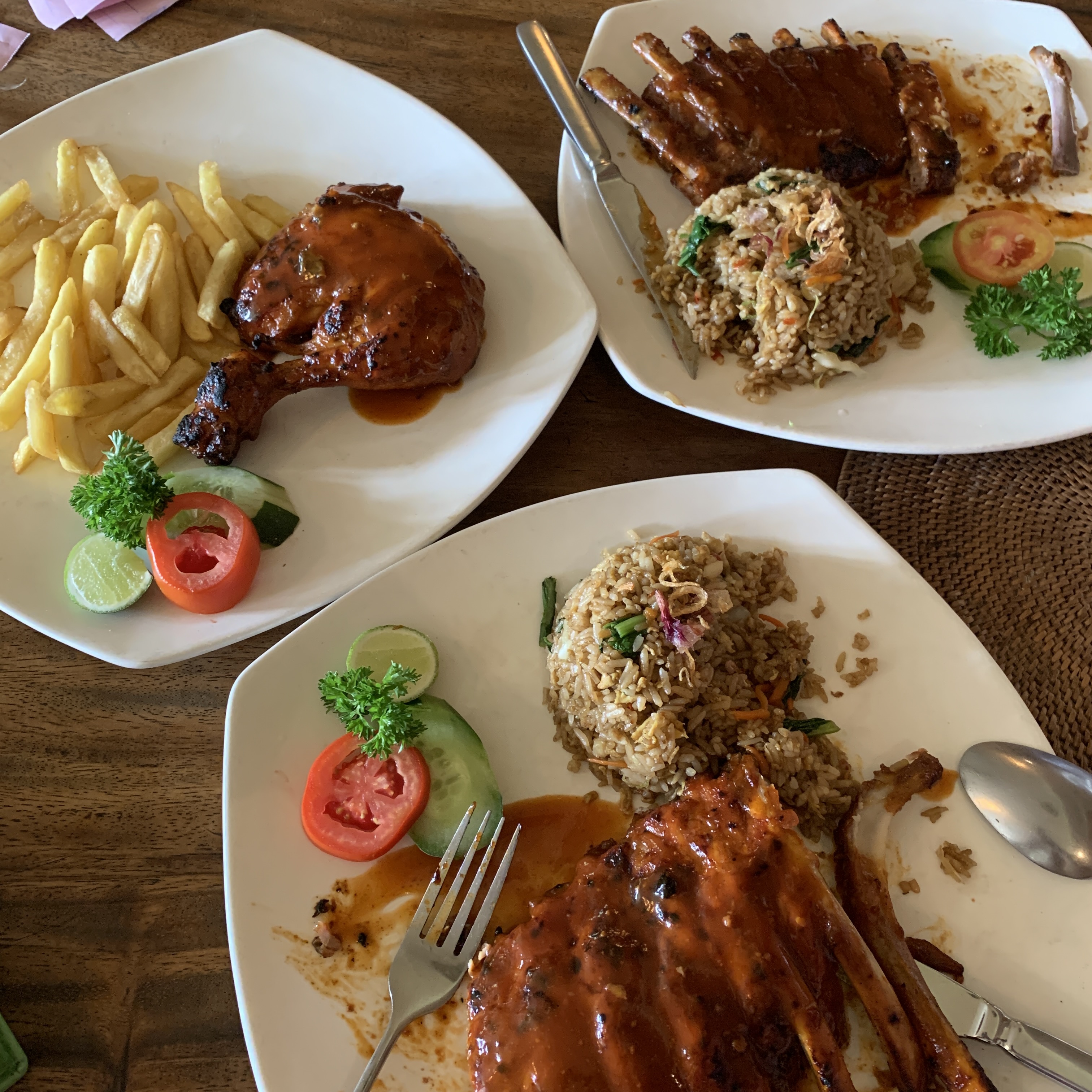* 그릴요리(폭립, 치킨 등)를 시키면 감자튀김이나 흰밥을 주는데 25,000루피아를 추가로 내면 나시고랭으로 업그레이드가 가능하다. 추가로 나시고랭 시킬 필요 없이 이렇게 업그레이드시키는 게 괜찮다.