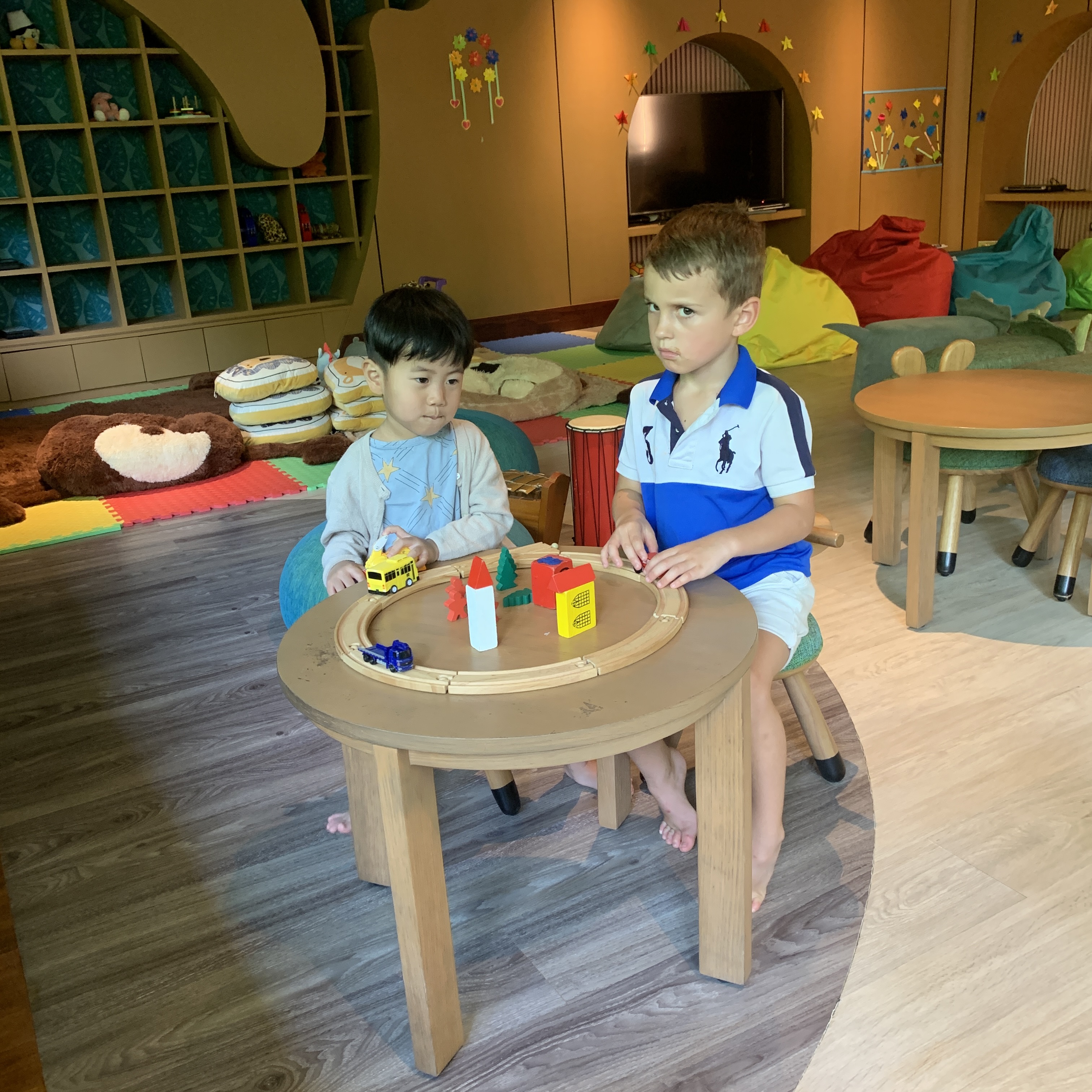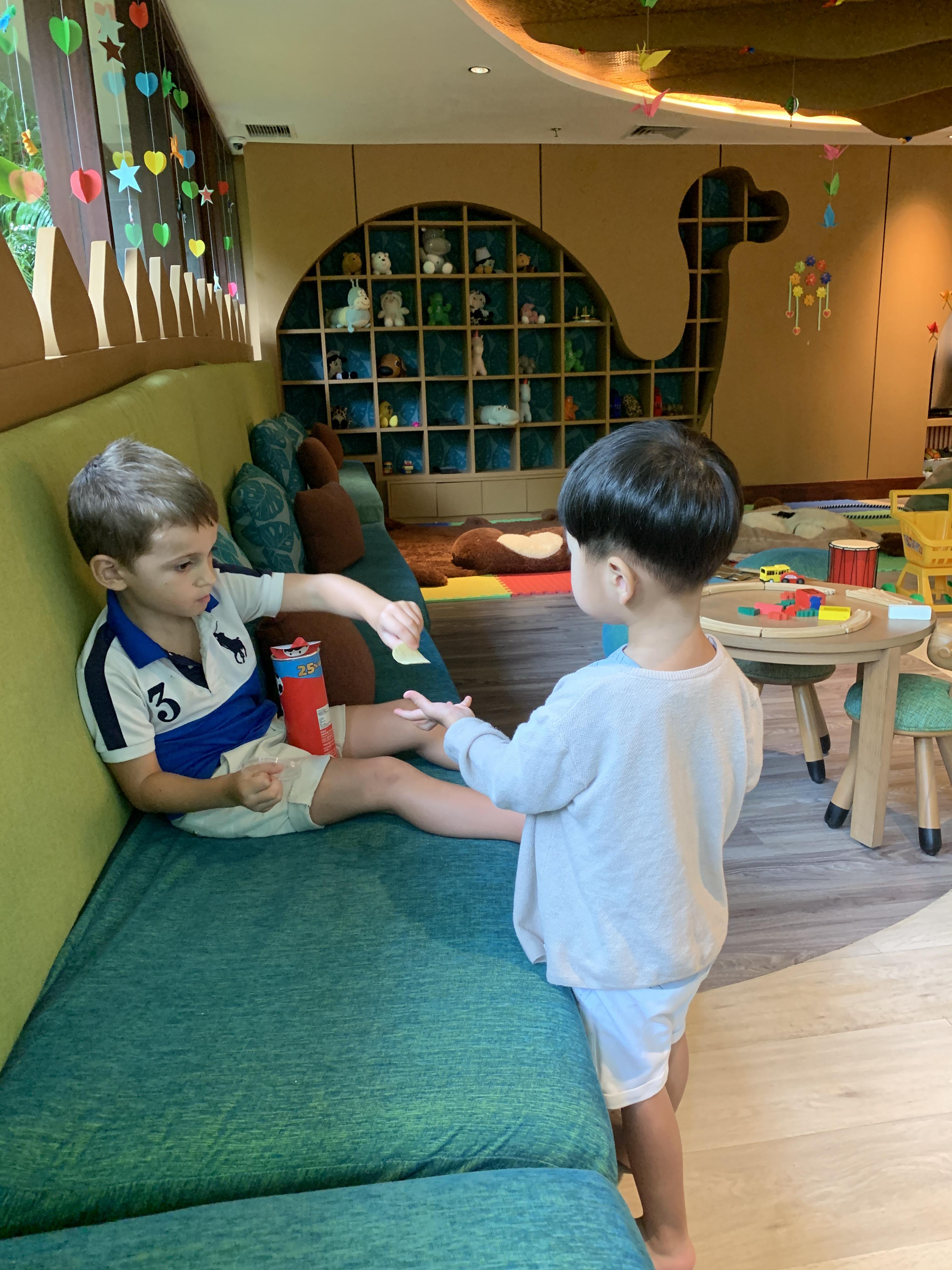 하야트리젠시발리 키즈클럽에서 만난 외국형아랑. 형아가 괴롭힌다고 생각했는데 나중에 가니 이안이 장난감도 챙겨주고 과자도 준다. 3,4일 정도 매일 봤는데 마지막 헤어지기 20분 전 친해졌다. 그리고 굿바이.