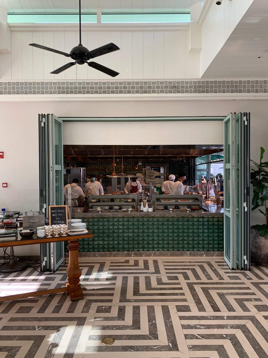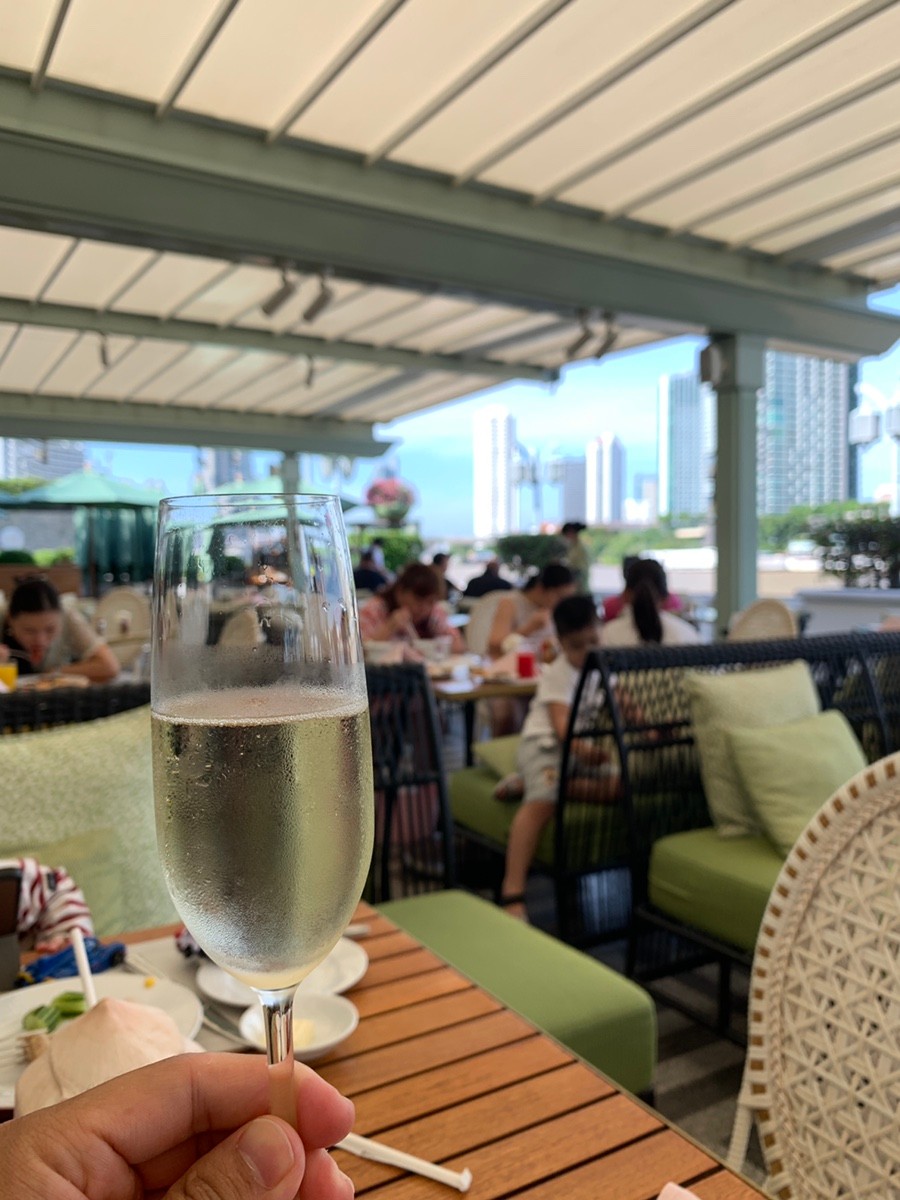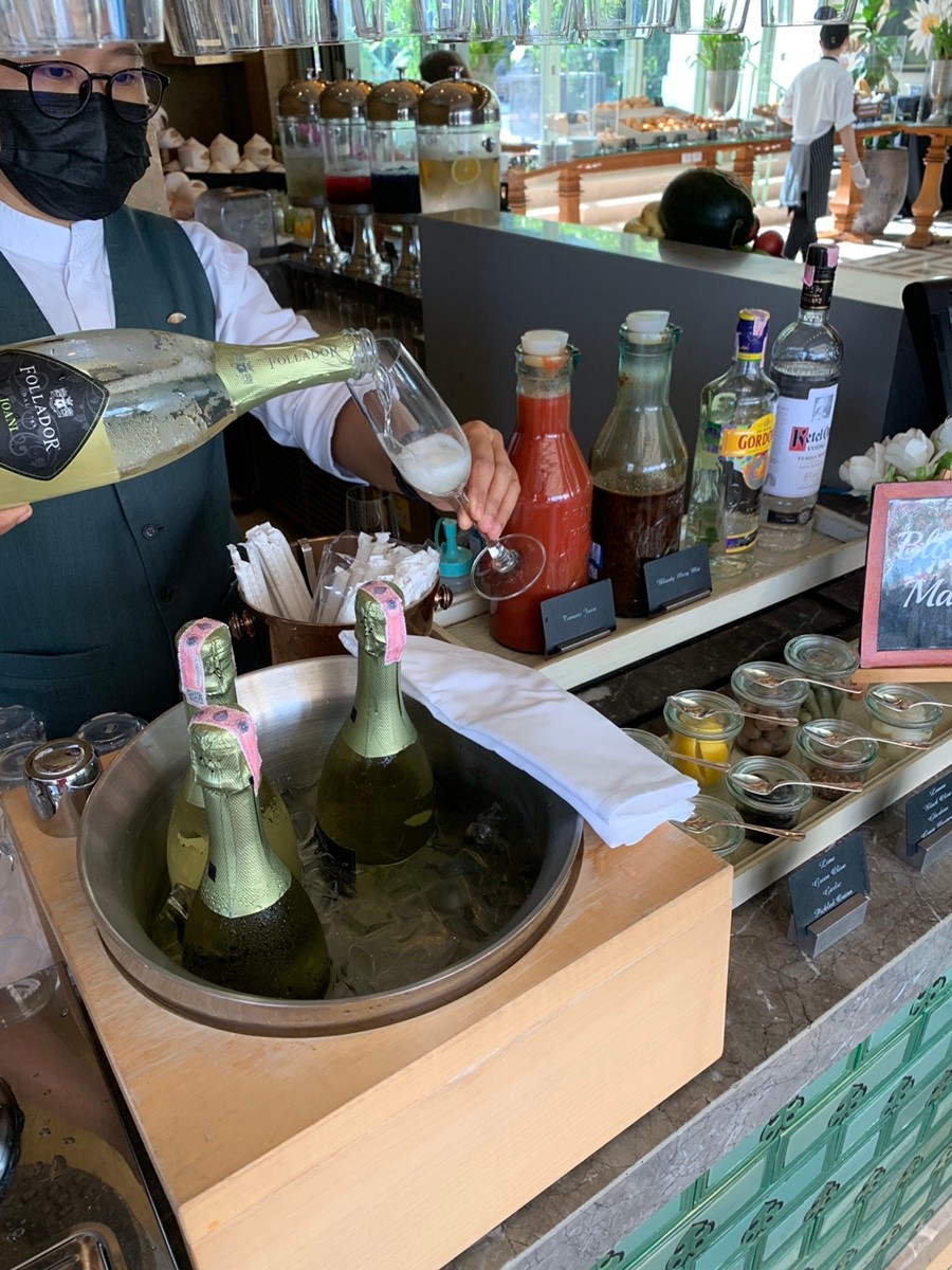 만다린 오리엔탈 방콕의 조식(더 베란다). 이곳의 최대 장점은 뭐니 뭐니 해도 아침부터 무한으로 즐길 수 있는 샴페인. 샴페인 무제한이다. 덕분에 호텔에서 아침술도 먹어본다. 간단한 요리는 자리에서 단품으로 주문 가능하고, 대부분의 요리는 뷔페식으로 원하는 음식을 갖다 먹는 식이다.