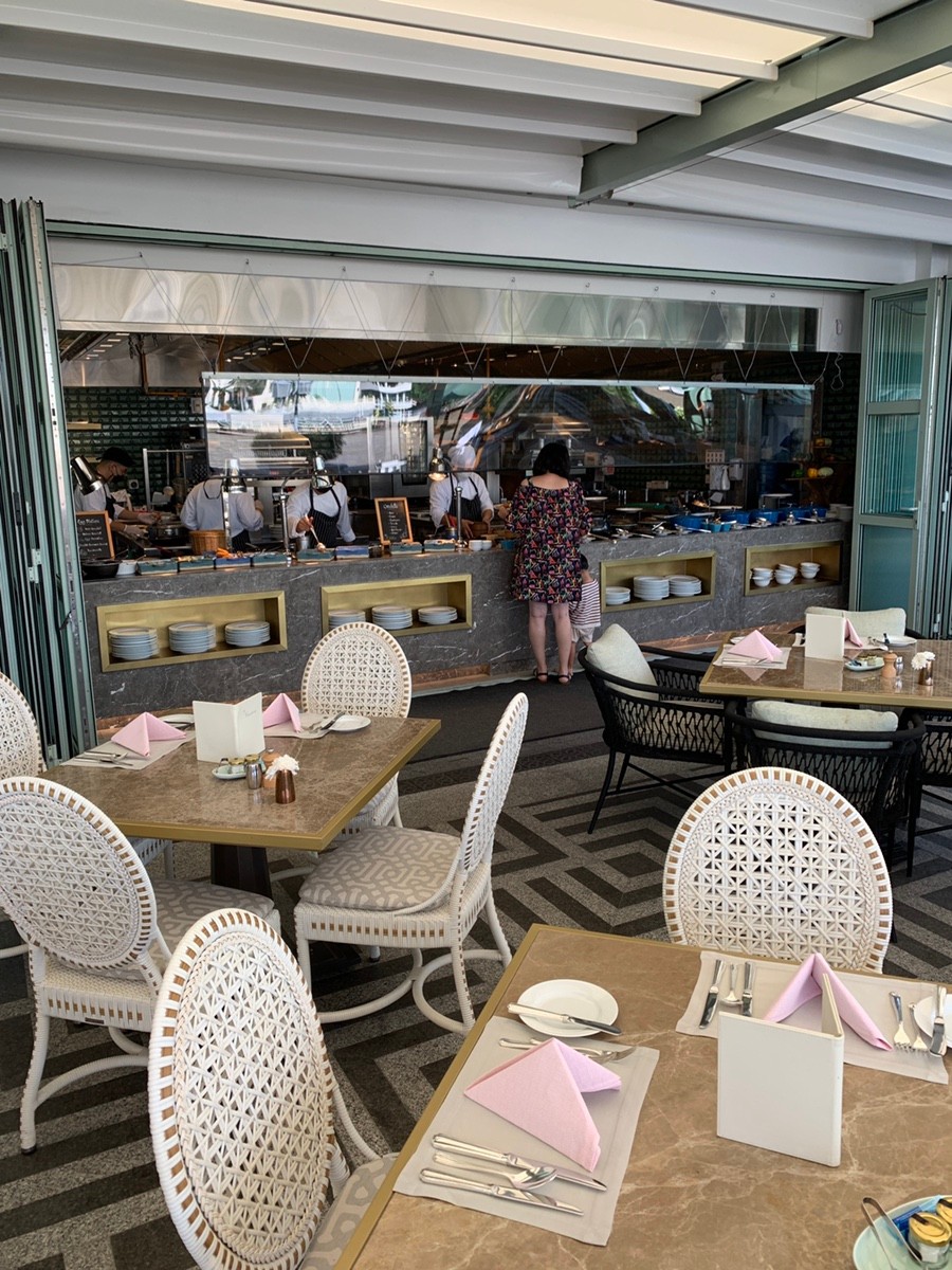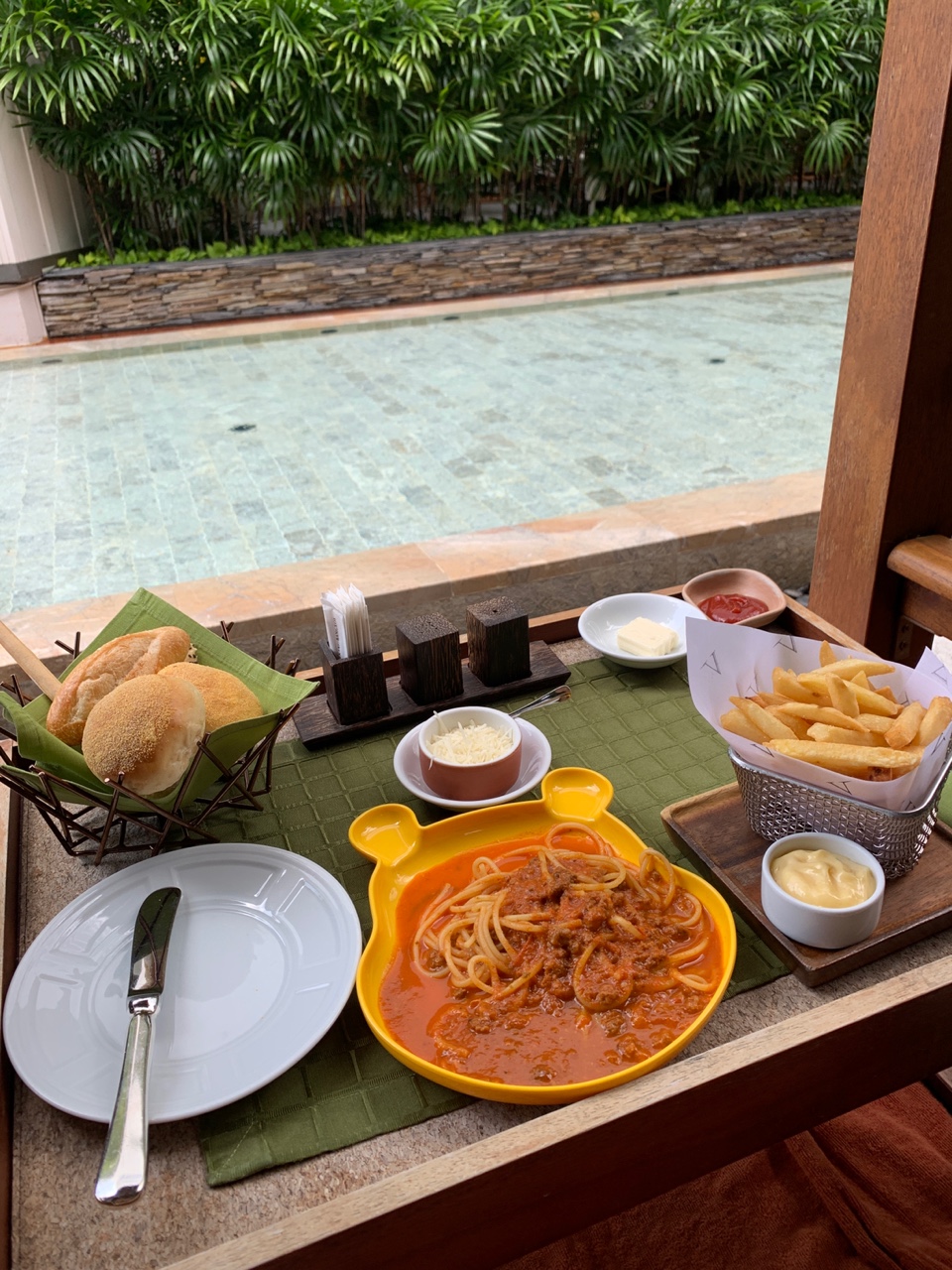 수영장에 도착하면 방갈로와 선배드들이 많이 구비되어있다. 원하는 자리를 선택하면 직원분들이 수건을 깔아주고 자리를 세팅해준다. 우리는 조식 먹고 수영장으로 가서 하루 종일 수영만 했다. 수영장과 붙어있는 식당(더베란다)이 있는데 수영장에서 음식을 주문해서 먹을 수 있다.