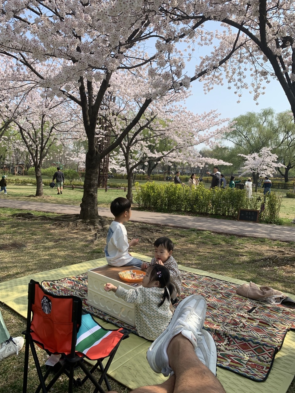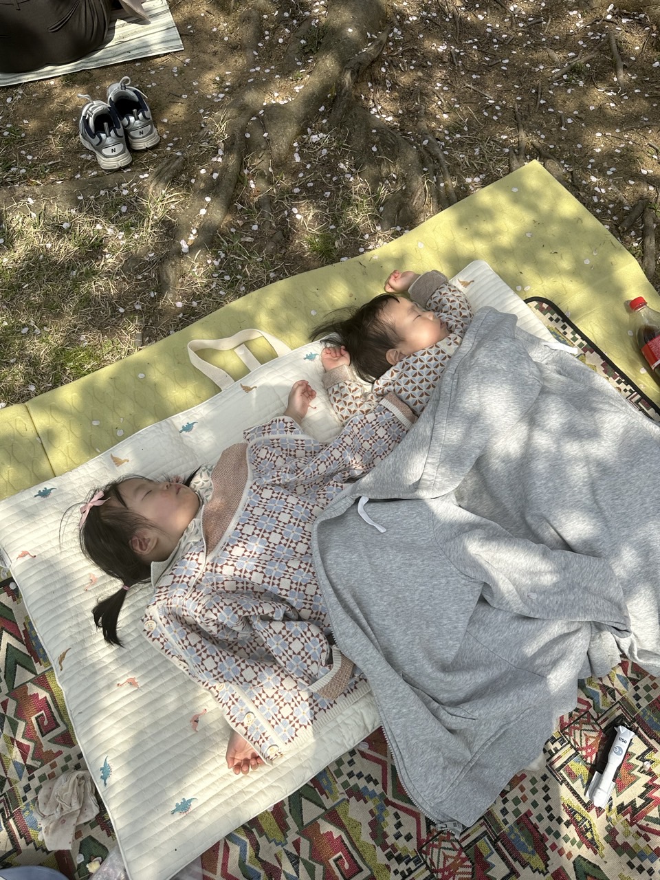 신나게 놀고 점심 먹고, 둥이들은 시끄러운 벚꽃 인파 속에서 1시간 반동안 잠들어버렸다. 나도 같이 잠들었고 봄날에 야외에서의 낮잠은 정말 맛있다.