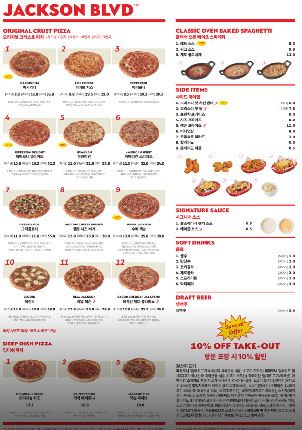 24년 4월 기준 잭슨피자 메뉴판이다. 방문 포장 시 10% 할인이지만! 아이들을 두고 갈 순 없기에 추가로 배달비 내고 시켜 먹었다.