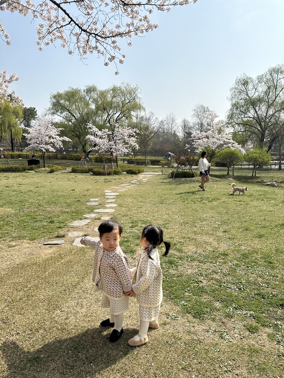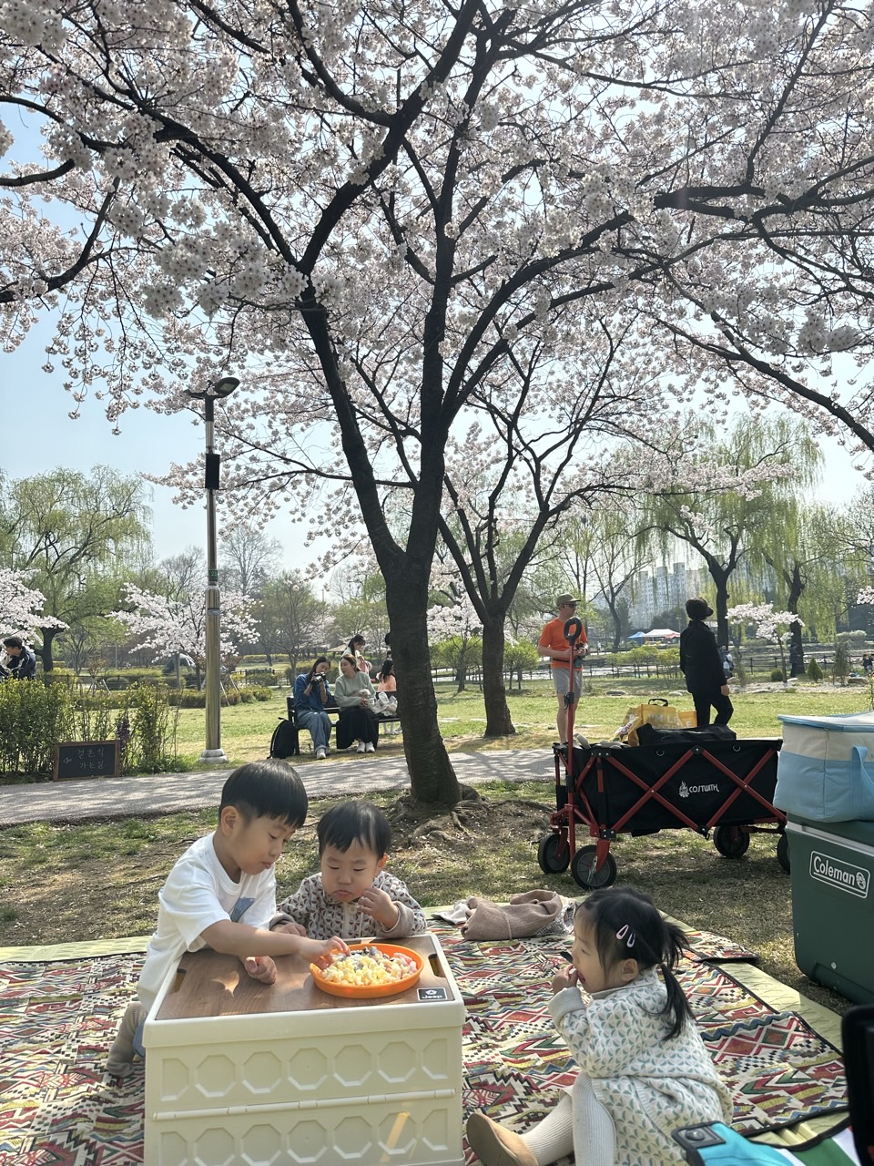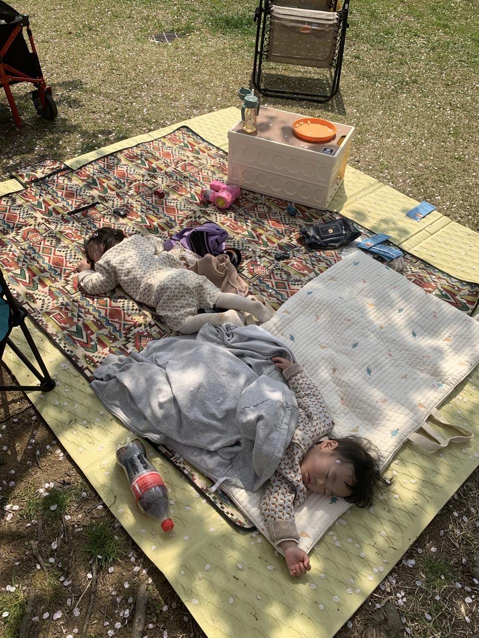 신나게 놀고 점심 먹고, 둥이들은 시끄러운 벚꽃 인파 속에서 1시간 반동안 잠들어버렸다. 나도 같이 잠들었고 봄날에 야외에서의 낮잠은 정말 맛있다.