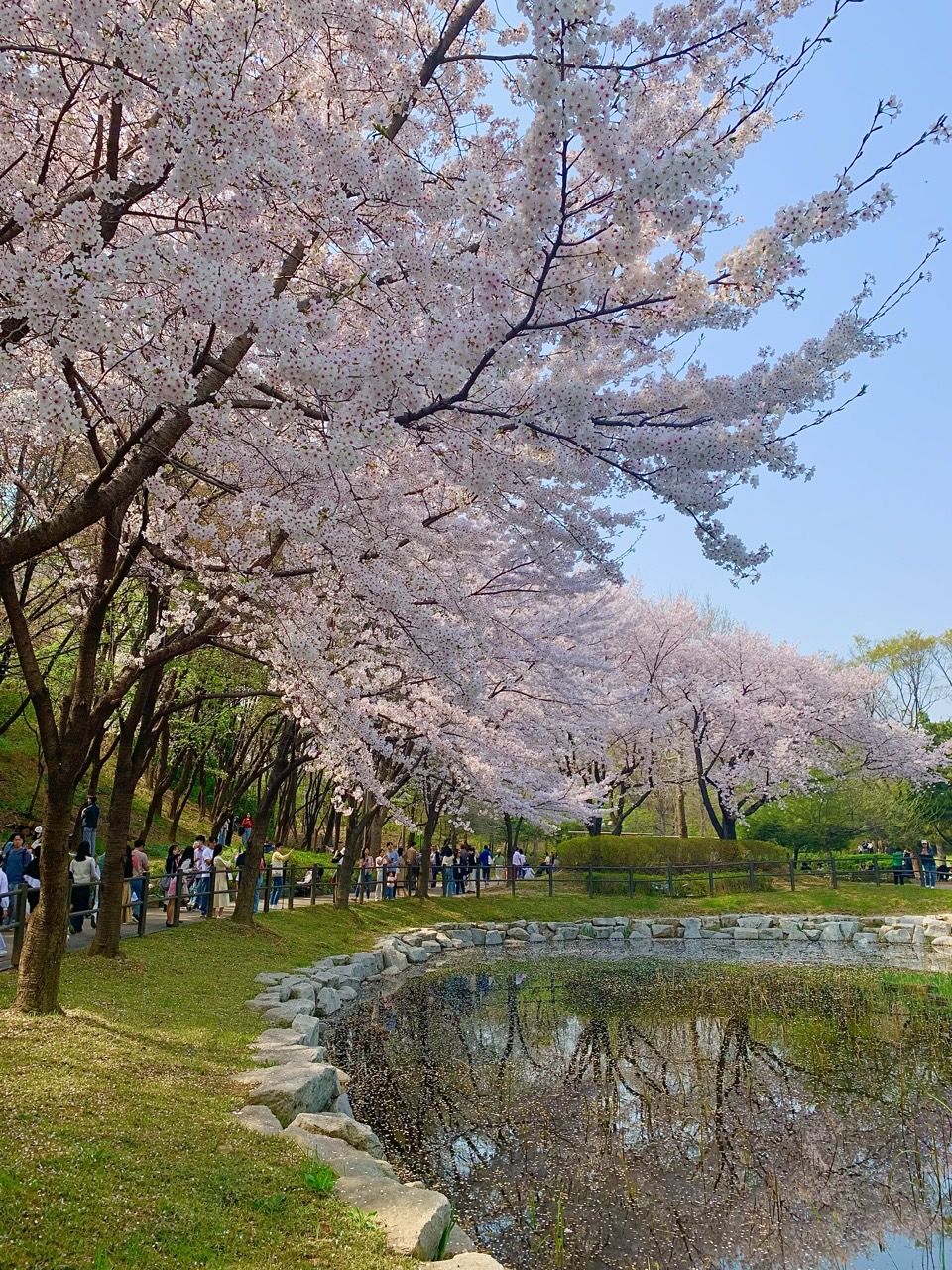 호수와 만개된 벚꽃, 크지 않은 규모라 공원 안에서 여유 있게 모든 공간을 감상할 수 있다.