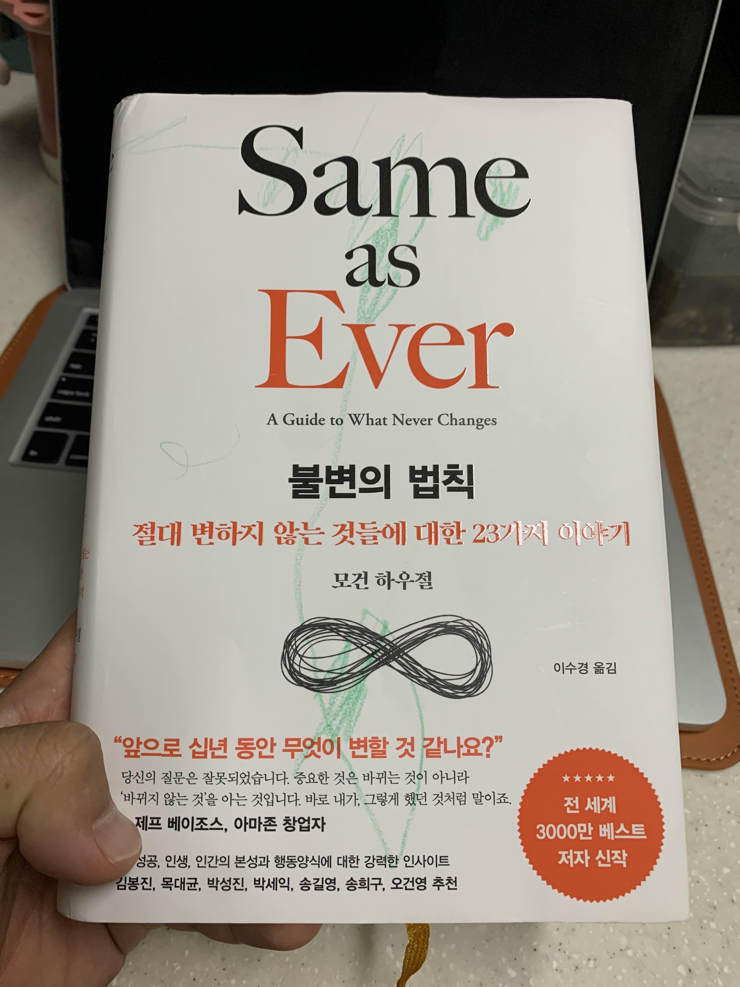 돈의 심리학을 재미있게 읽고 지내던 어느 날, 동일 저자의 책을 찾게 되어 바로 읽었다. 시간이 갈수록 계속해서 빠르게 변해가는 세상 속에서 절대 변하지 않는 불변의 법칙들에 대하여 23가지 이야기를 소개해준다. 책을 읽고 나니 나뿐만 아니라 대부분의 사람들이 과거나 지금이나 미래도 마찬가지로 어떤 선택을 해야 해야 하는지 알고 있지만, 결국엔 알고 있는 것에 대하여 선택을 못하고 여러 요인들로 인해 다른 선택을 하게 되는 경우가 발생한다. '나만 왜 이러지?'라고 생각했던 적도 있었지만, 대다수 사람들이 그렇다니 위안이 됐고, 책을 읽음으로써 좀 마음의 평화를 찾게 되었고, 기존보다 흔들리지 않는 멘털을 갖게 되었다. 그리고 지금 힘든 순간이 결코 나쁜 징조가 아니라 미래에 대하여 발전할 수 있는 긍정적인 시그널이라는 큰 힘을 얻게 되었다. 앞으로 옳은 선택만 하기를...